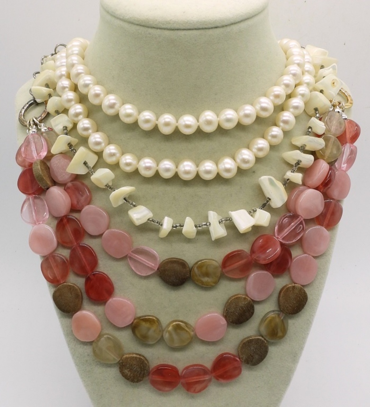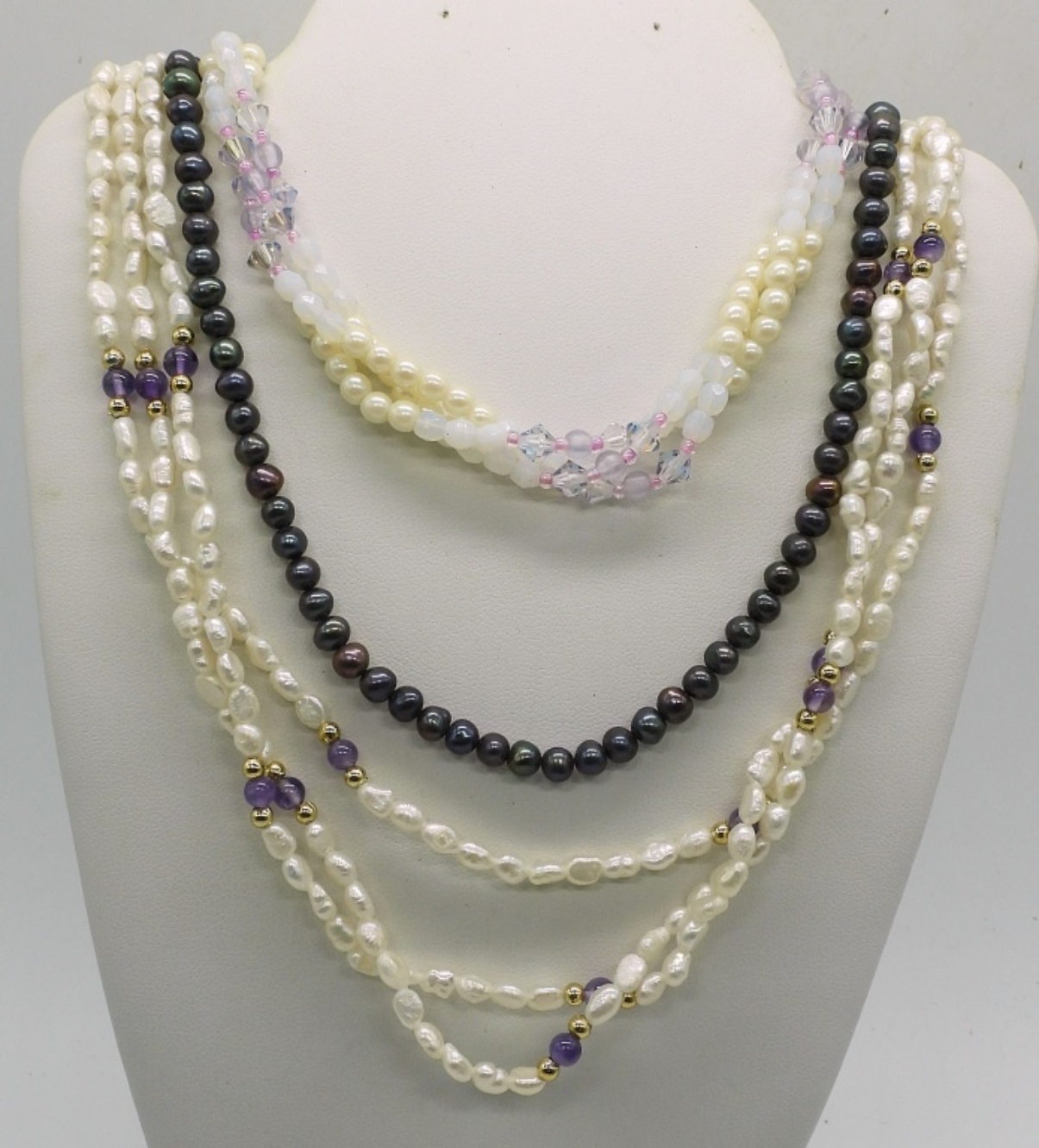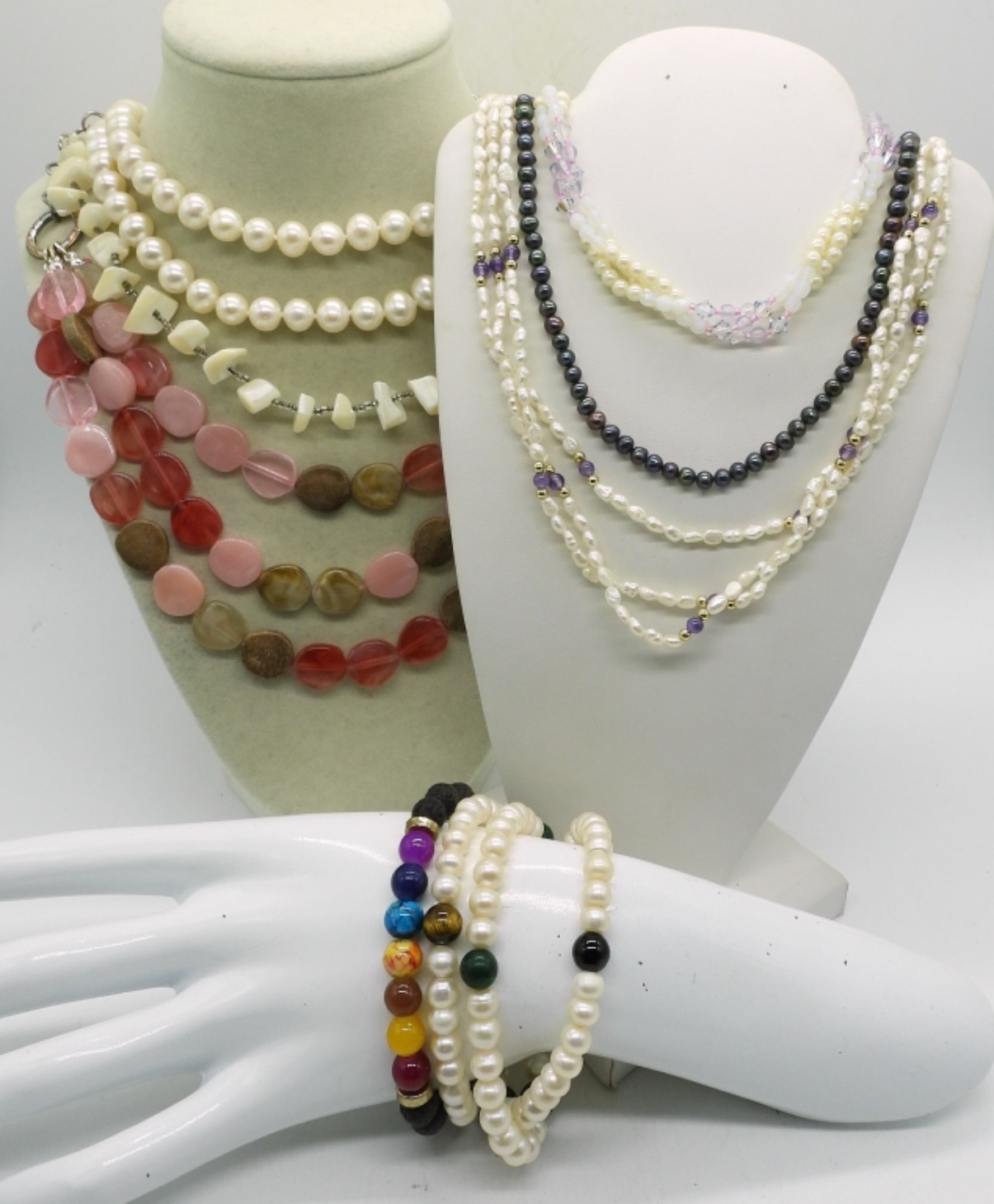 SIX NECKLACES, WHITE PEARLS, DARK PEARLS, BEADED &CRYSTALS. 18-34″. FOUR STRETCHY BRACELETS WITH PEARLS, GEMSTONES & LAVA BEADS.