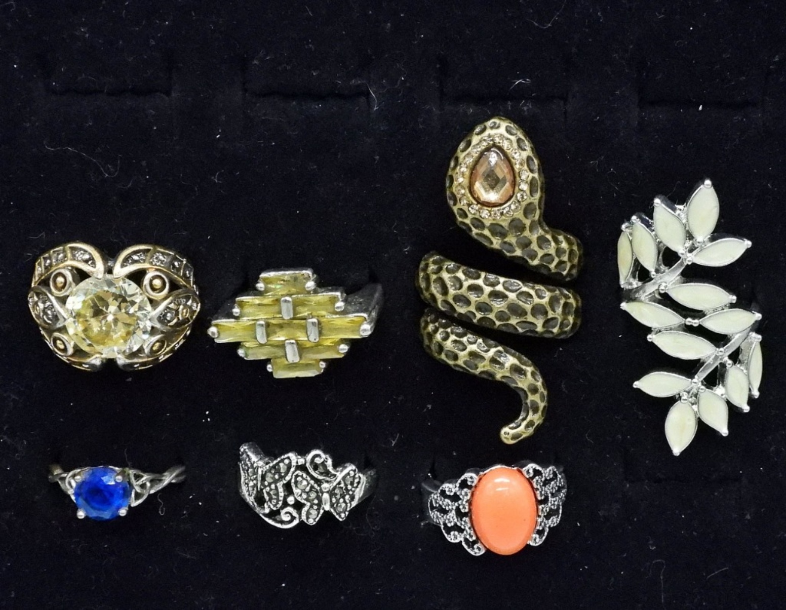 SEVEN FASHION RINGS, SILVER TONE & GOLD TONE. GEMSTONES. SIZES 7.5-9