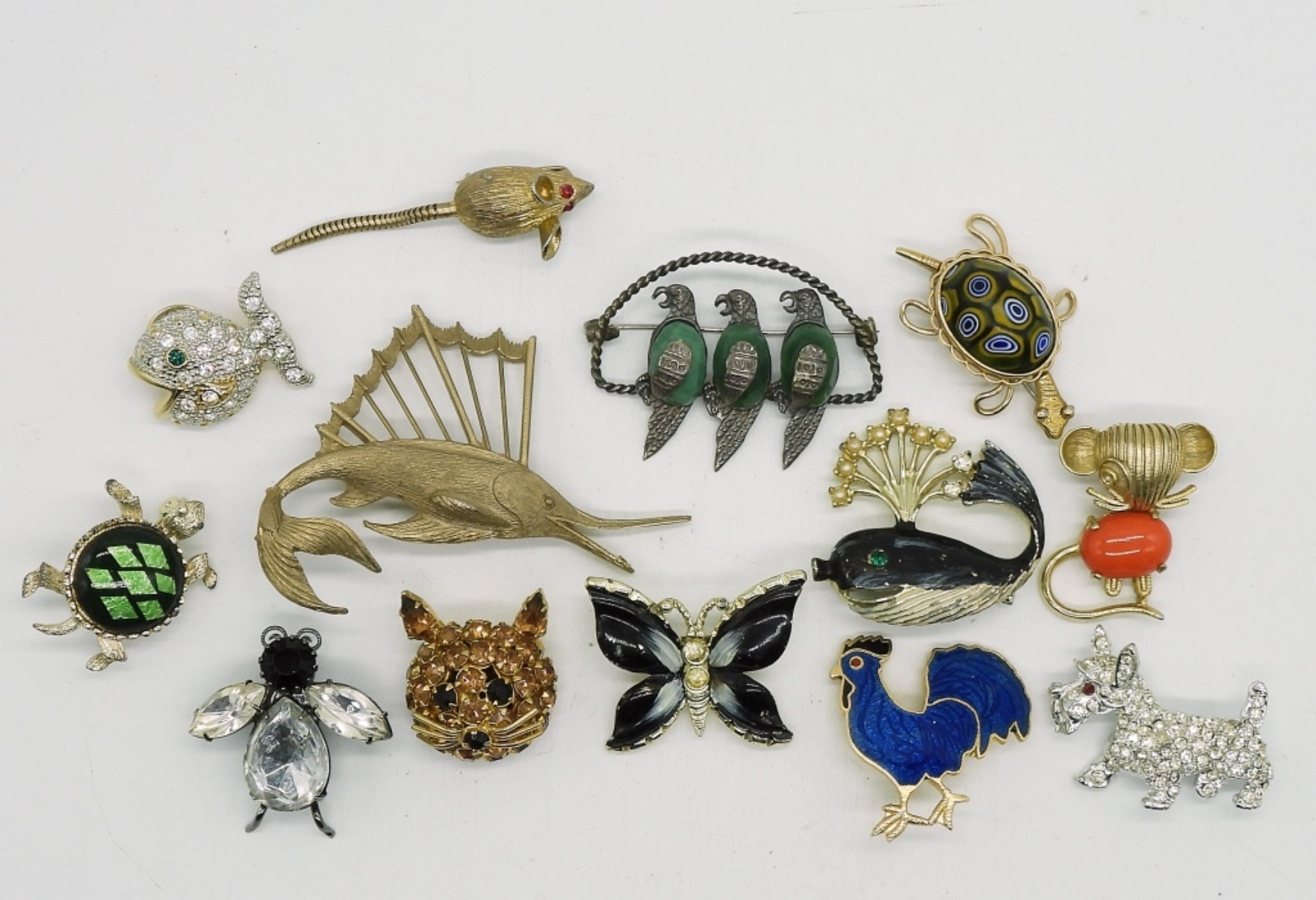 THIRTEEN VINTAGE GOLD AND SILVER TONED ANIMAL BROOCHES.
