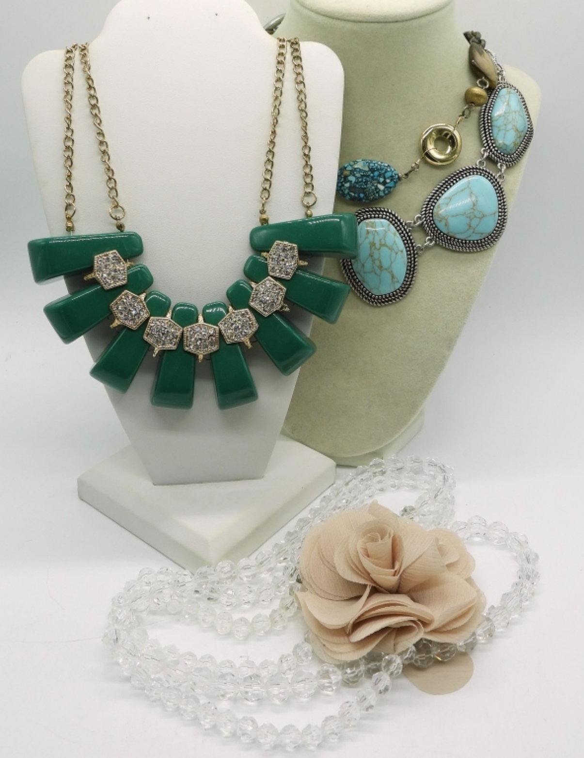 FOUR VINTAGE CHUNKY FASHION NECKLACES. 20″, 29″ & 30″.
