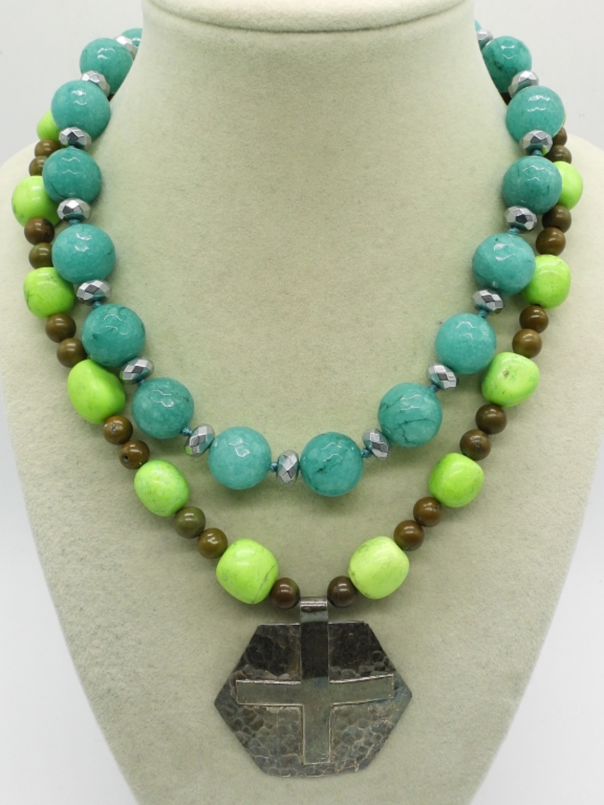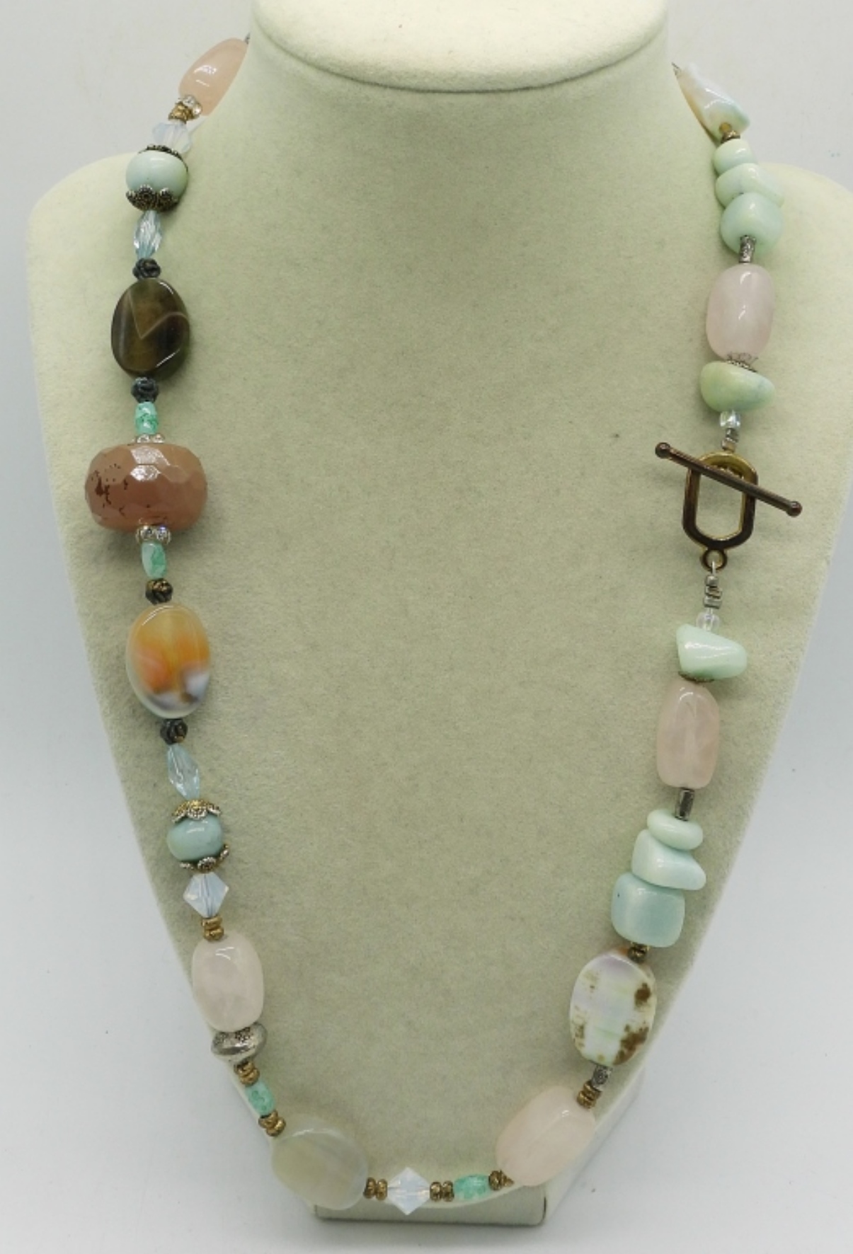 FIVE NECKLACES, PERIDOT, MOONSTONE, AND OTHER NATURAL GEMSTONES. BEADED FUN FASHION NECKLACES. 17″, 18″, 21″, 24″.