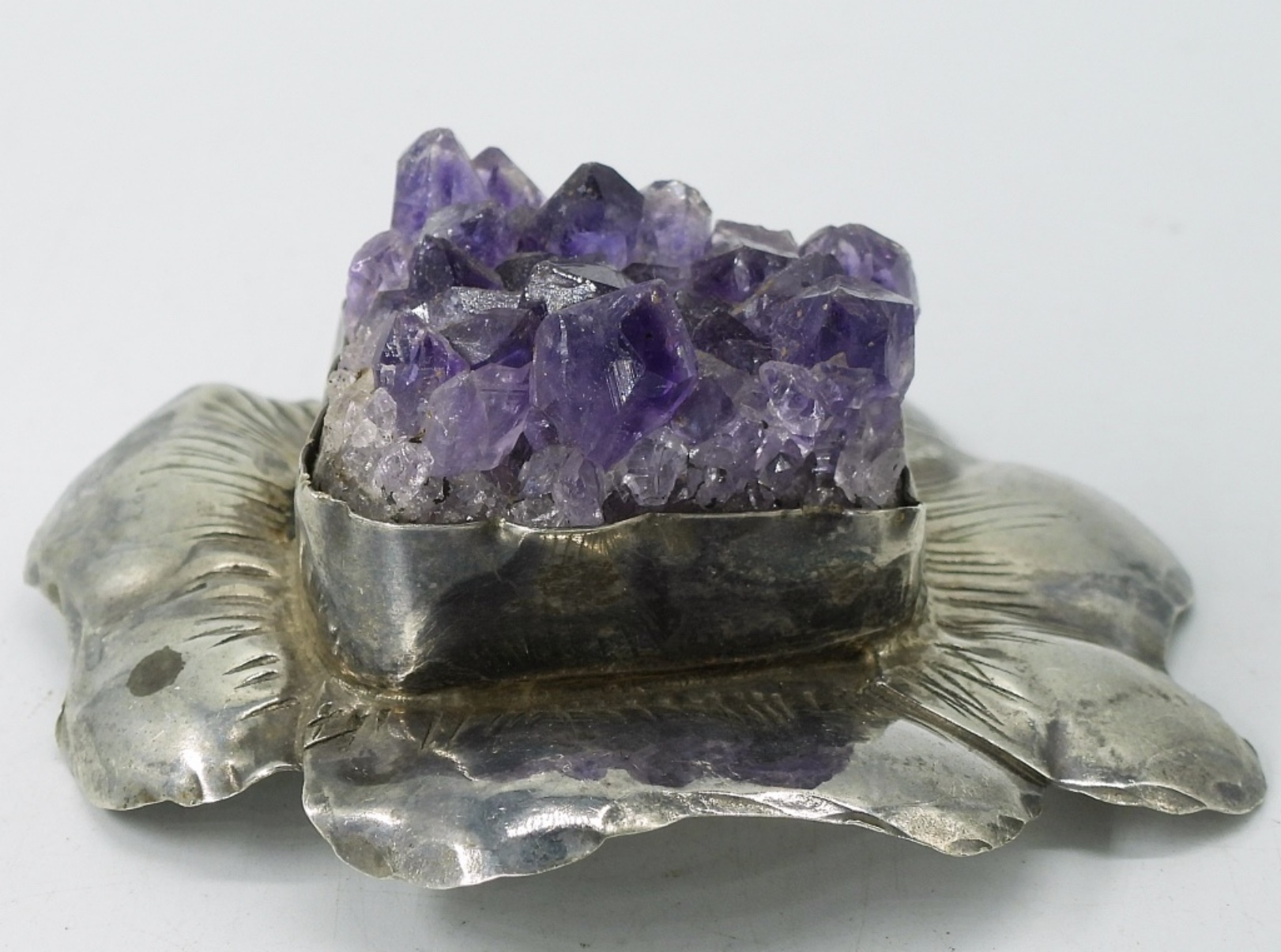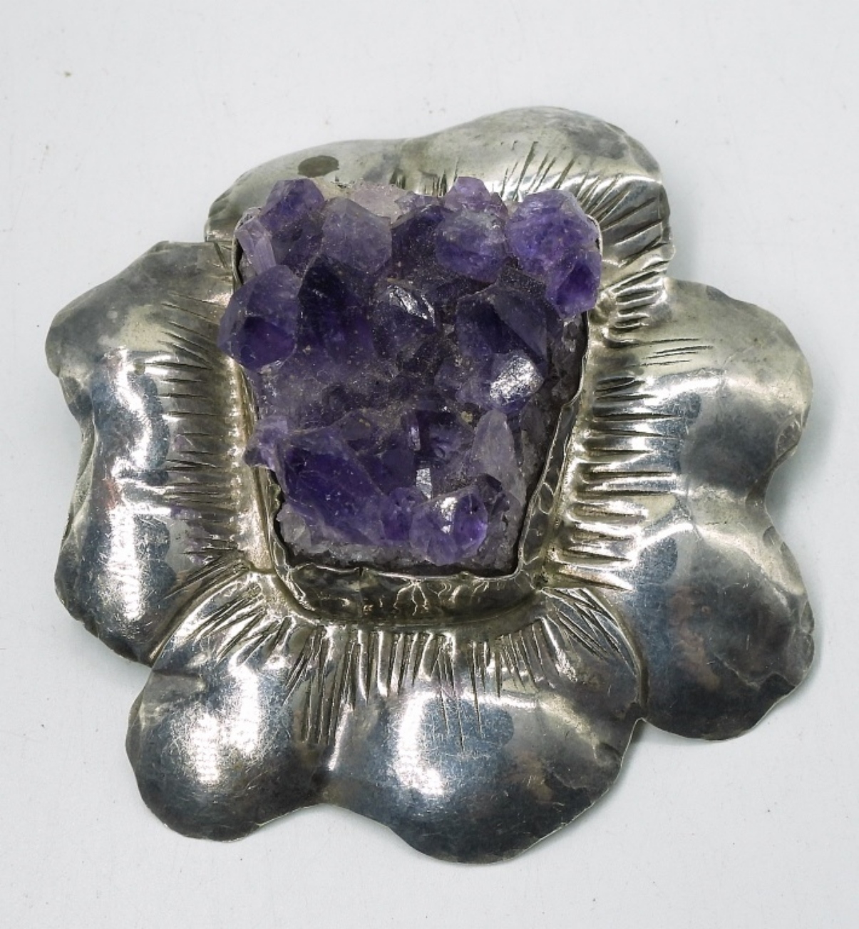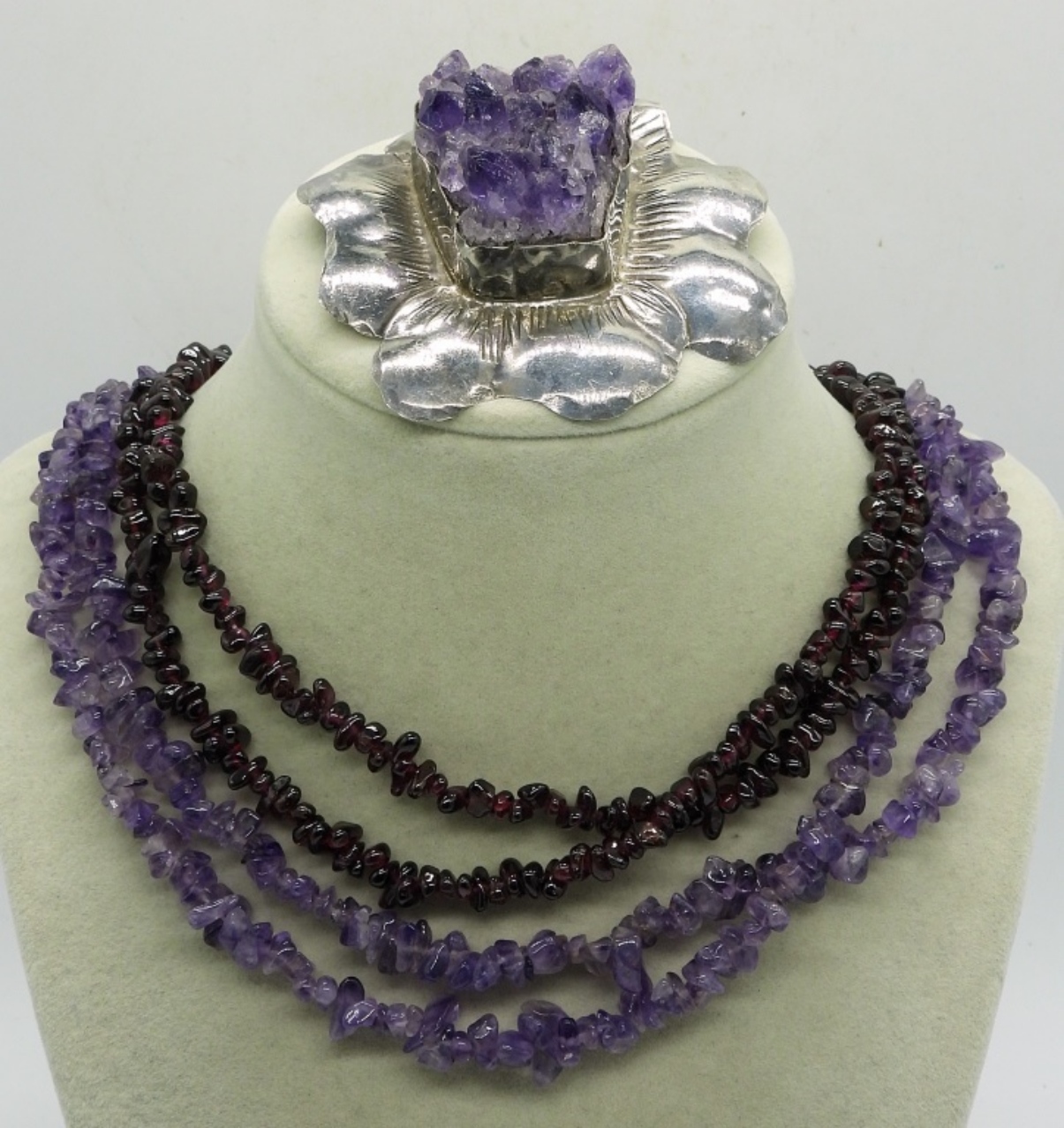 LARGE FLOWER PENDANT WITH A GIANT CHUNK OF NATURAL AMETHYST! 2.5″ WIDE PENDANT, AMETHYST MEASURES 1×1″ & .5″ TALL. AMETHYST & GARNET GEMSTONE CHIP STRANDS, 32″.