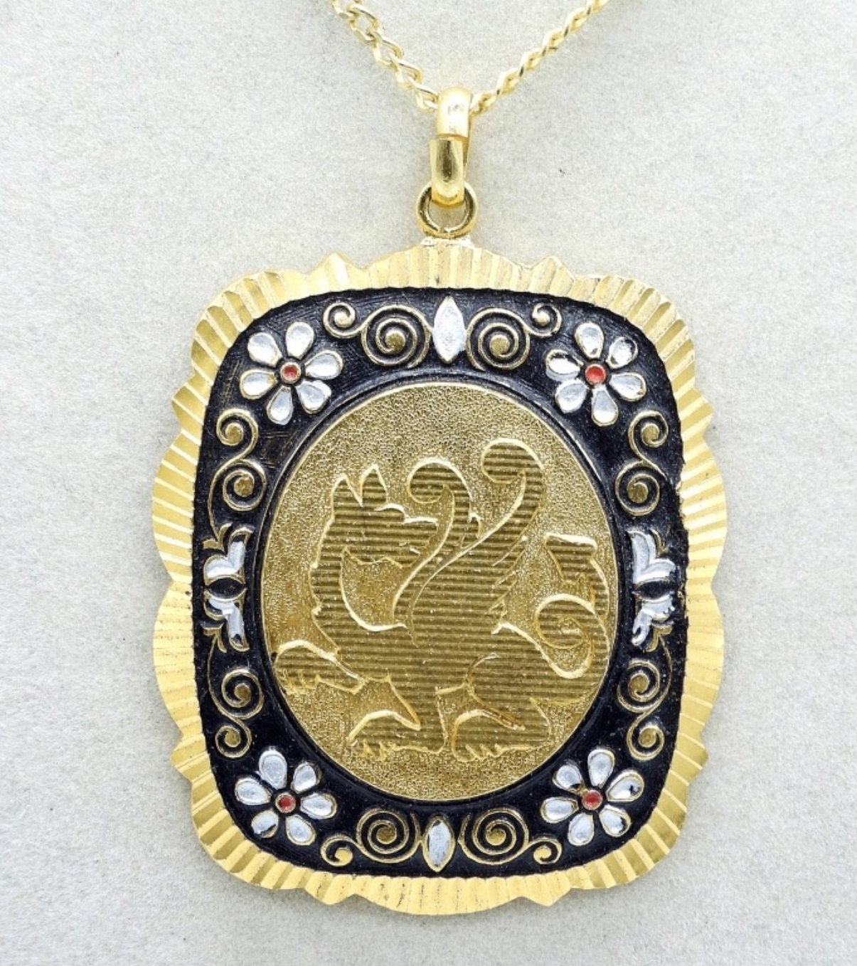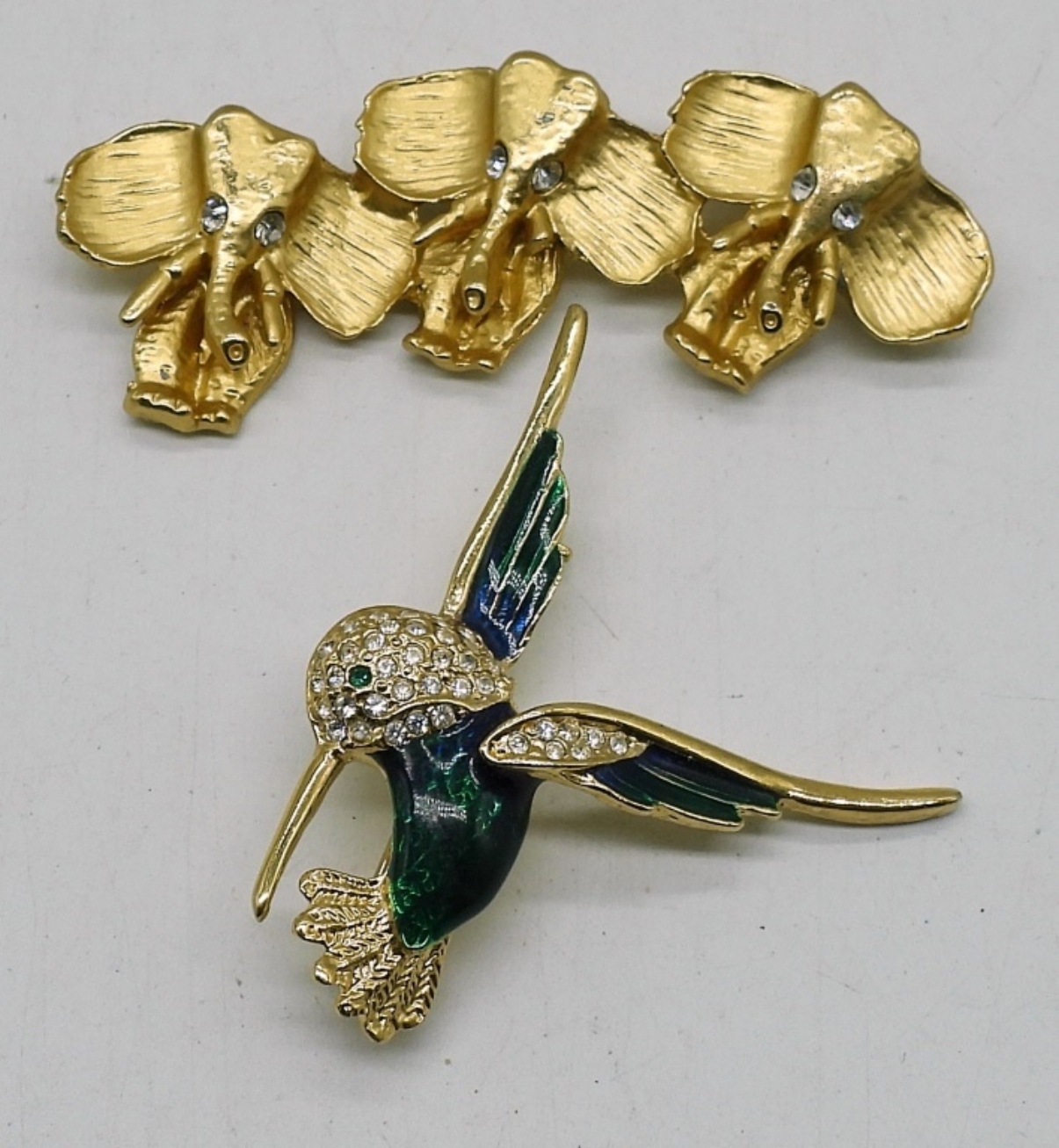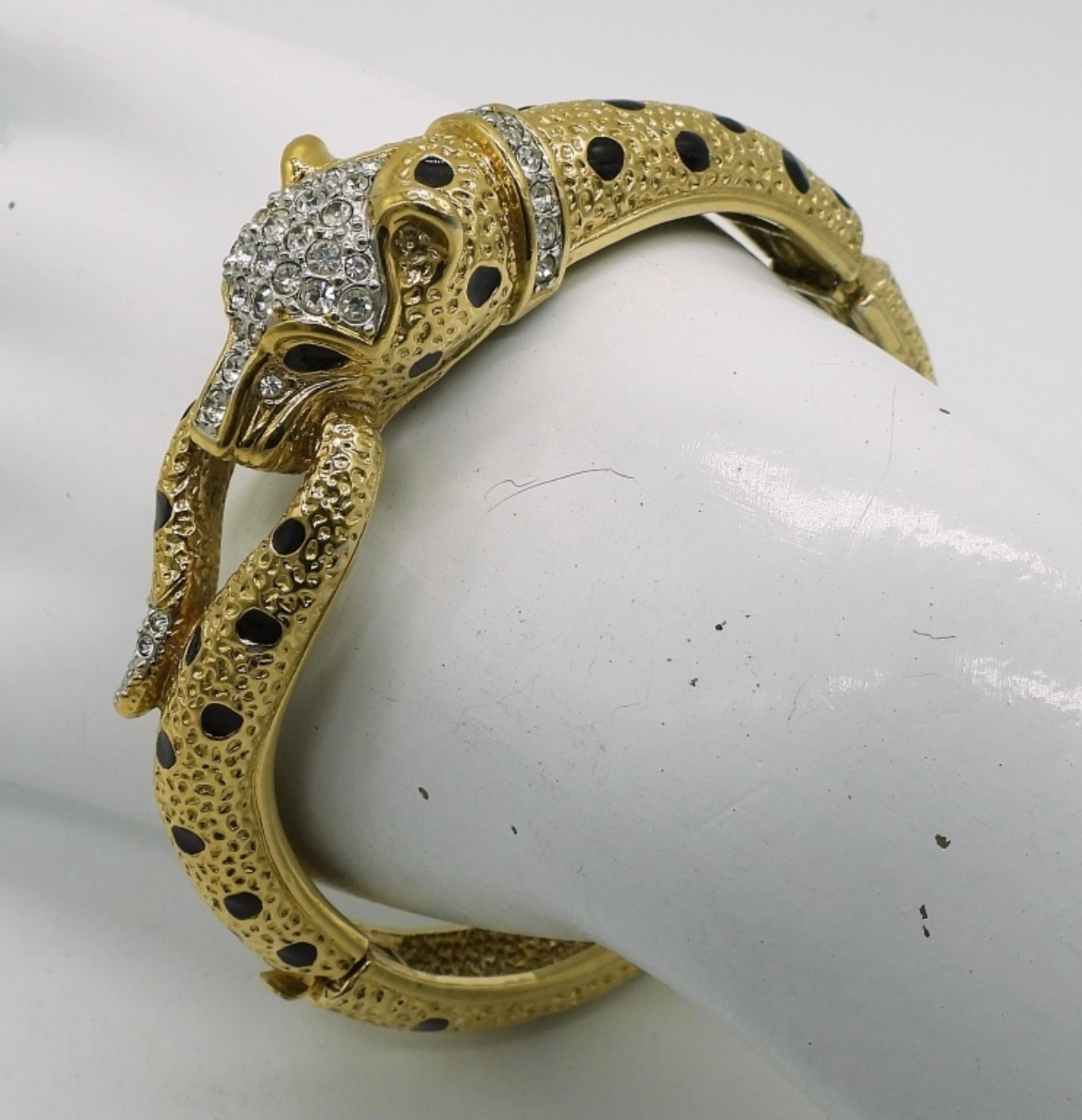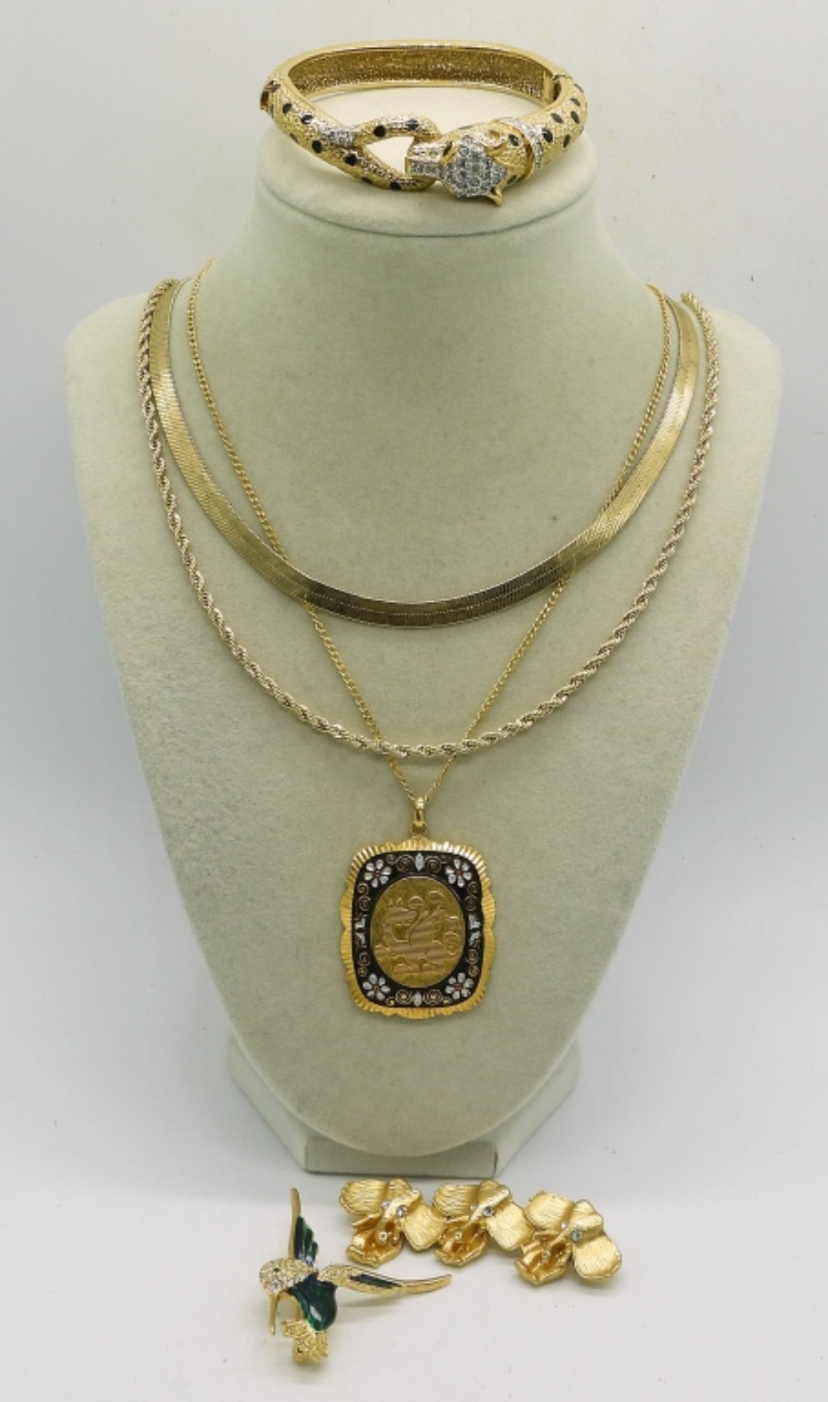 3 GOLD TONE NECKLACES, 17″, 20″, 30″. JAGUAR GOLD TONE BANGLE HINGED BRACELET, 7″. TWO BROOCHES, 2 & 2.5″.