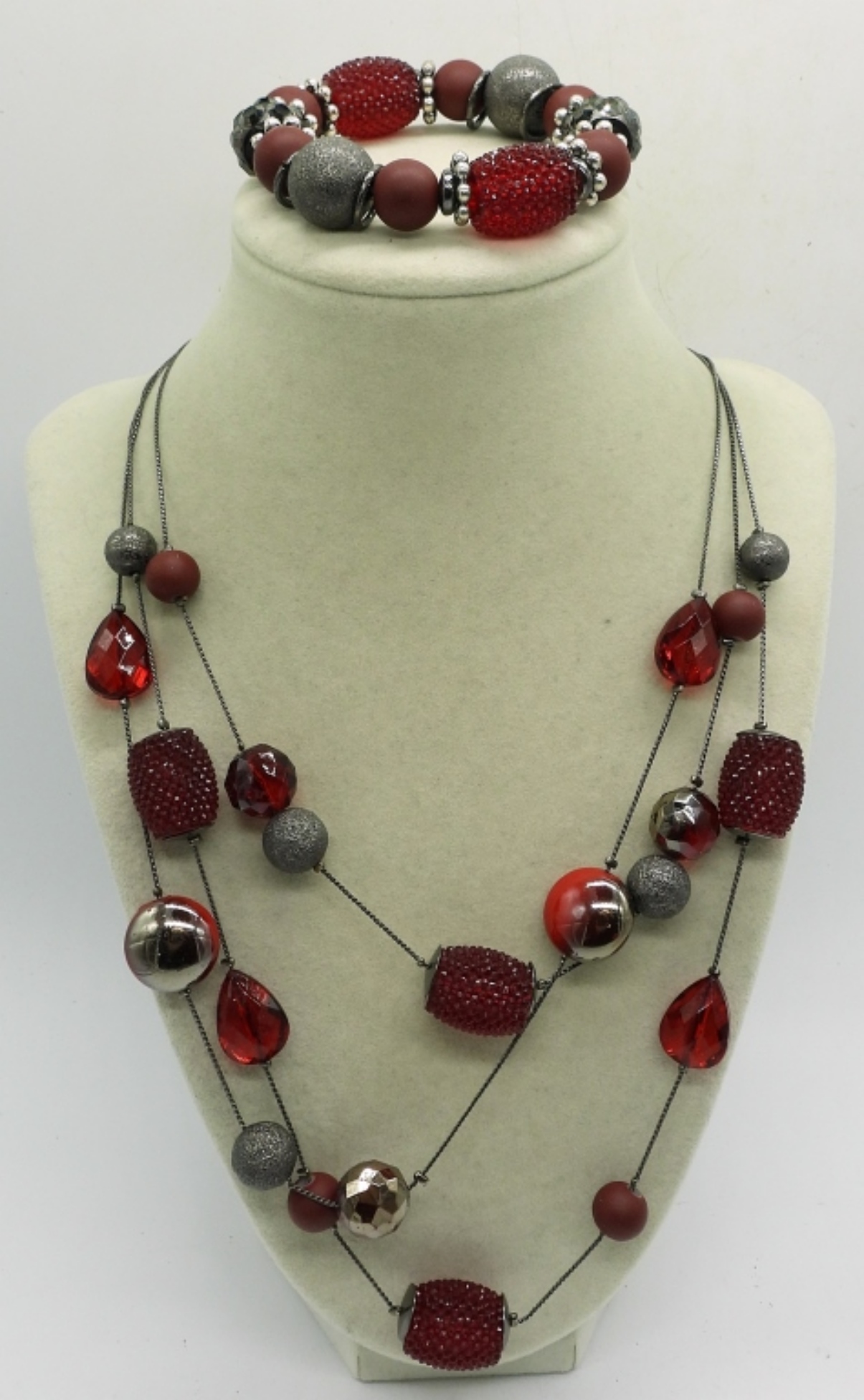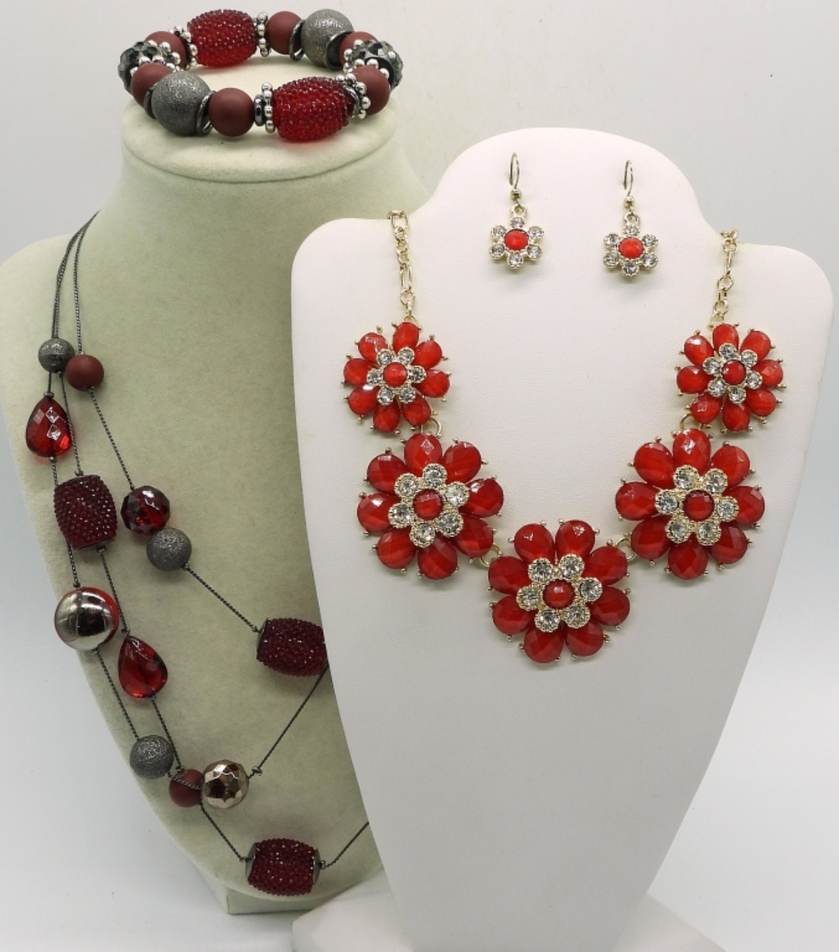 VTG GOLD TONE RED FLOWER NECKLACE (21″) WITH MATCHING PIERCED EARRINGS. RED BEADED 21″ NECKLACE WITH MATCHING STRETCHY BRACELET.