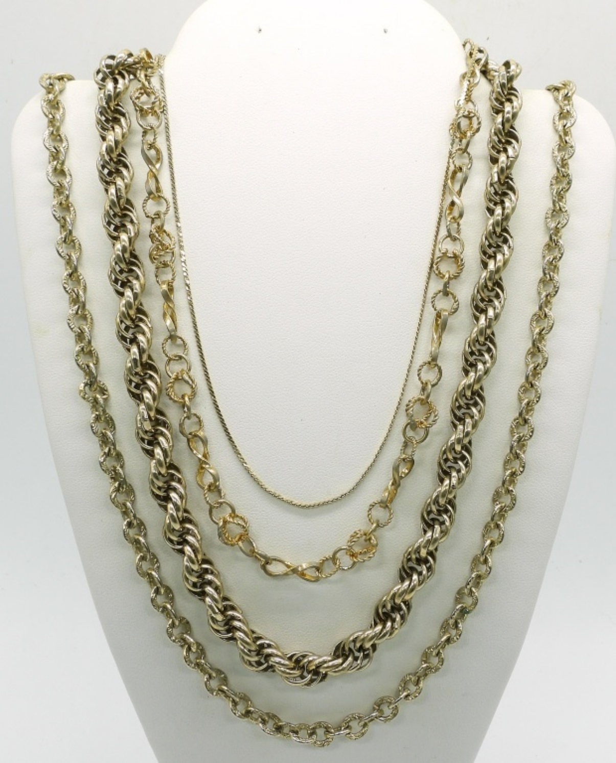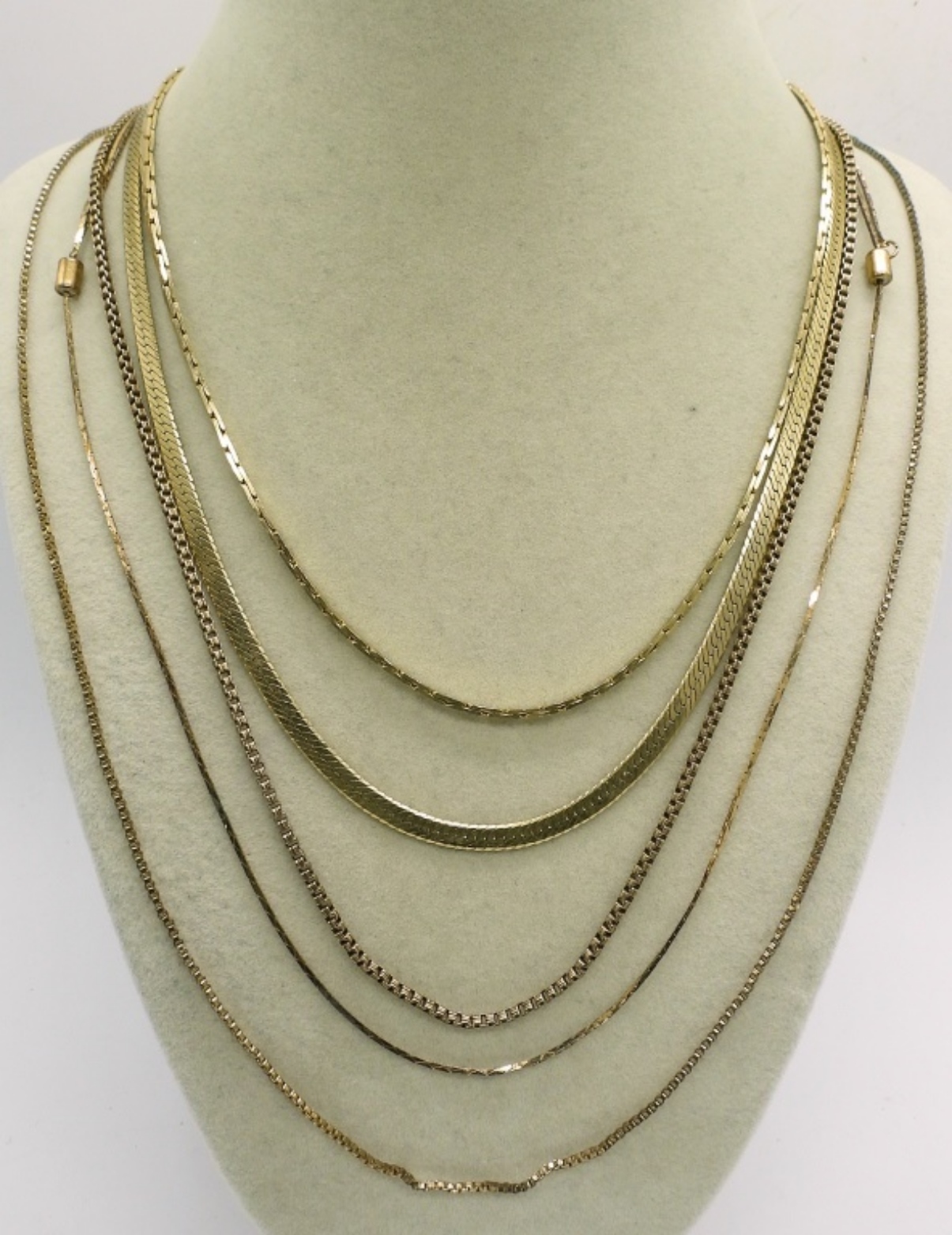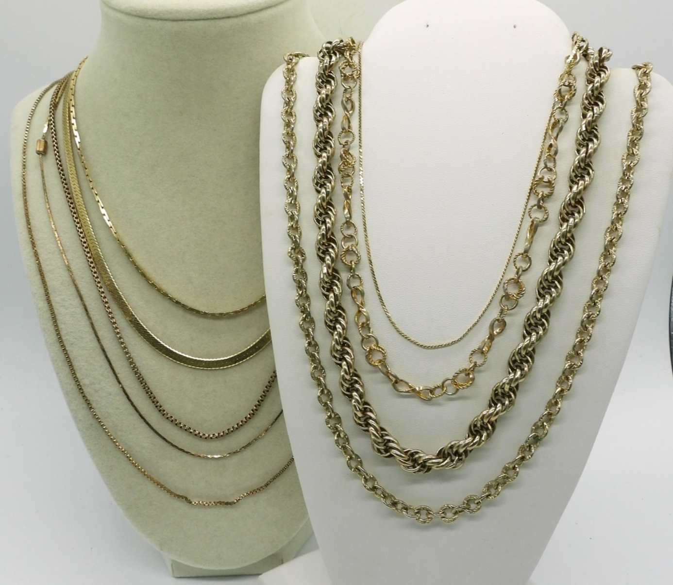 NINE VINTAGE GOLD TONE CHAINS, 17″ – 28″.