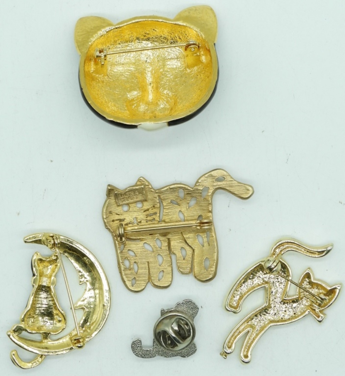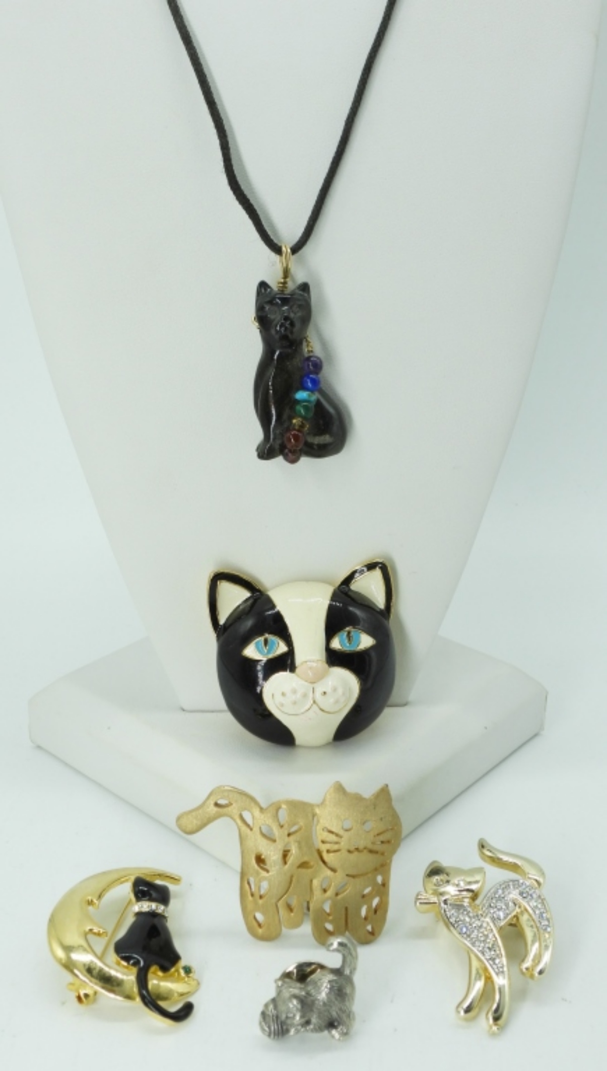 5 GOLD AND SILVER TONE CAT PINS AND ONE CARVED GEMSTONE CAT PENDANT ON A BLACK CHORD.