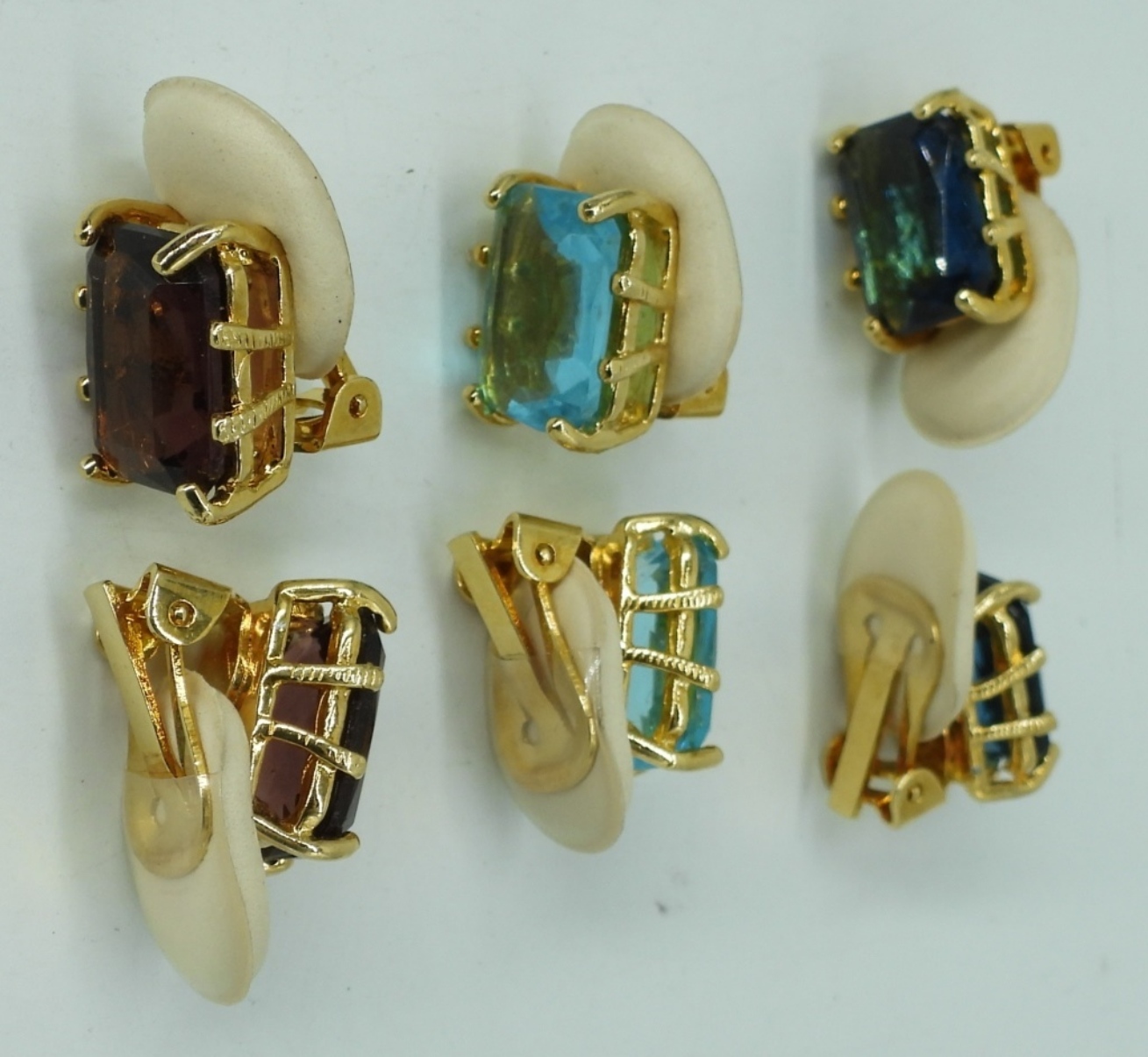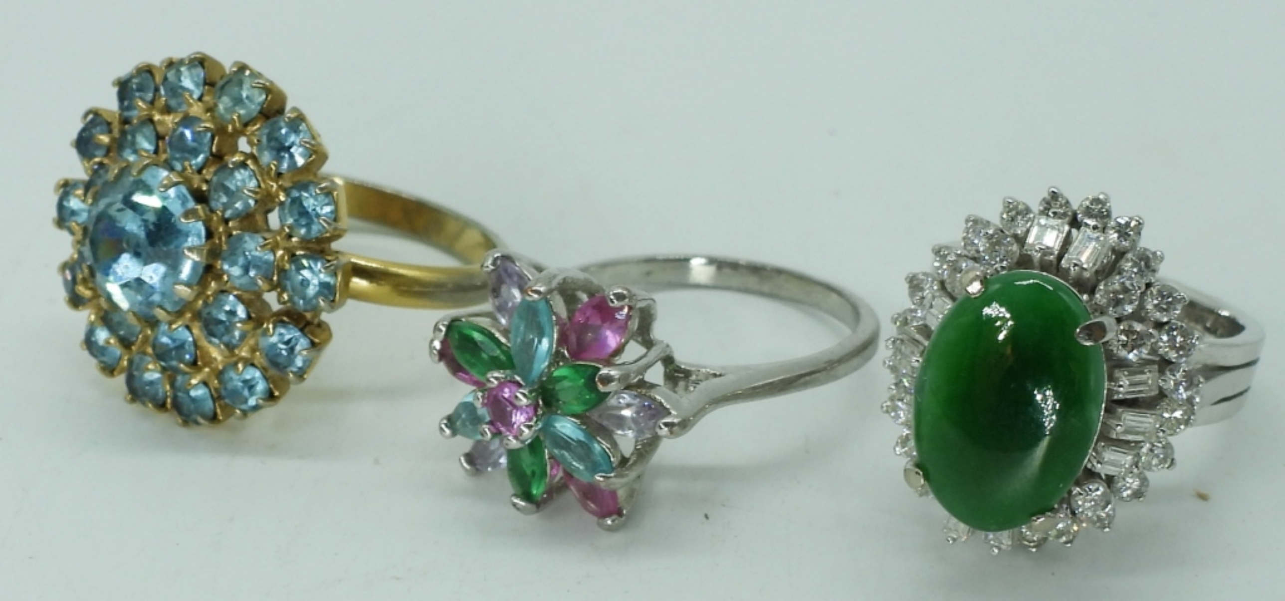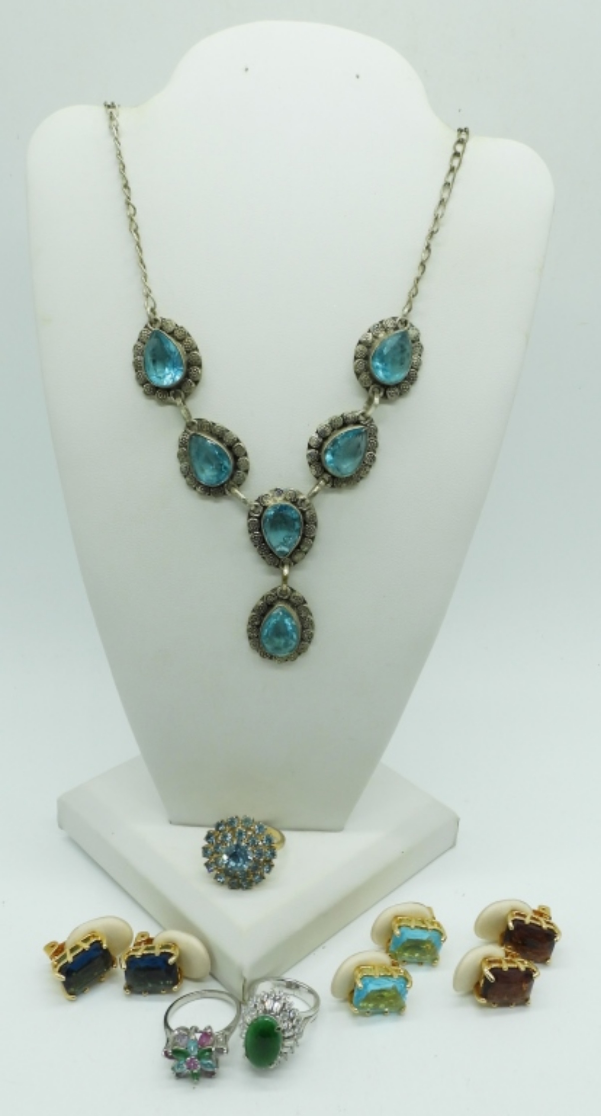 3 PAIR OF GOLD TONE CLIP ON EARRINGS WITH BEAUTIFUL GEMSTONES. 3 PRETTY SILVER AND GOLD TONE RINGS WITH COLORFUL GEMSTONES, SIZES 5 & 7. SILVER TONE NECKLACE WITH PRETTY BLUE GEMSTONES, 20″.
