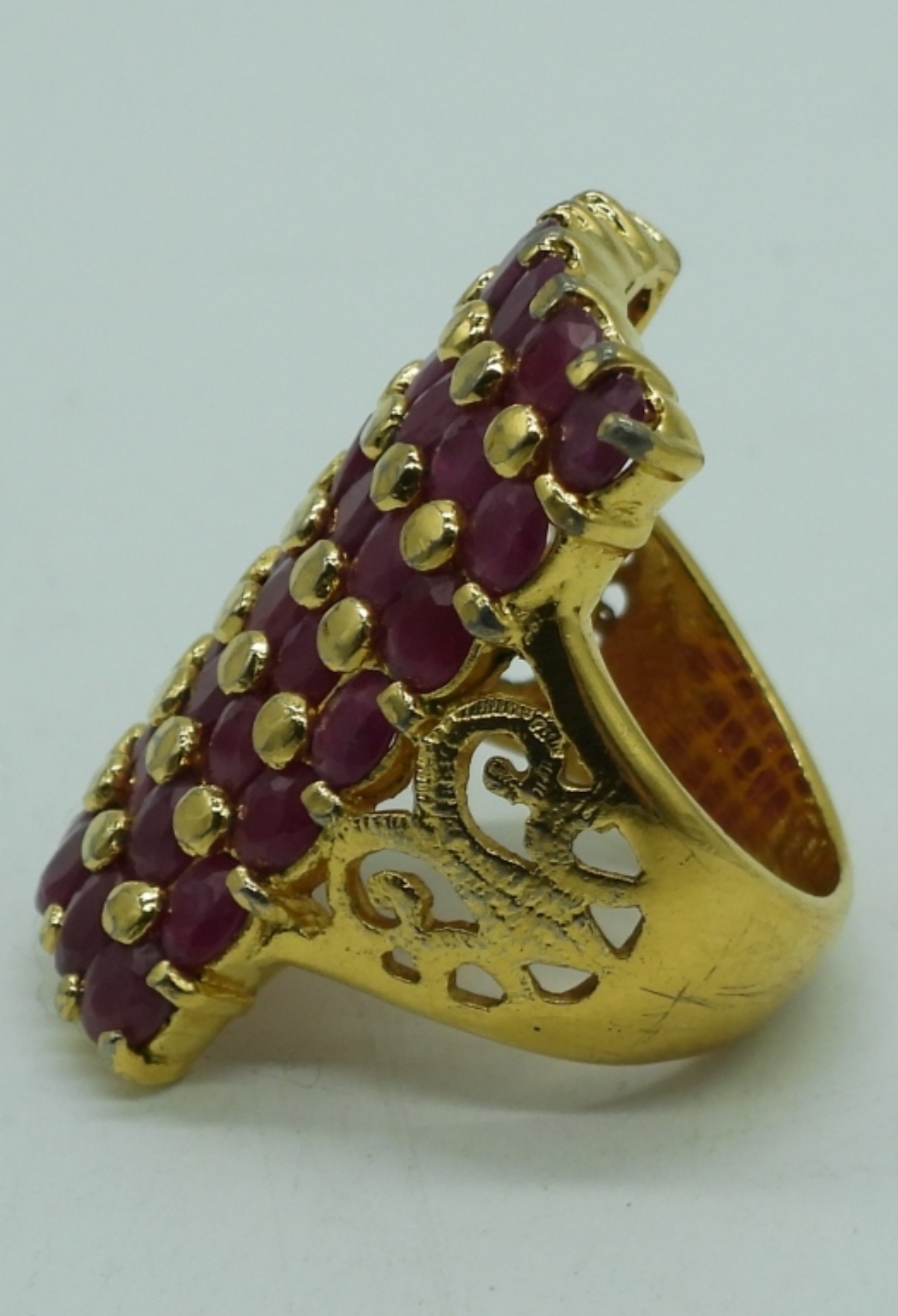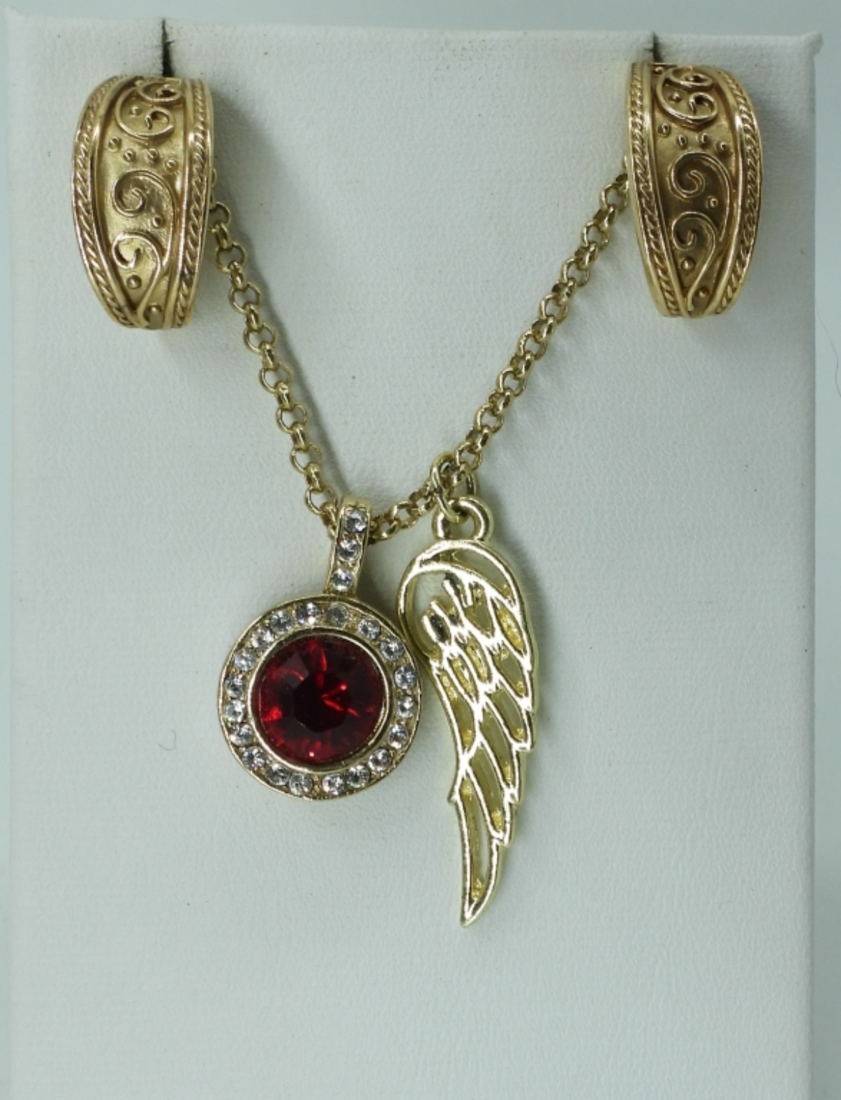 GOLD TONE NECKLACE WITH RED GEMSTONE PENDANT & WING PENDANT, 17″. GOLD TONE PIERCED HALF HOOP EARRINGS. GOLD TONE RING WITH RED GEMSTONES, SIZE 7.5