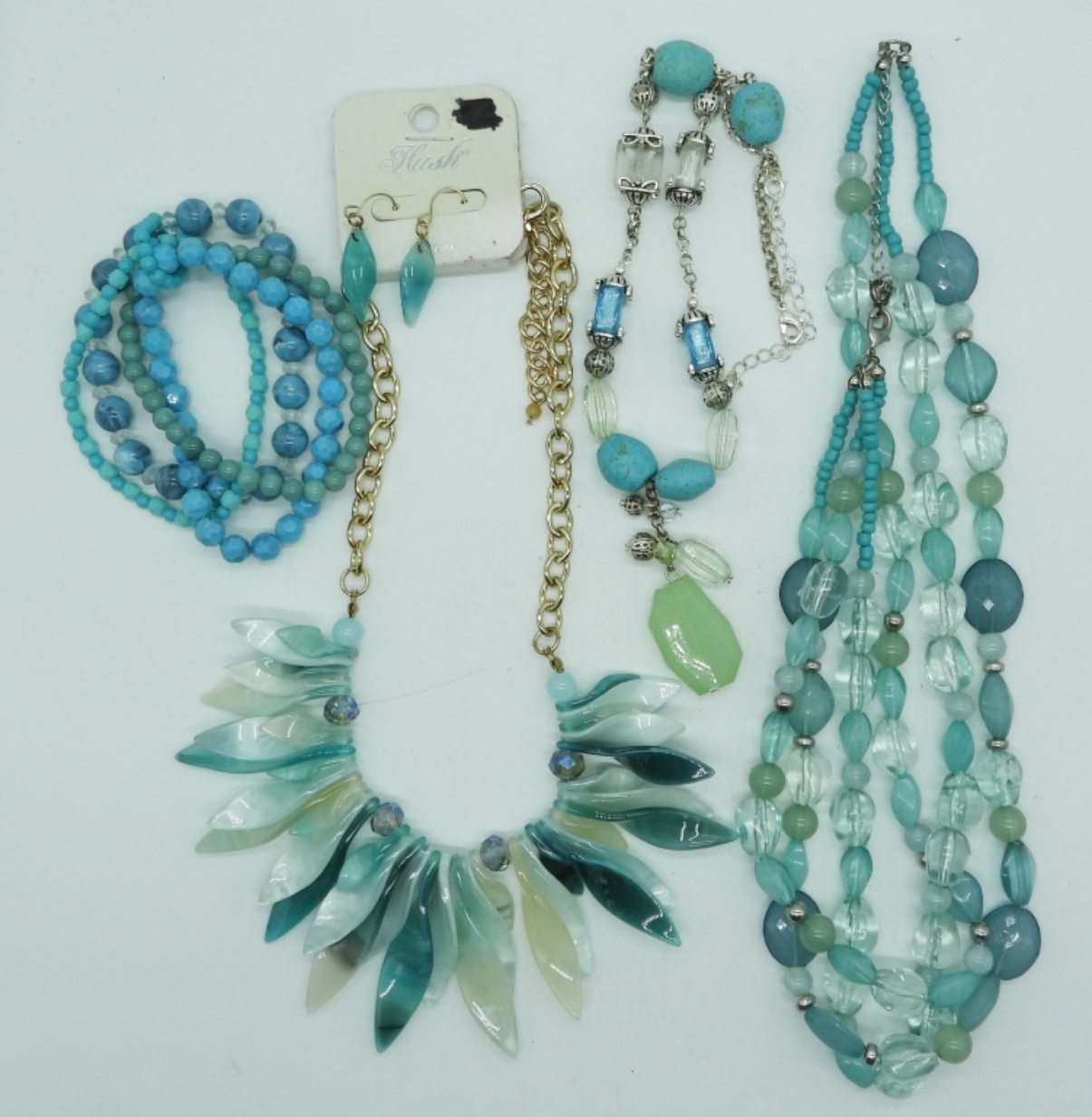 THREE BABY BLUE BEADED VINTAGE NECKLACES, 20″. ONE 4 STRAND STRETCHY BABY BLUE BEADED BRACELET, 7″.