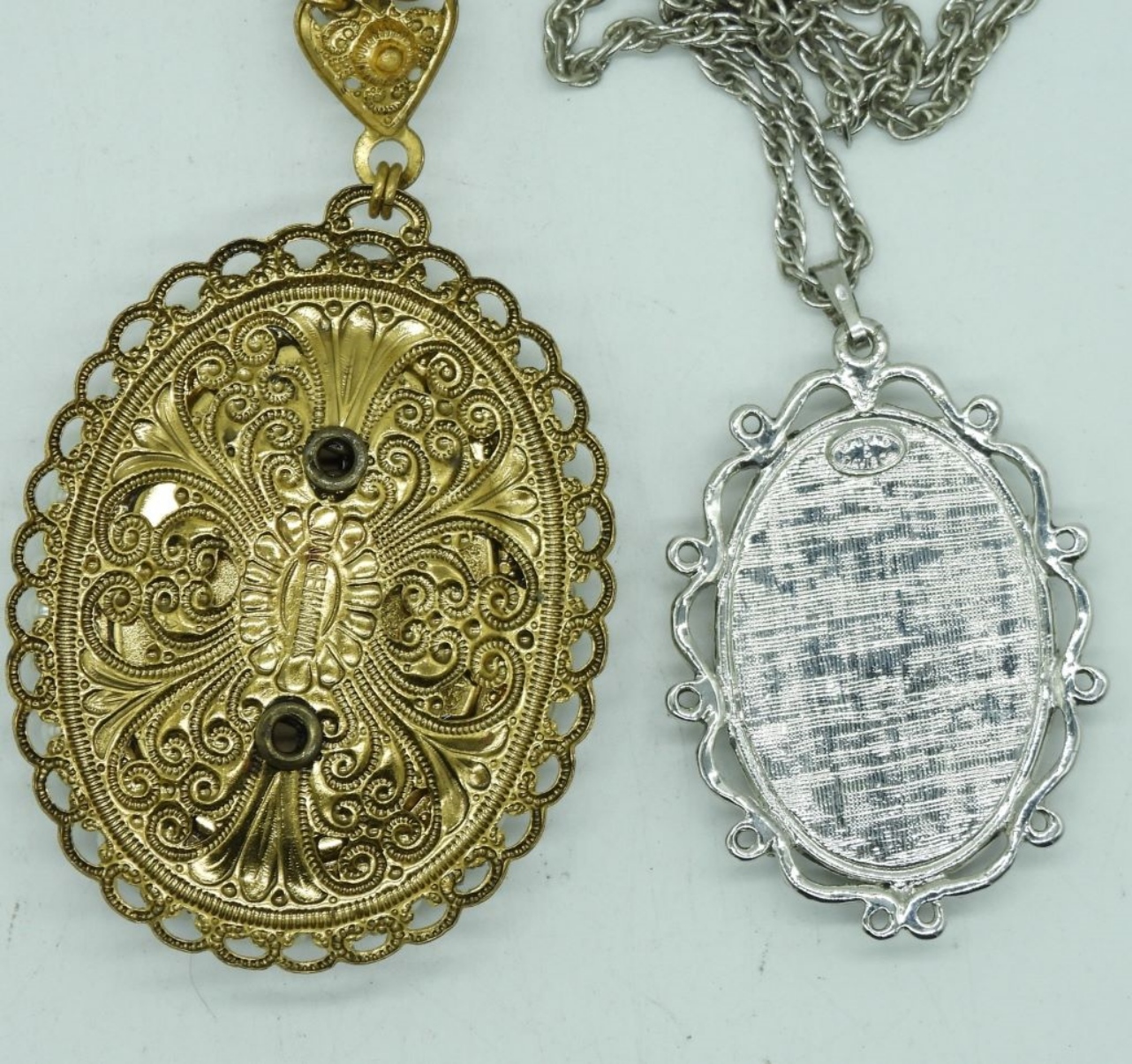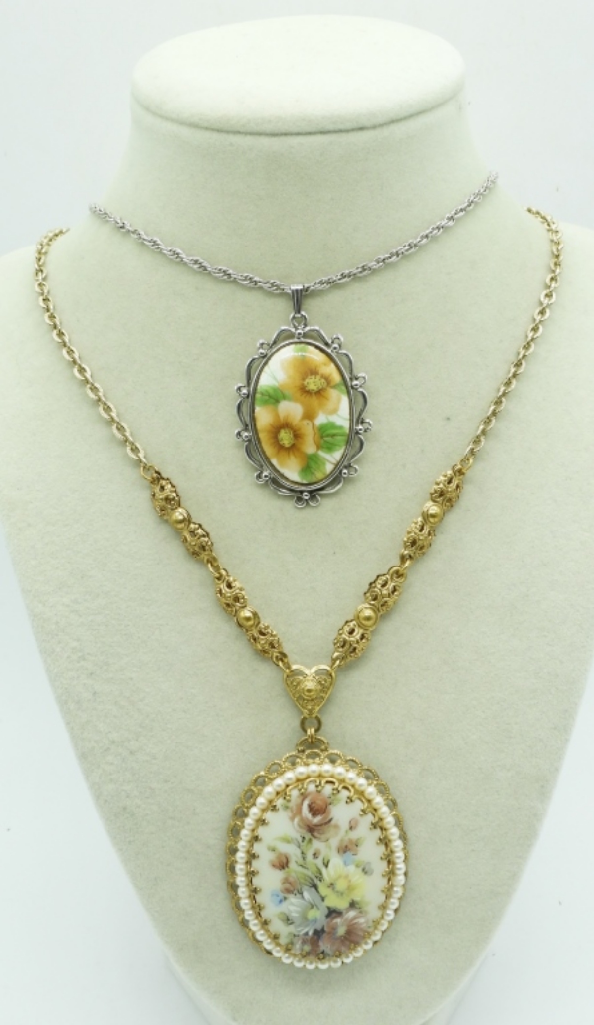 VINTAGE WEST GERMANY FLOWER FAUX PEARL FILIGREE PENDANT NECKLACE IN GOLD TONE, 24″. WHITING & DAVIS CO SILVER TONE NECKLACE WITH FLOWER PENDANT, 21″.