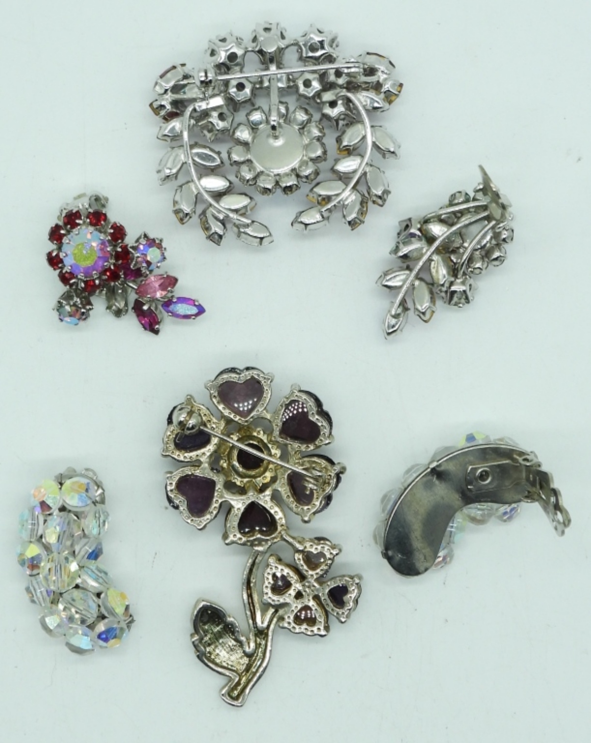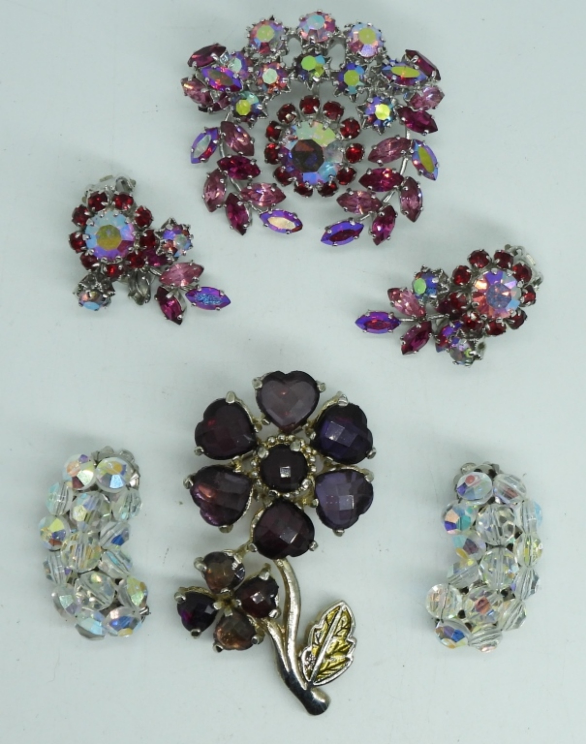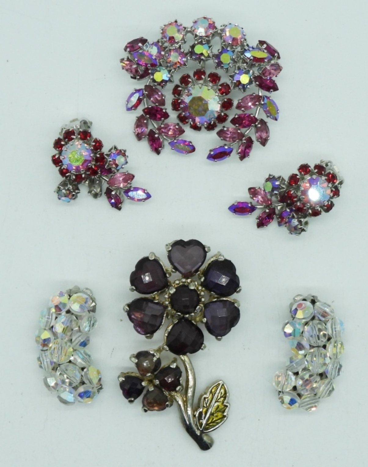 PINK RHINESTONE BROOCH WITH MATCHING CLIP ON EARRINGS. PURPLE FLORAL BROOCH, PRETTY BEADED VTG CLIP ON EARRINGS.