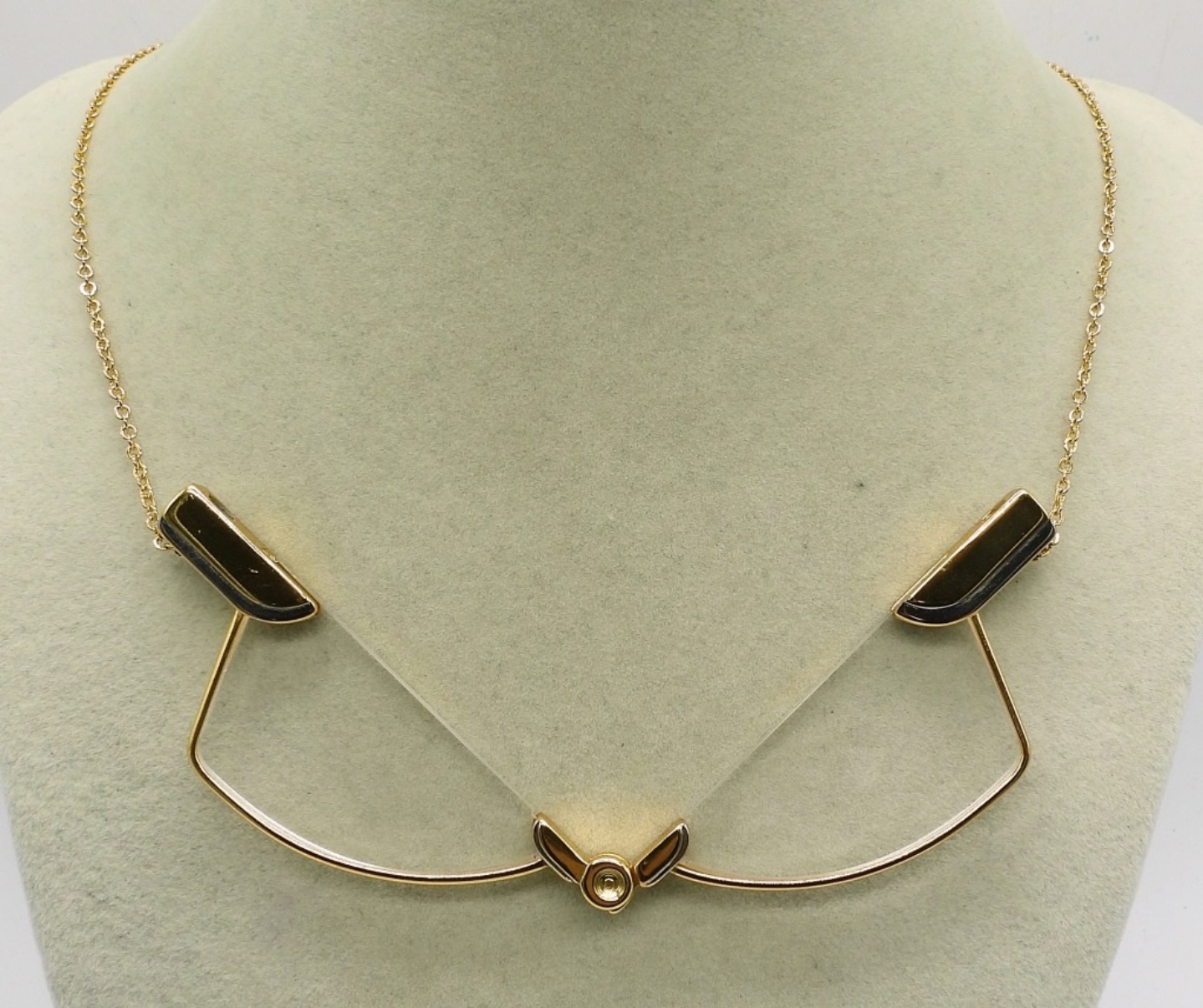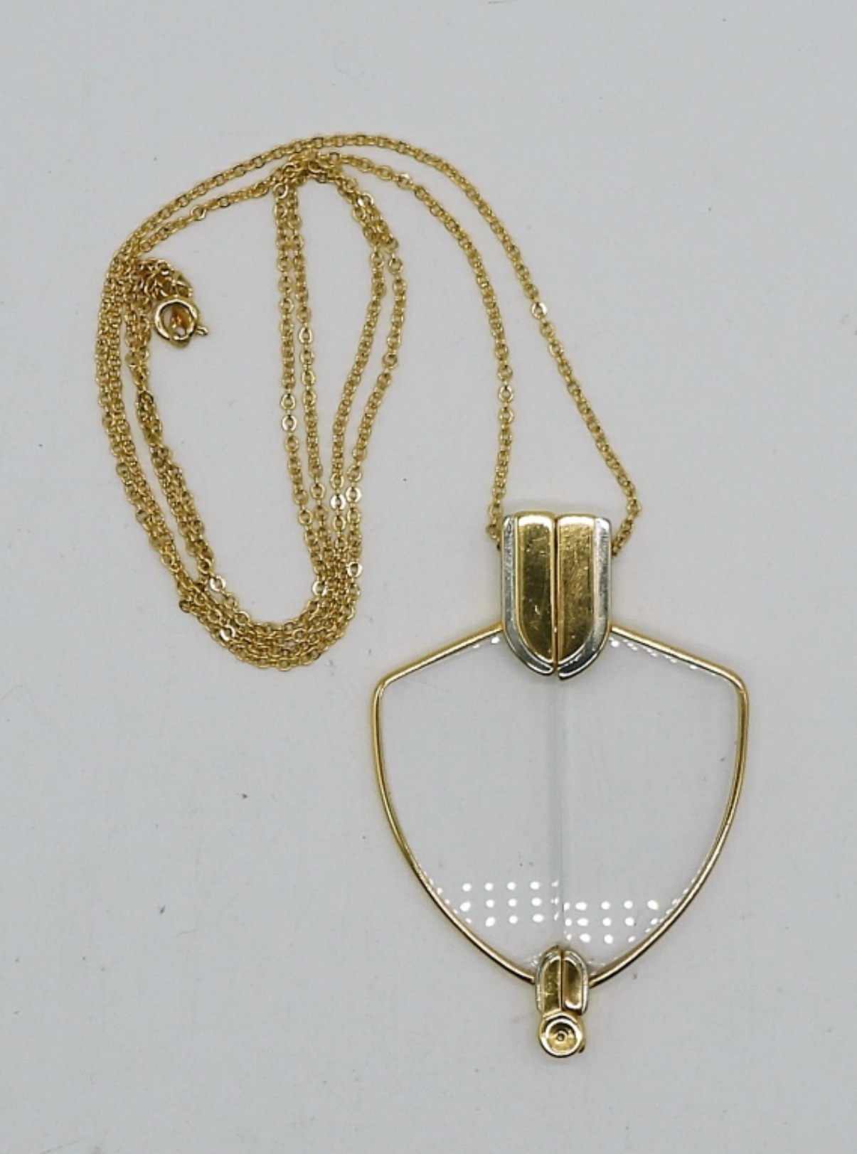 GOLD TONE MAGNIFYING GLASS NECKLACE THAT DOUBLES AS READERS.