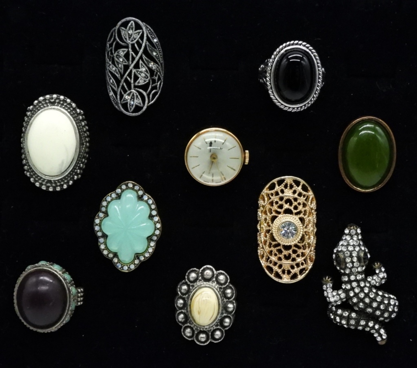 TEN FUN FASHION RINGS, STRETCHY, WATCH, GEMSTONE & MORE. SIZES 5.5-9
