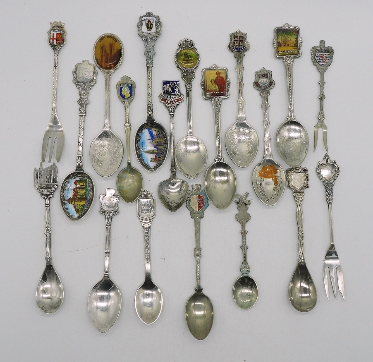 NINETEEN SILVER TONE COLLECTIBLE SPOONS & MINI FORKS.