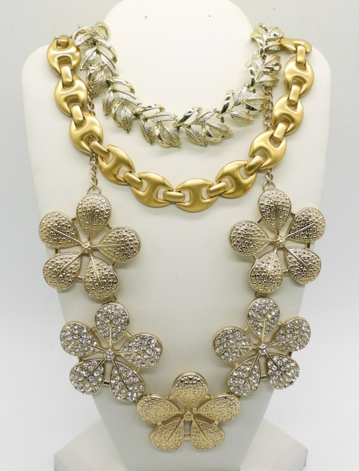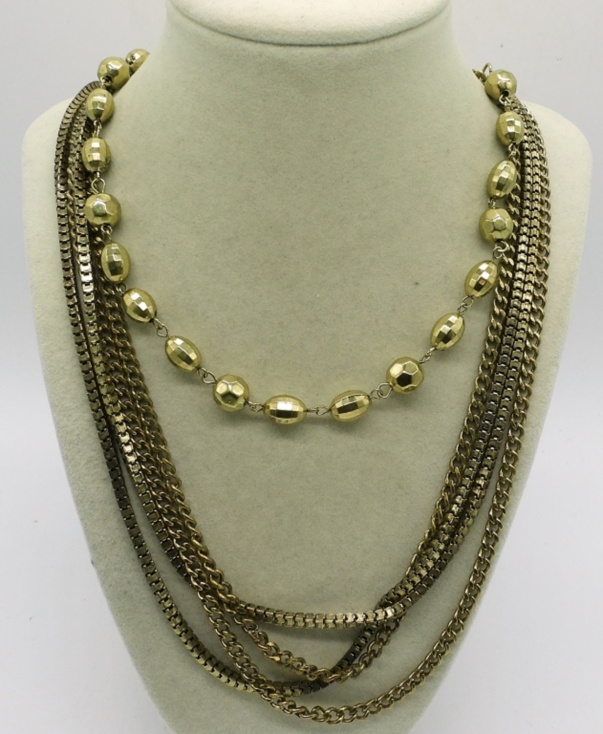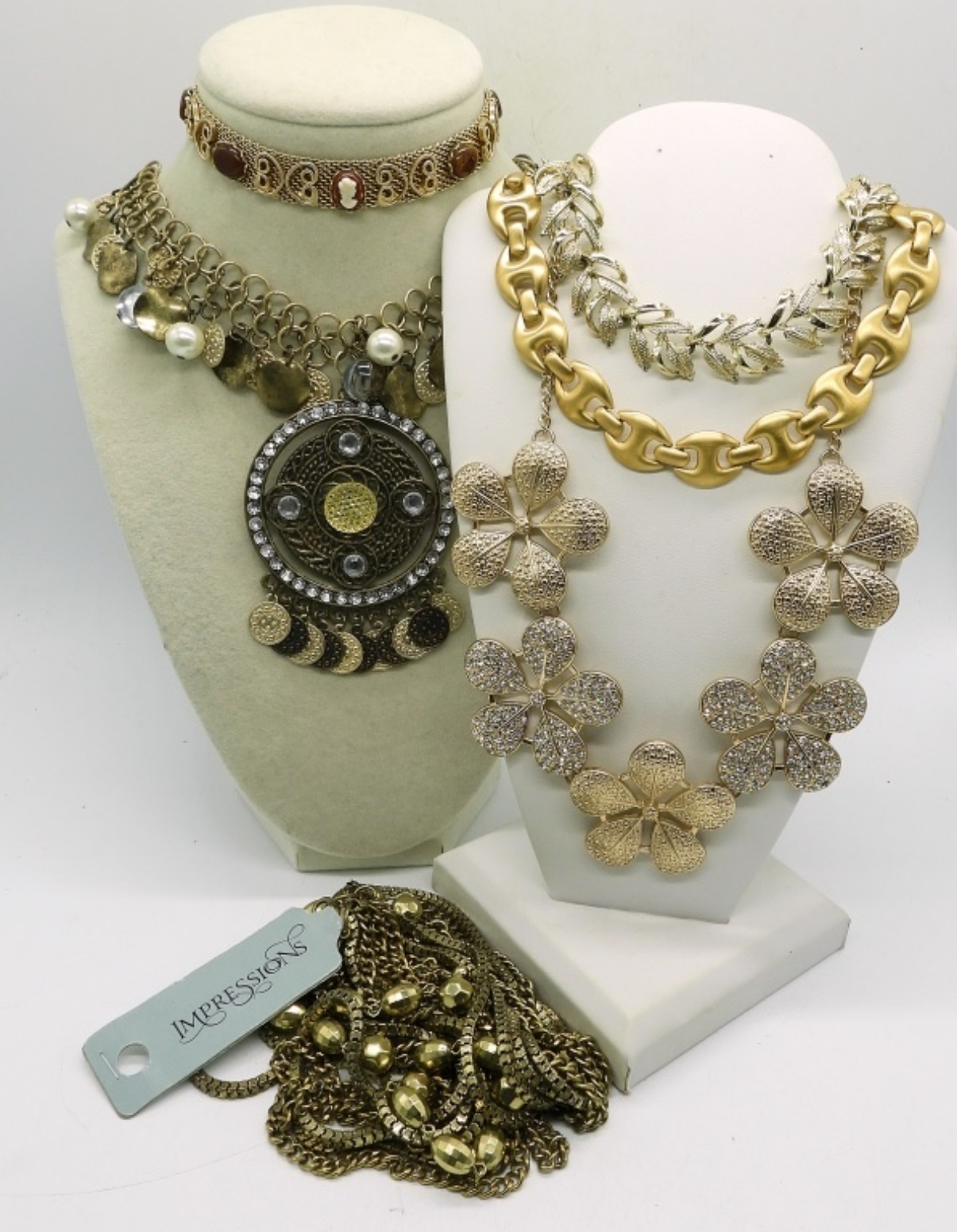 SIX PRETTY GOLD TONE FASHION NECKLACES. 14″, 17″, 20″, 21″, 34″.
