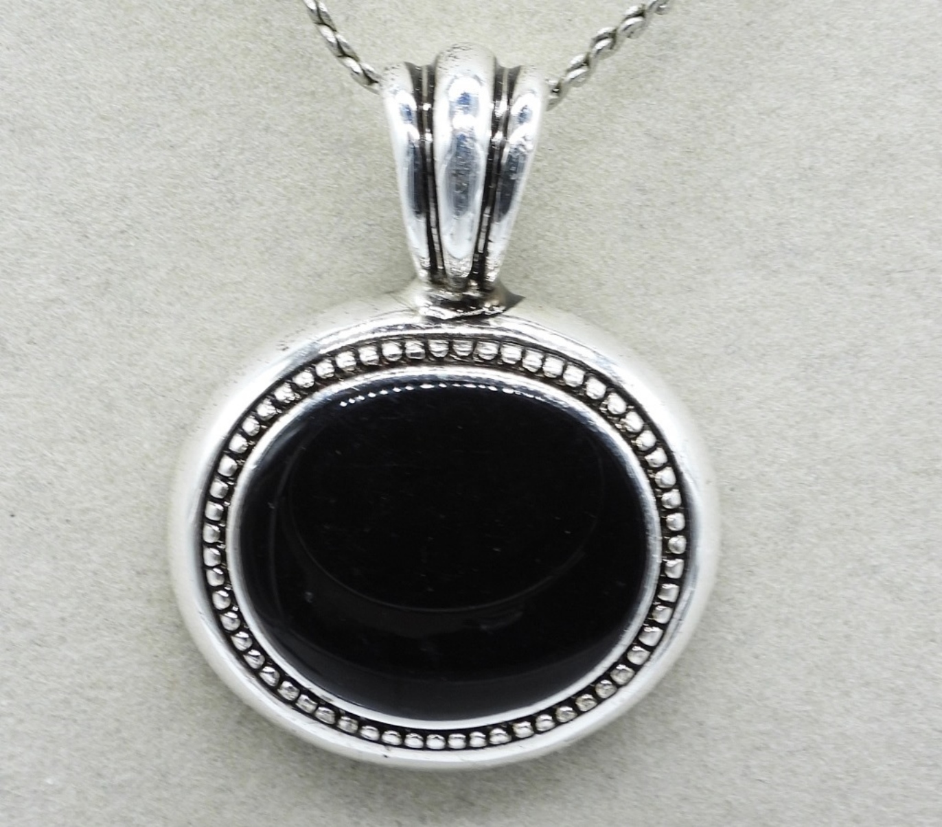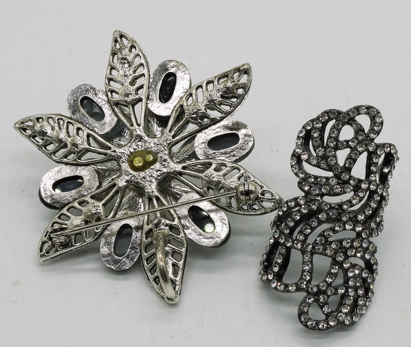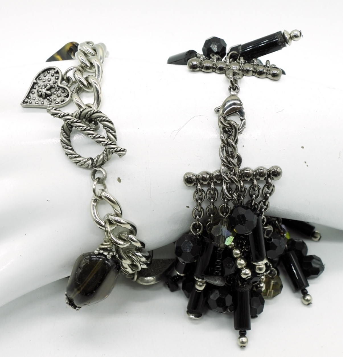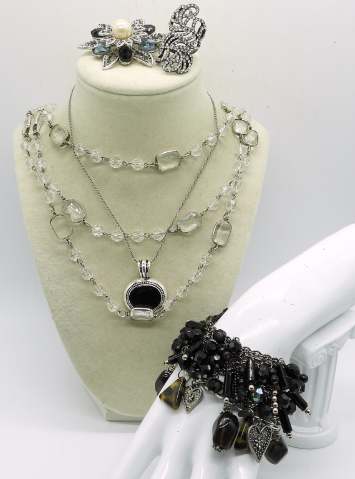 TWO NECKLACES, 15″ & 23″. TWO BRACELETS WITH BLACK BEADS & GEMSTONES 8″. ONE SILVERSTONE BROOCH WITH GEMSTONES, 2″. ONE BLACK TONE RING WITH GEMSTONES, SIZE 7.5
