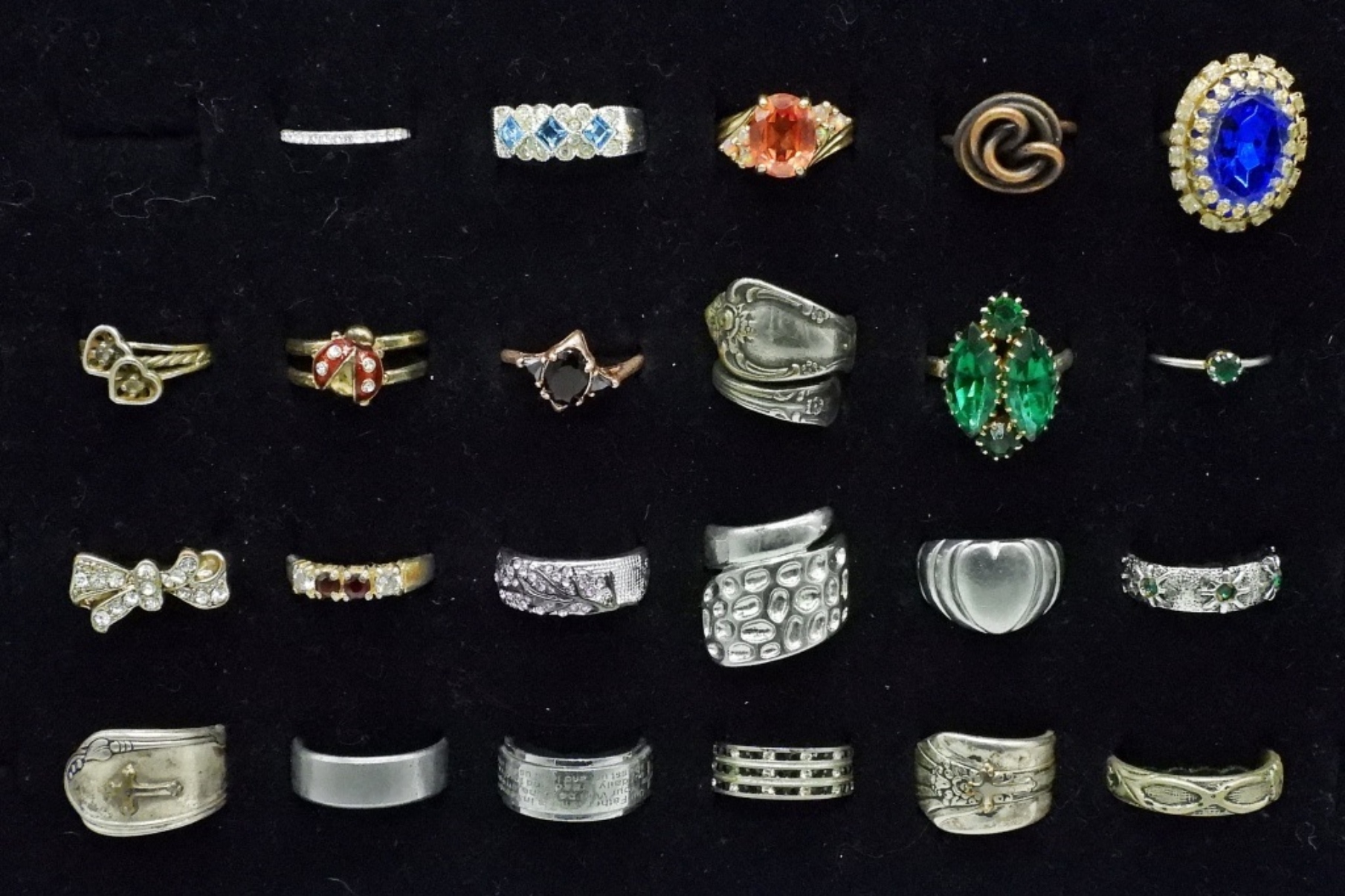 22 VINTAGE FASHION RINGS, GEMSTONES / SPOON /GOLD AND SILVER TONES. SIZES 4.5-8