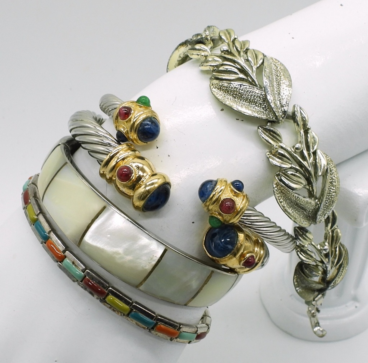 TEN BRACELETS, VINTAGE, GOLD AND SILVER TONE. GEMSTONES, MOTHER OF PEARL / ABALONE INLAYS. RHINESTONES & GOLD TONE FLEUR DE LIS MESH. 7-8.5″.