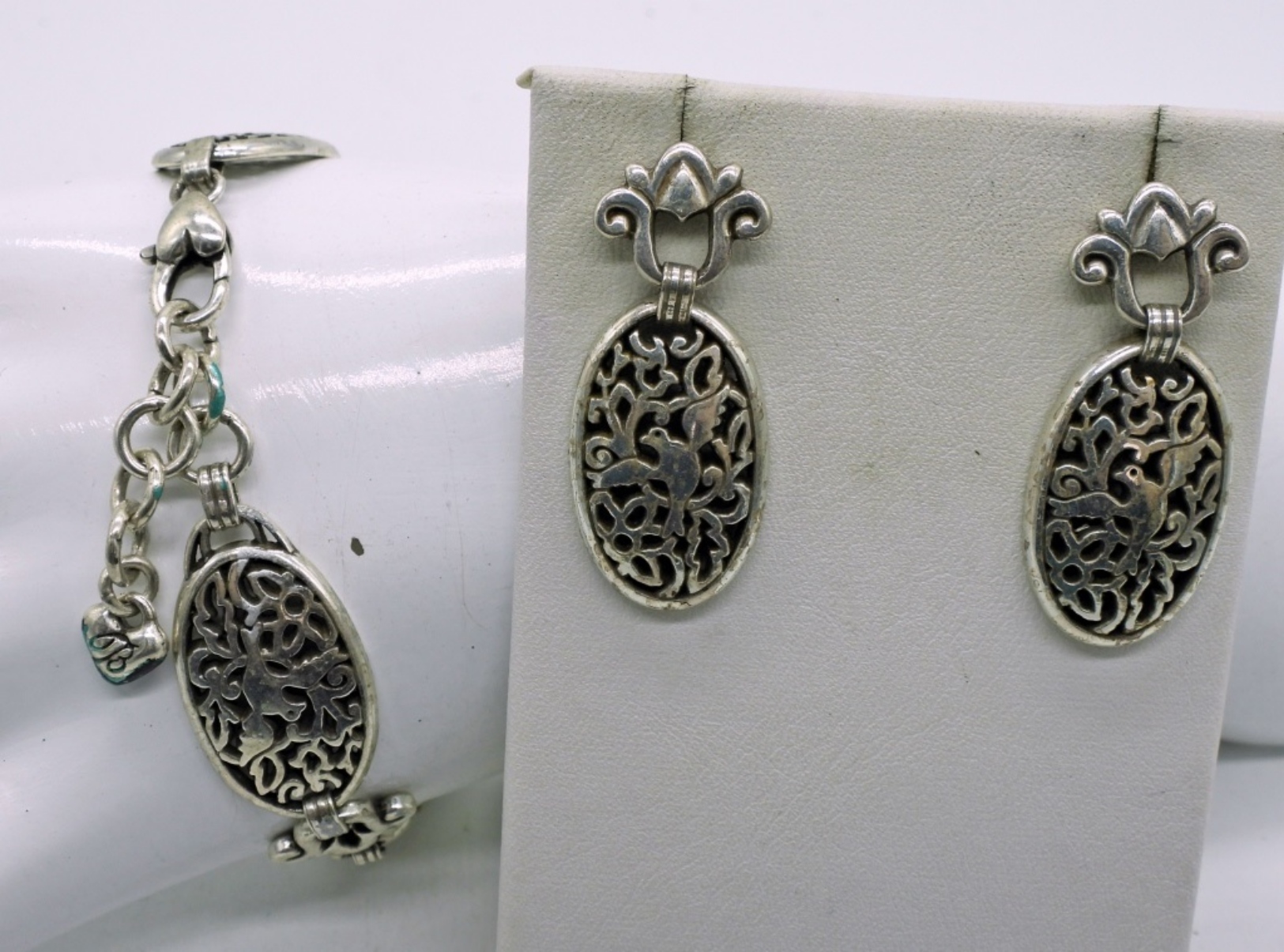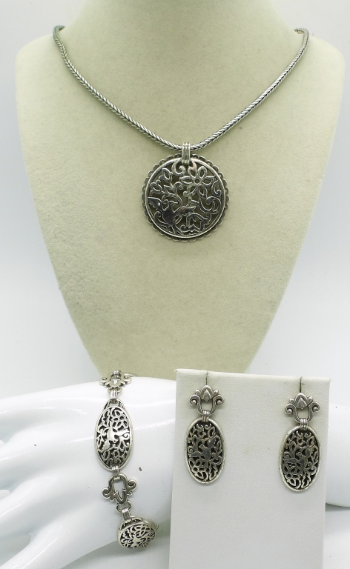 BRIGHTON SONGBIRD ROUND FILIGREE NECKLACE WITH MATCHING PIERCED EARRINGS AND BRACELET! 18″ NECKLACE, 7-8.5″ BRACELET. NEEDS A THOROUGH CLEANING!