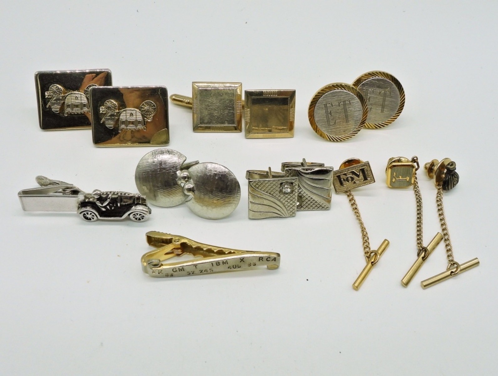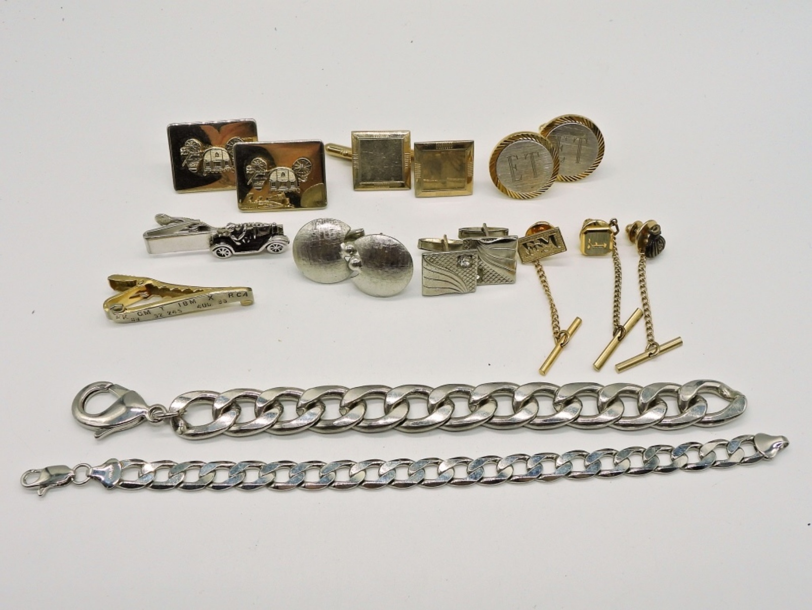 2 BRACELETS, 5 TIE TACKS, 5 PAIR OF CUFF LINKS.