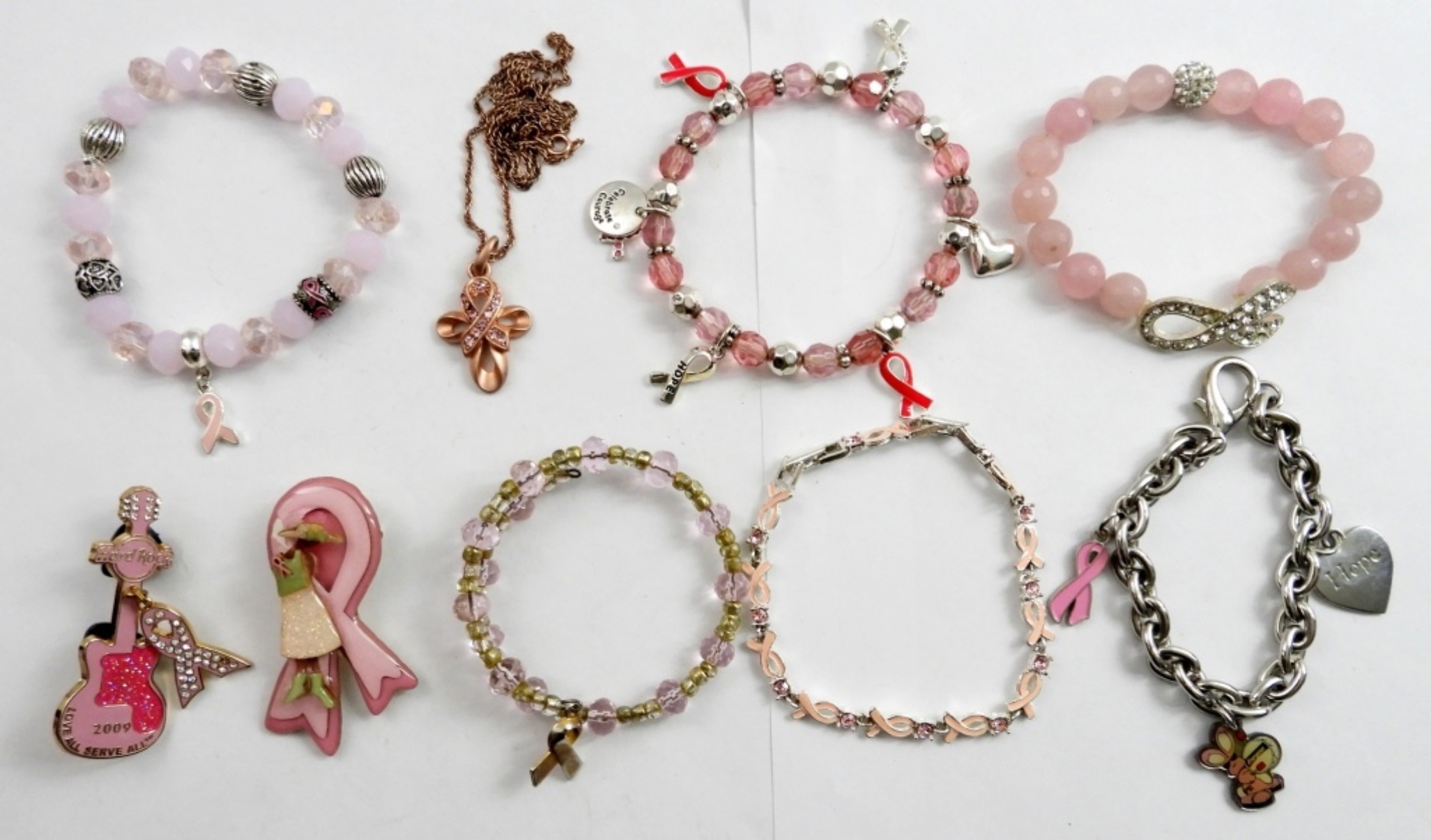 PINK BREAST CANCER AWARENESS RIBBON JEWELRY, (6) BRACELETS (2) BROOCH PINS (1) NECKLACE WITH PENDANT