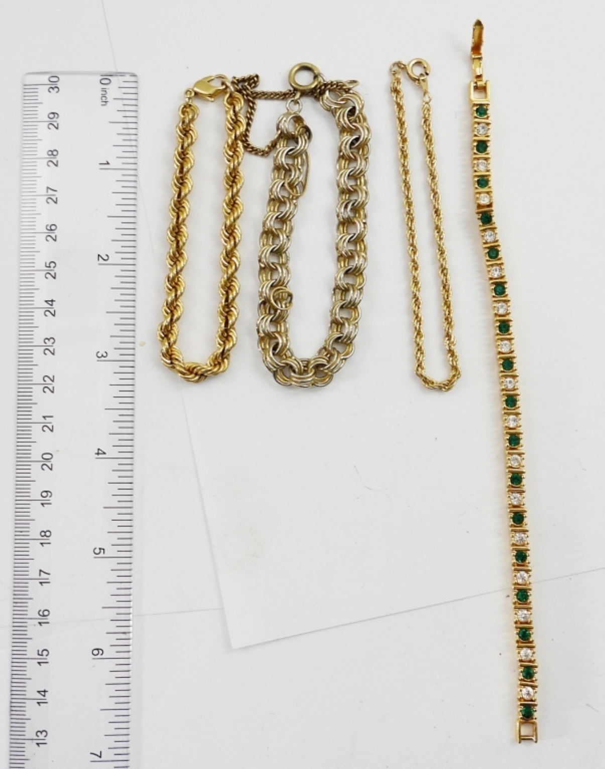 4 GOLD TONE VINTAGE FASHION BRACELETS 6″,1 WITH FAUX EMERALD & DIAMOND STONES
