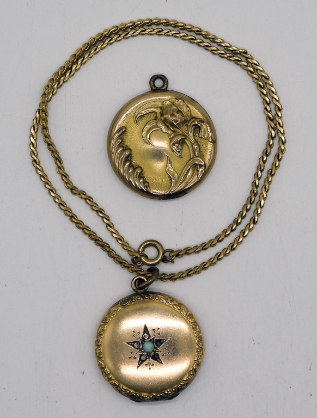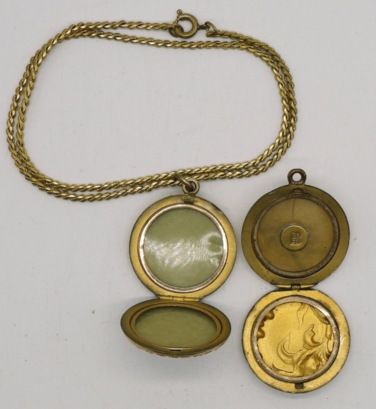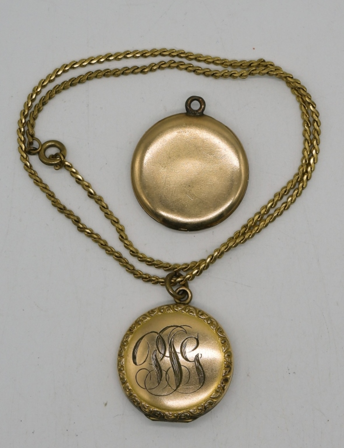 TWO VINTAGE GOLD TONE LOCKETS, BOTH VERY PRETTY. ONE GOLD TONE CHAIN, 15″.