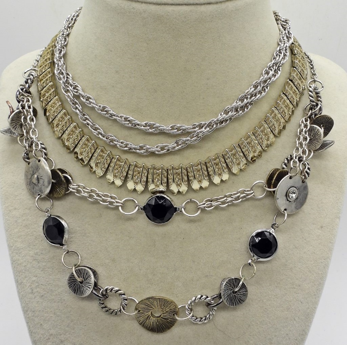Silver Tone Chain, 25.5″. Silver Tone, Brass & Black Gemstone Necklace, 19.5-22.5″ Adjustable. Gold Tone Necklace, 13-15.5″ Adjustable.