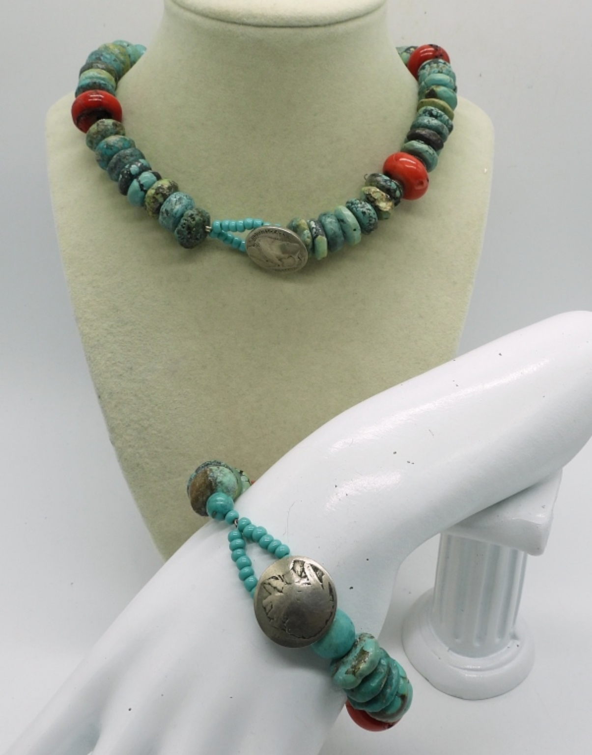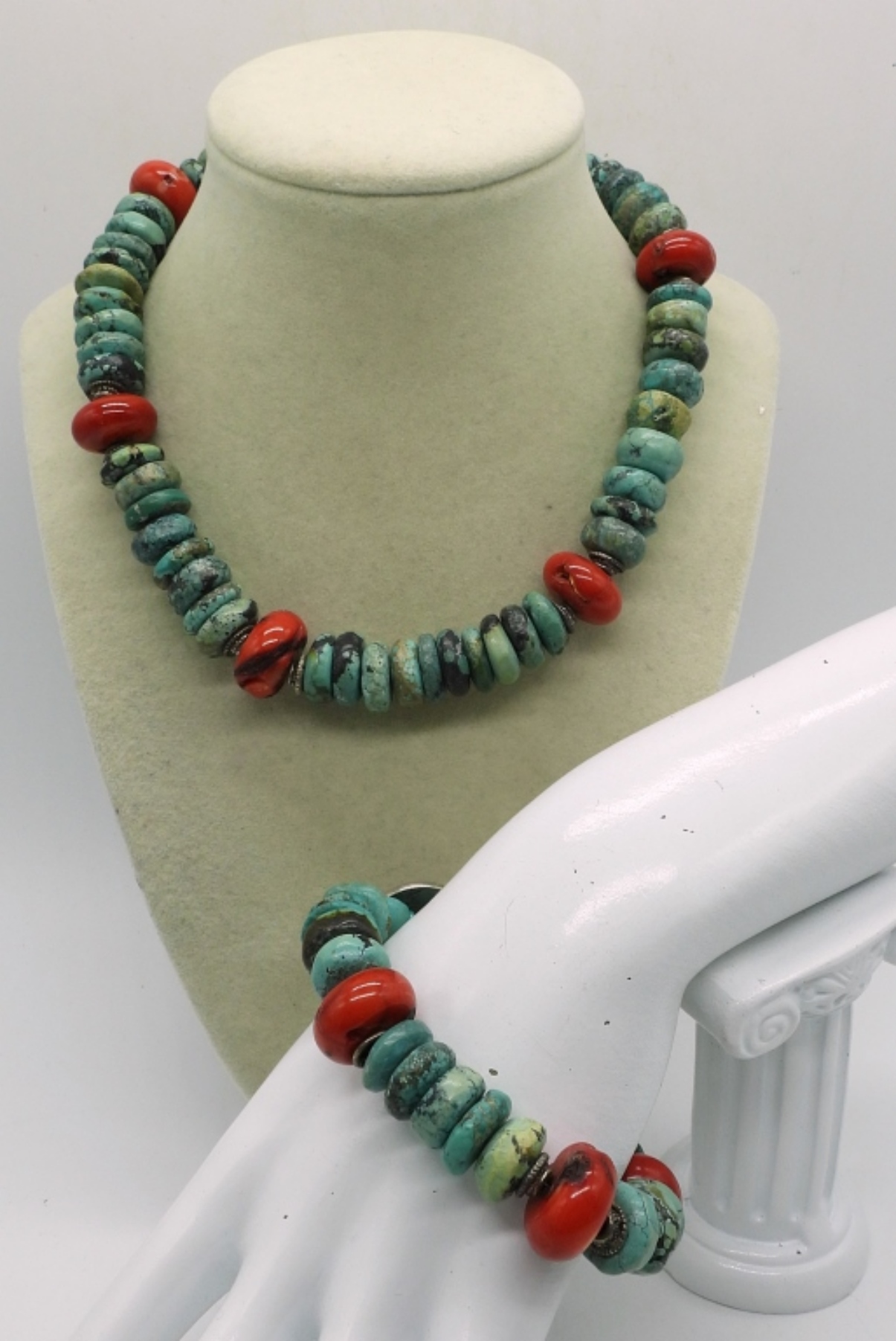 VINTAGE TURQUOISE BEADS WITH RED CORAL BEADS. MATCHING NECKLACE AND BRACELET. NECKLACE 16″ / BRACELET 8″.