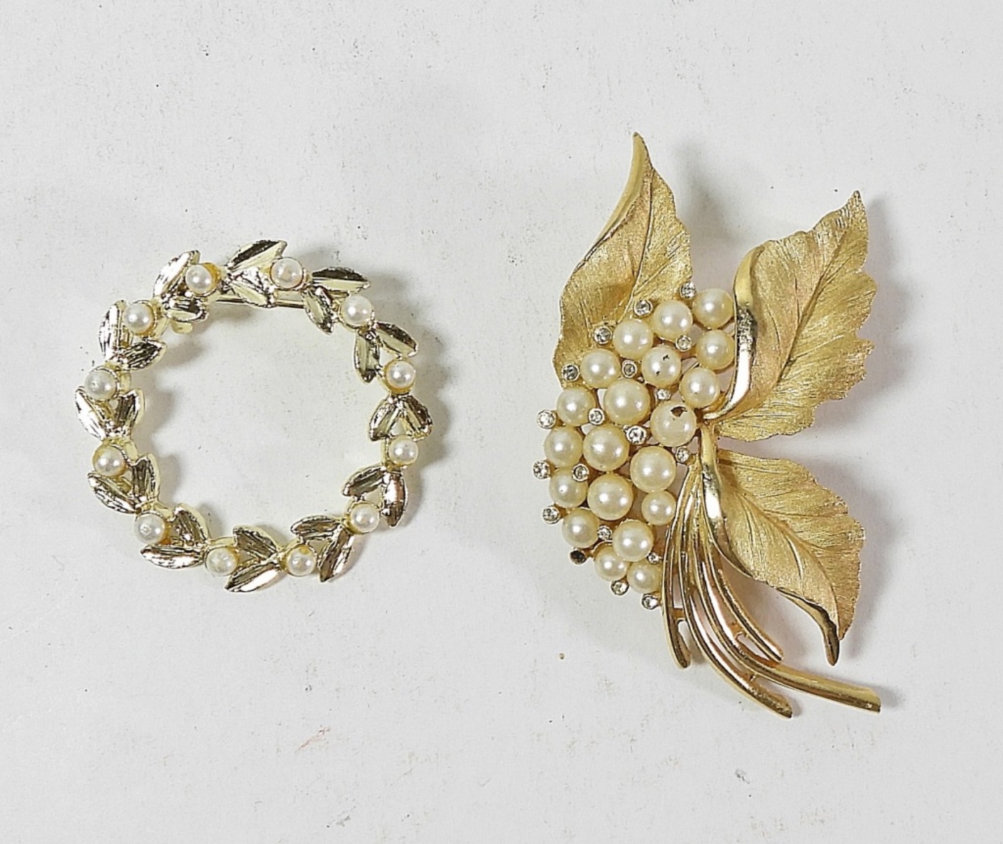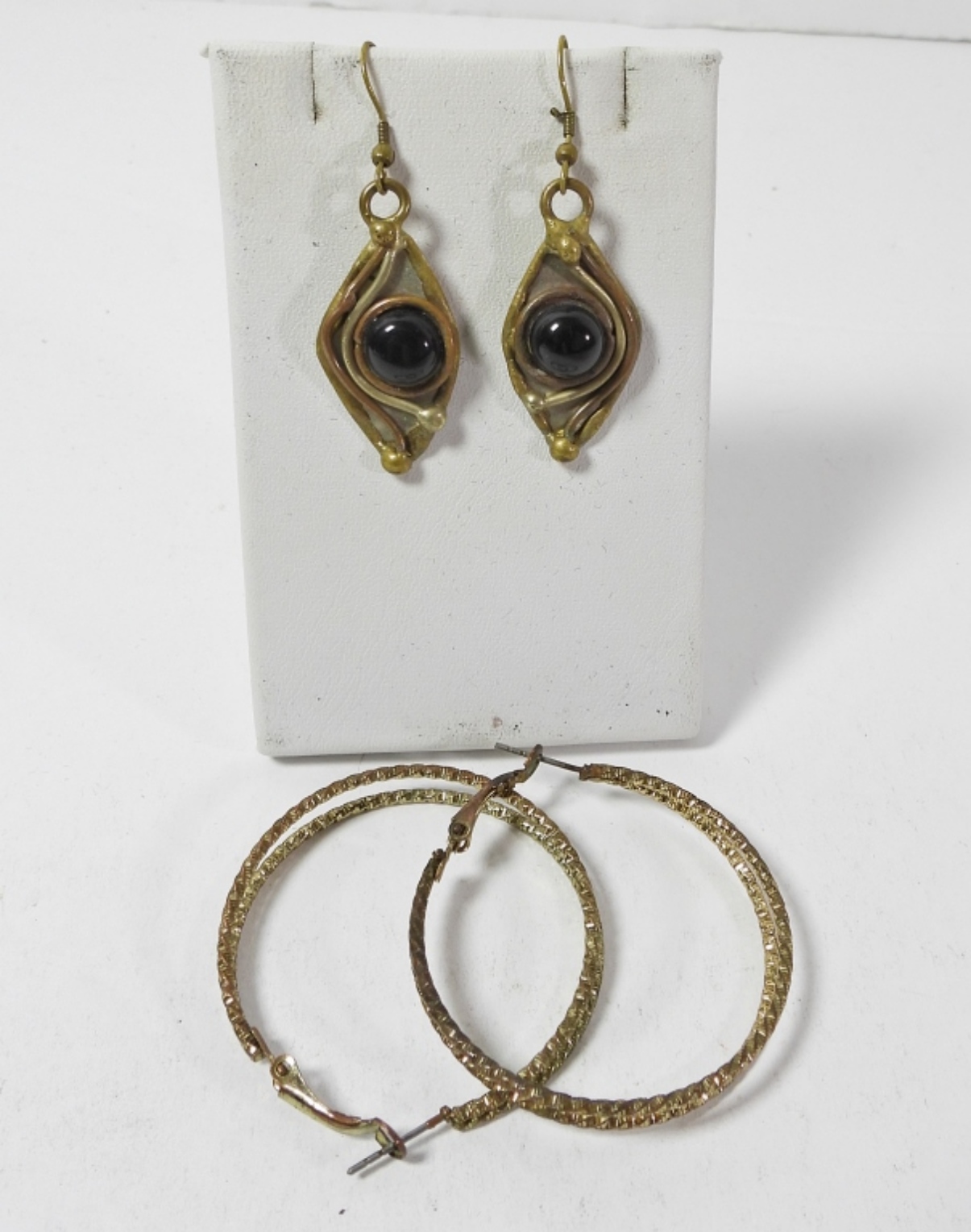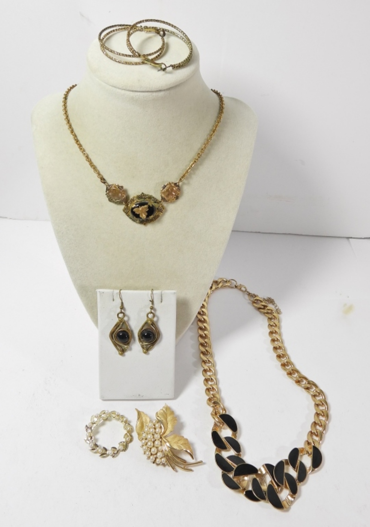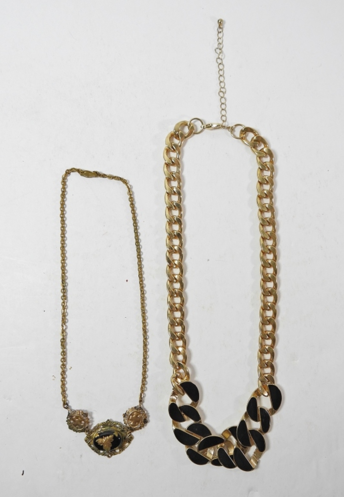 2 GOLD TONE VINTAGE NECKLACES WITH BLACK ACCENT 18″&14″, 2 PAIR OF VINTAGE GOLD TONE EARRINGS, 2 GOLD TONE BROOCHES