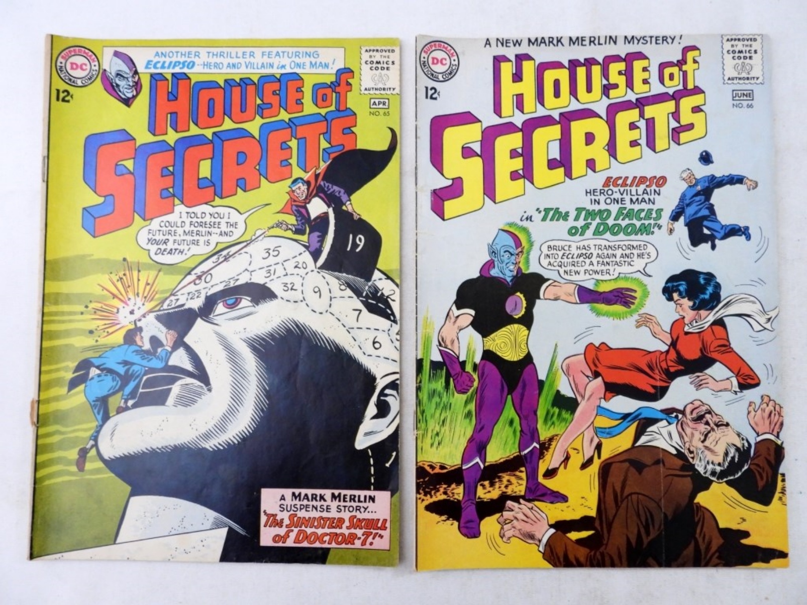 APR # 65, A MARK MERLIN SUSPENSE STORY, THE SINISTER SKULL OF DOCTOR-7,JUNE #66 ECLIPSO HER VILLAIN IN ONE MAN, THE TWO FACES OF DOOM, FAIR CONDITION