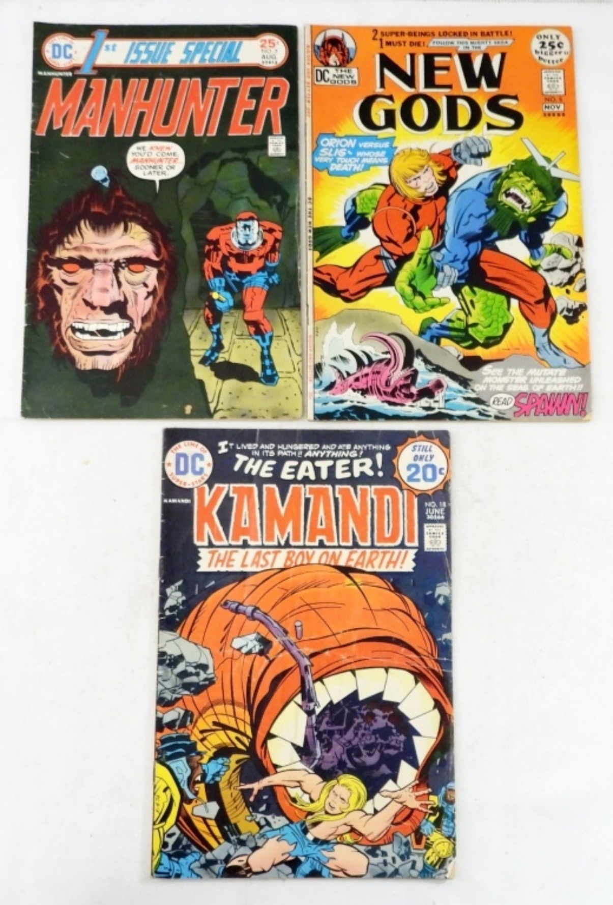 (3)BRONZE DC ASSORTED COMICS . NEW GODS #5 ,2 SUPER BEINGS LOCKED IN 1 BATTLE , MANHUNTER #5, KAMANDI #18 THE EATER! (G-VG)