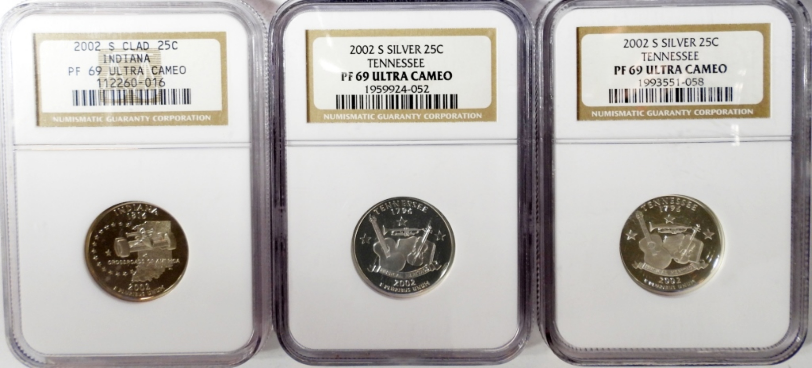 (2) 2002 S “SILVER” TENNESSEE NGC PF69 ULTRA CAMEO (1) 2002 S “CLAD” INDIANA NGC PF69 ULTRA CAMEO