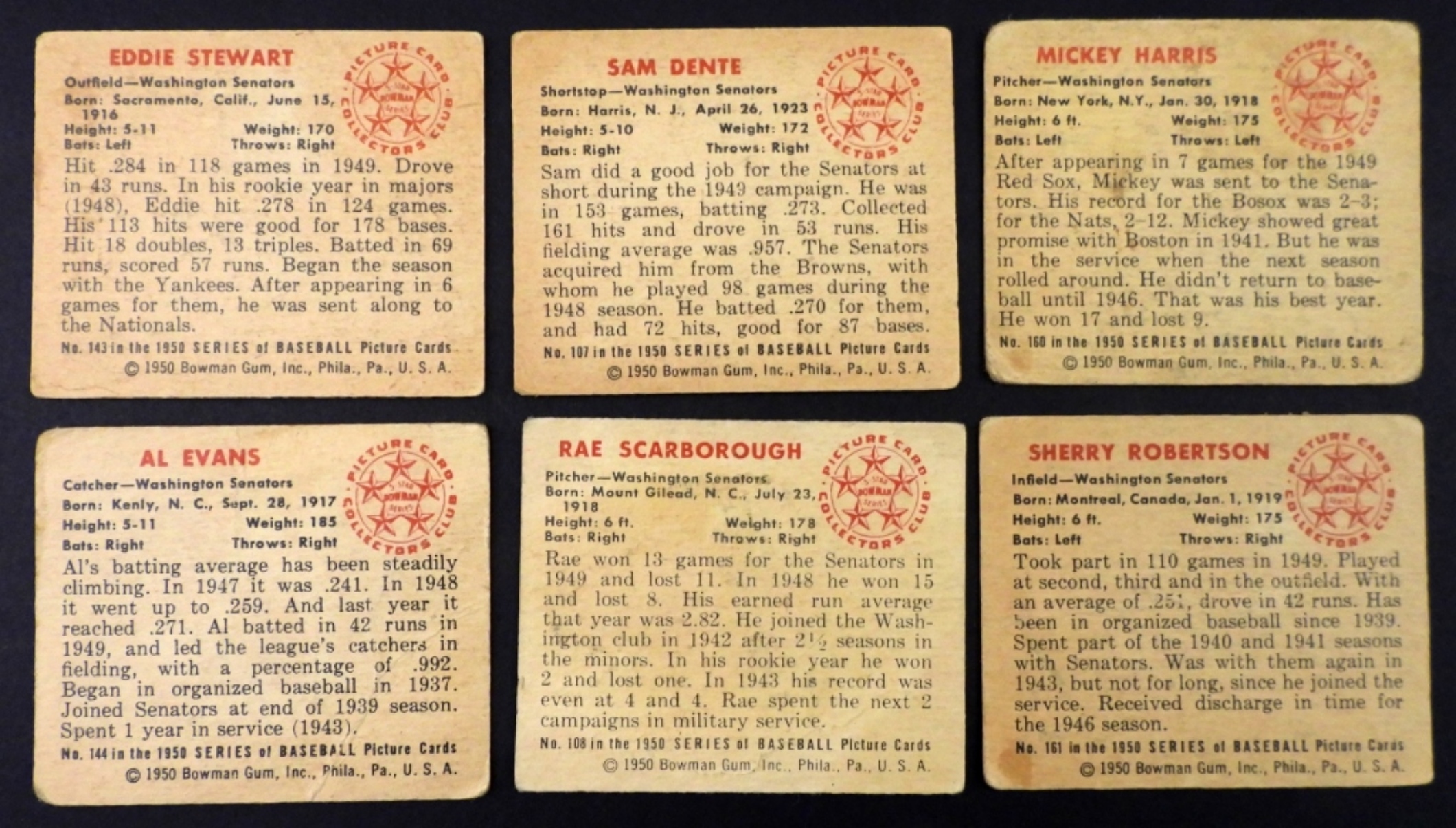 (6) 1950 BOWMAN BASEBALL LOT, AL EVANS , RAE SCARBOROUGH, SHERRY ROBERTSON, EDDIE STEWART, SAM DENTE, & MICKY HARRIS. (GOOD)