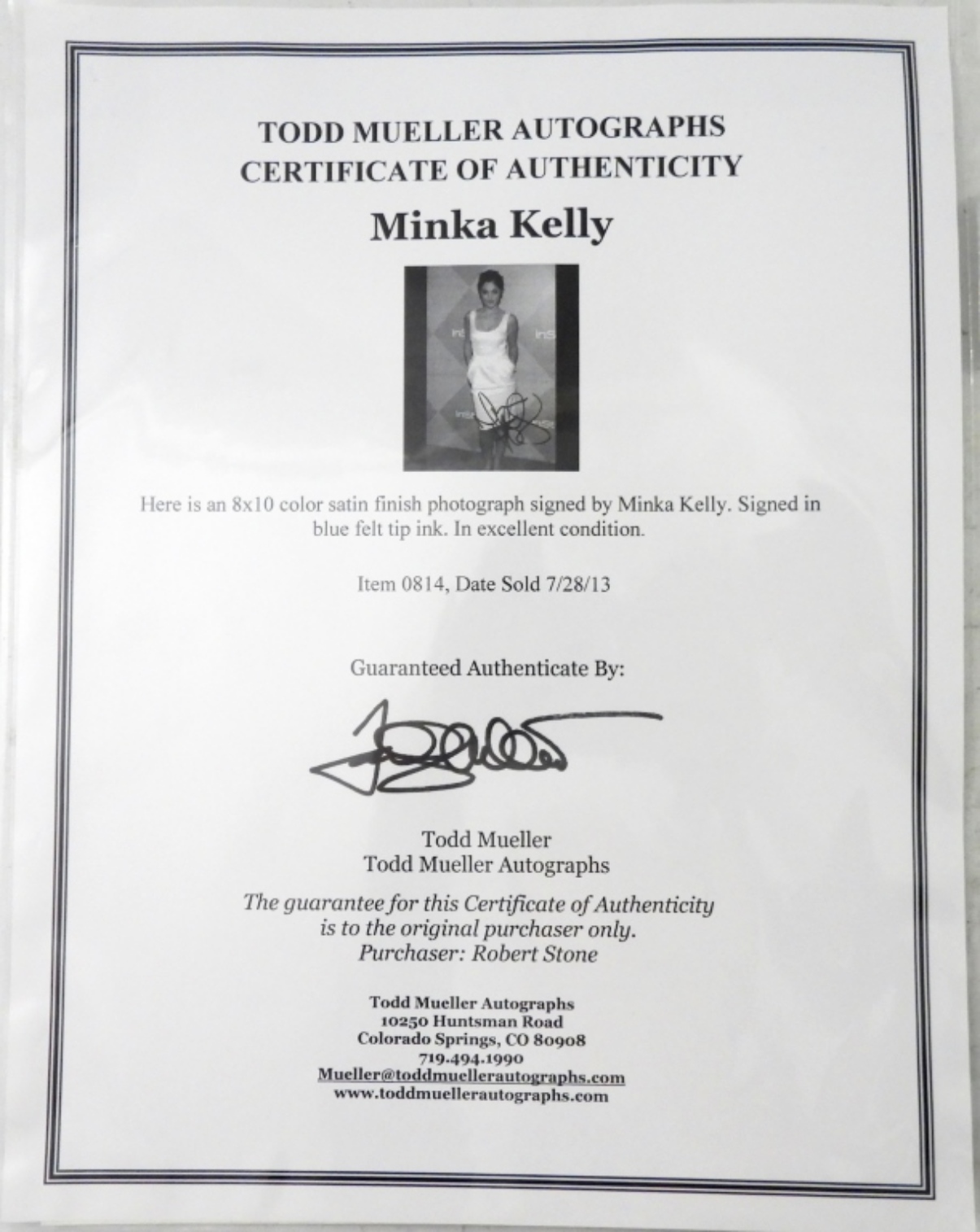 MINKA KELLY 8×10 AUTOGRAPHED PHOTO – TODD MUELLER COA