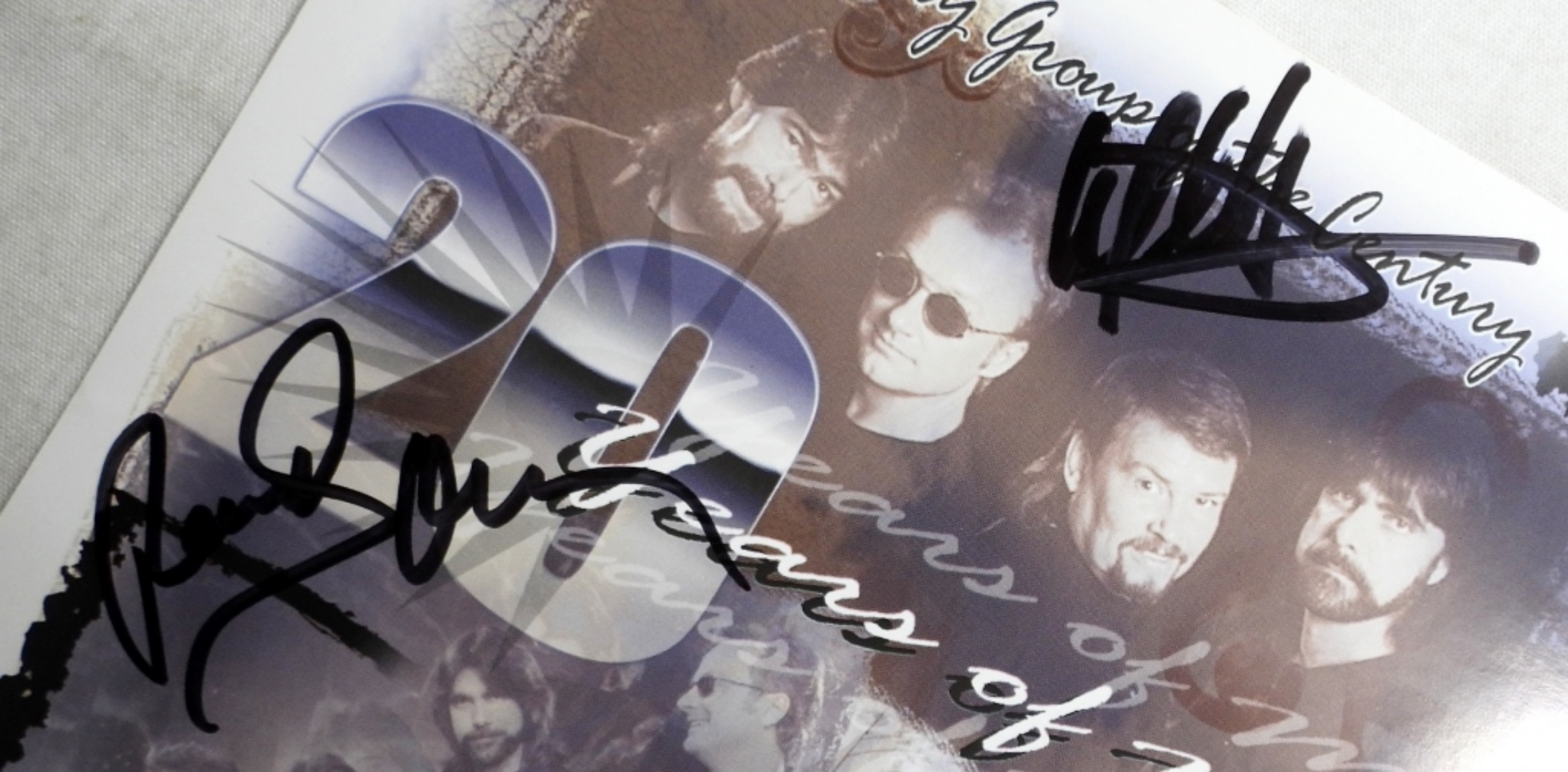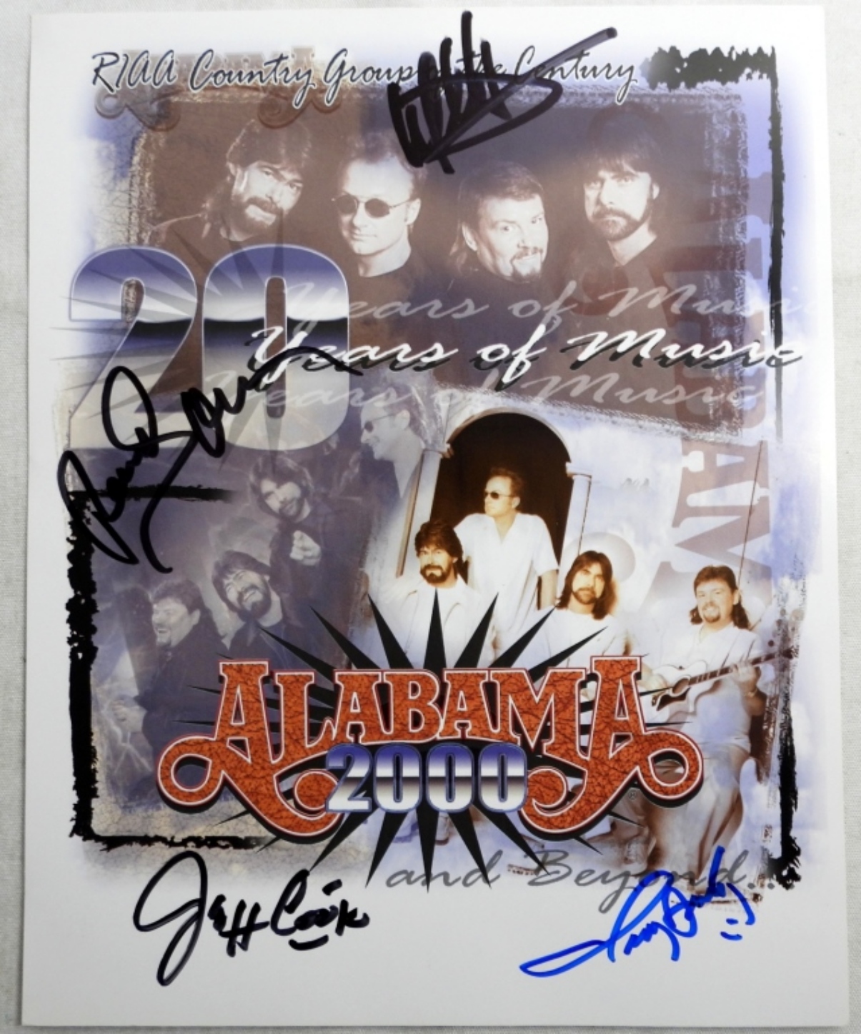 SIGNED 8X10 ALABAMA COUNTRY MUSIC BAND, 20 YEARS OF MUSIC FAN CLUB PHOTO SIGNED BY RANDY OWEN , JEFF COOK & MORE