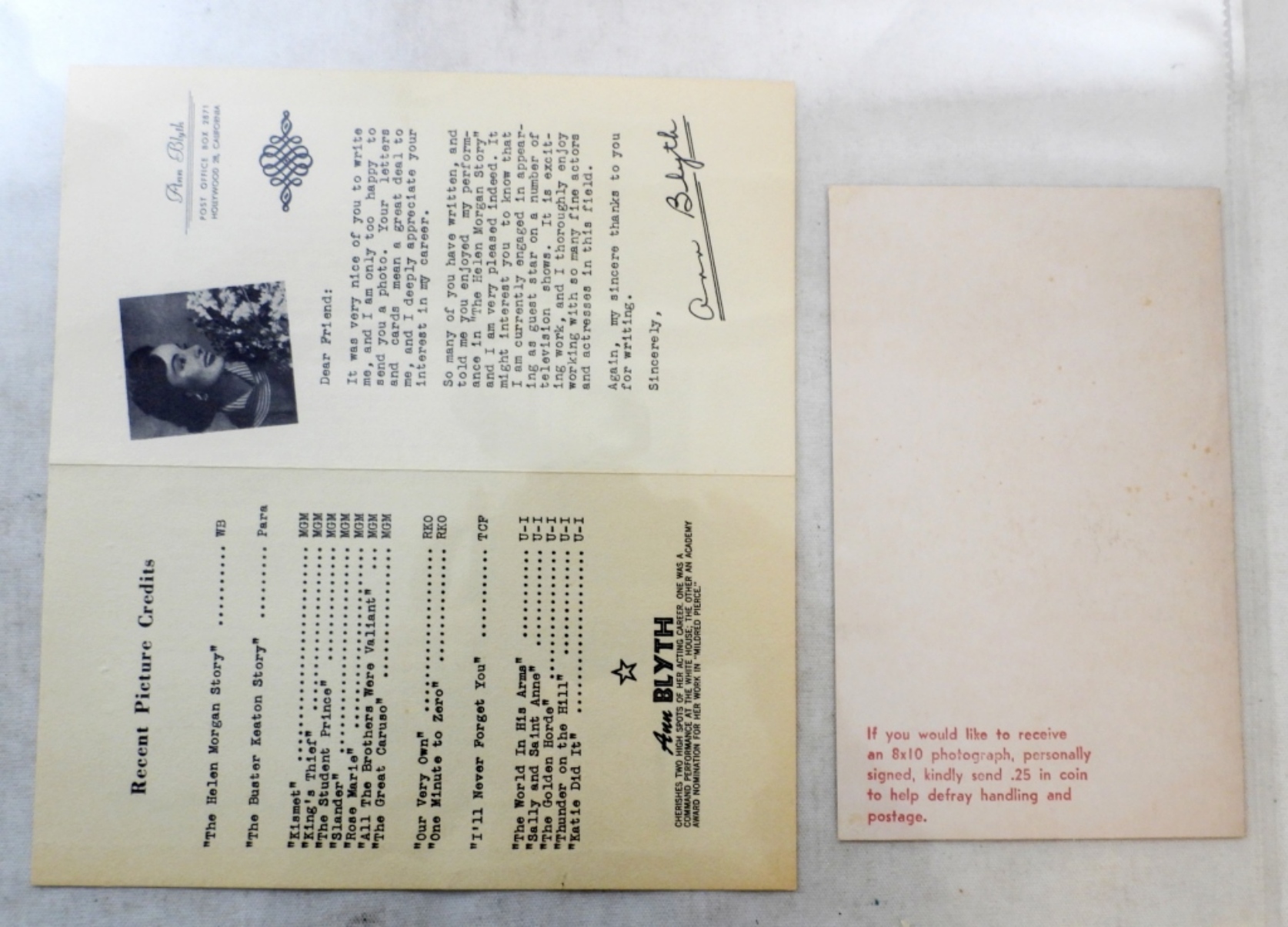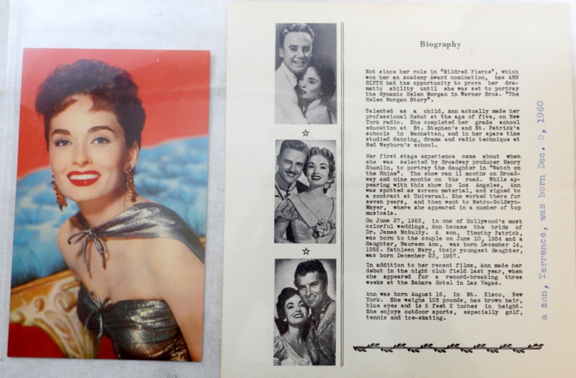 VINTAGE ANN BLYTH ORIGINAL GLAMMER STUDIO PHOTO 3X5 ,BIOGRAPHY AND RECENT PICTURE CREDITS
