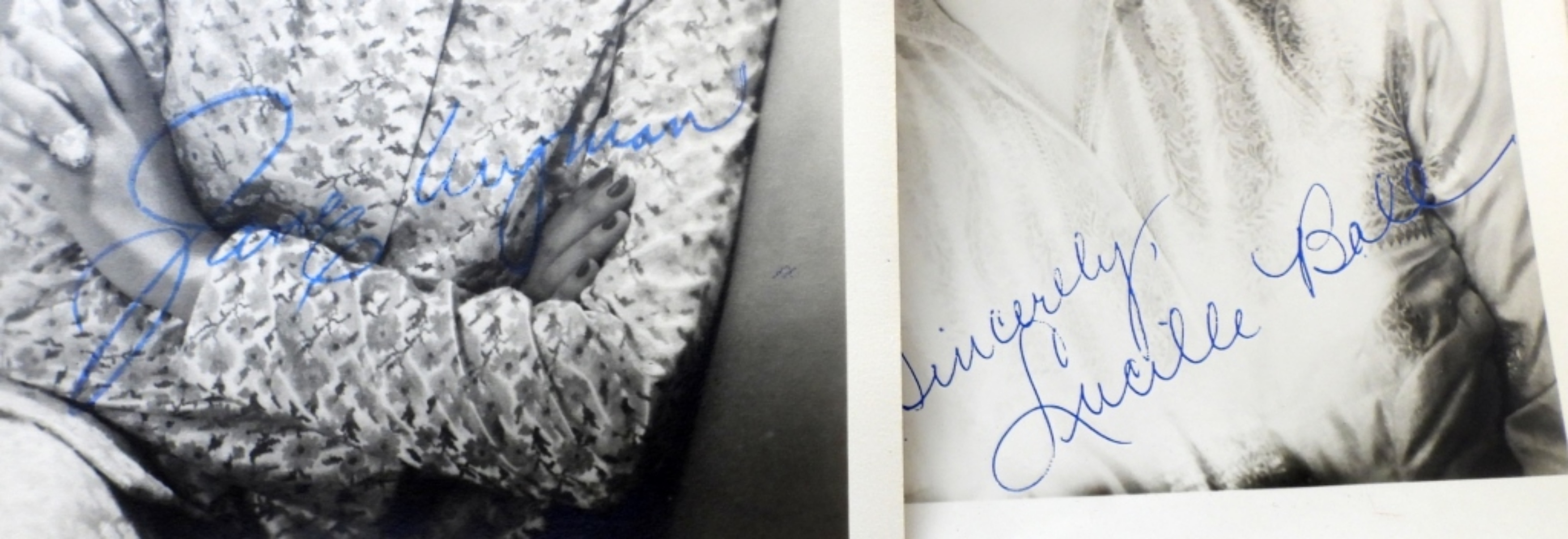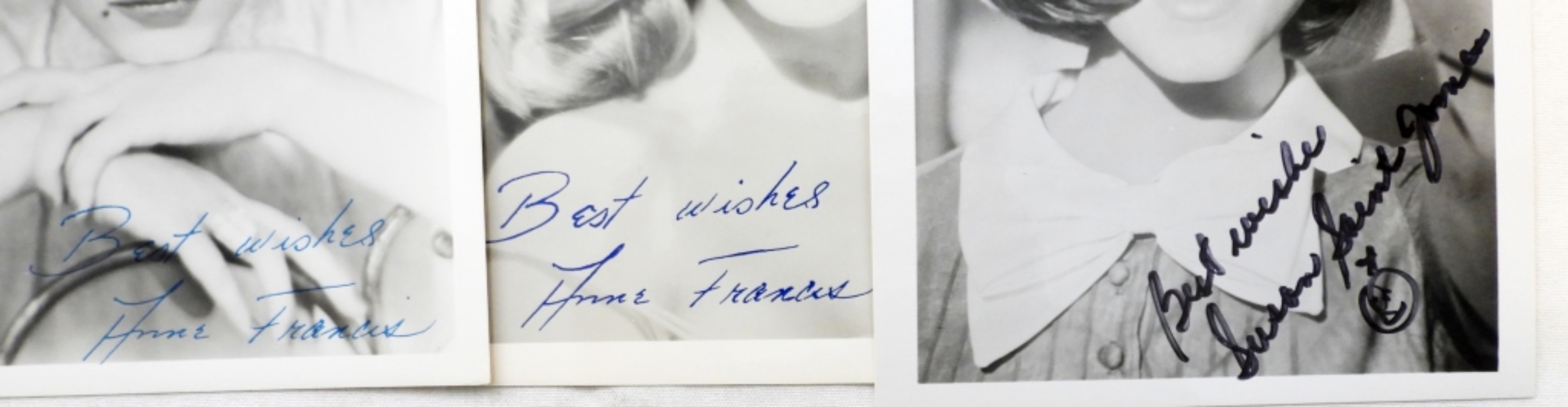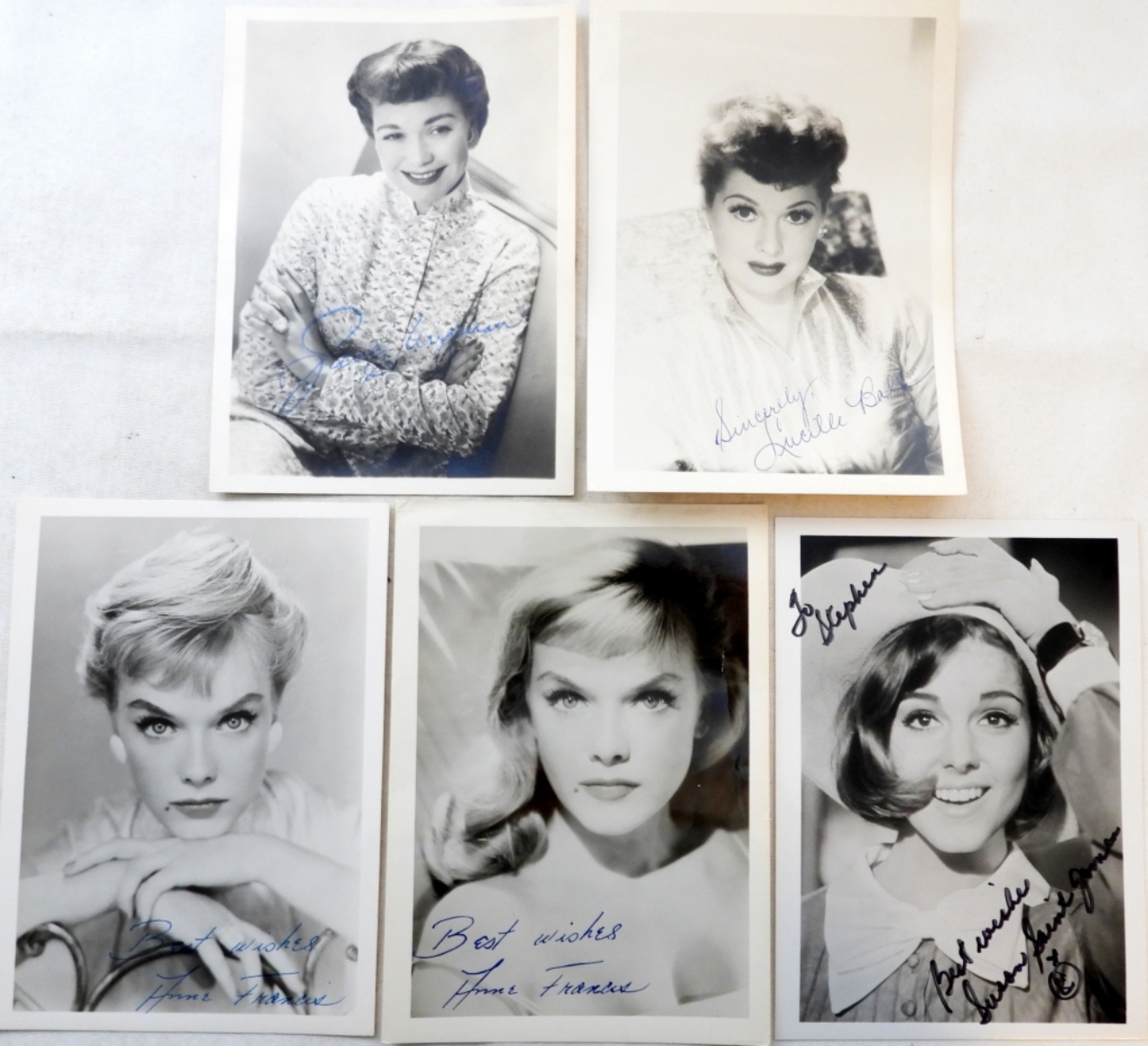 (5) VINTAGE AUTOGRAPH BLACK AND WHITE 5X7’S , ACTRESS LUCILLE BALL , ACTRESS AND FORMER WIFE OF RONALD REAGAN JANE WYMAN,(2) ACTRESS ANNE FRANCIS ,& ACTRESS SUSAN SAINT JAMES