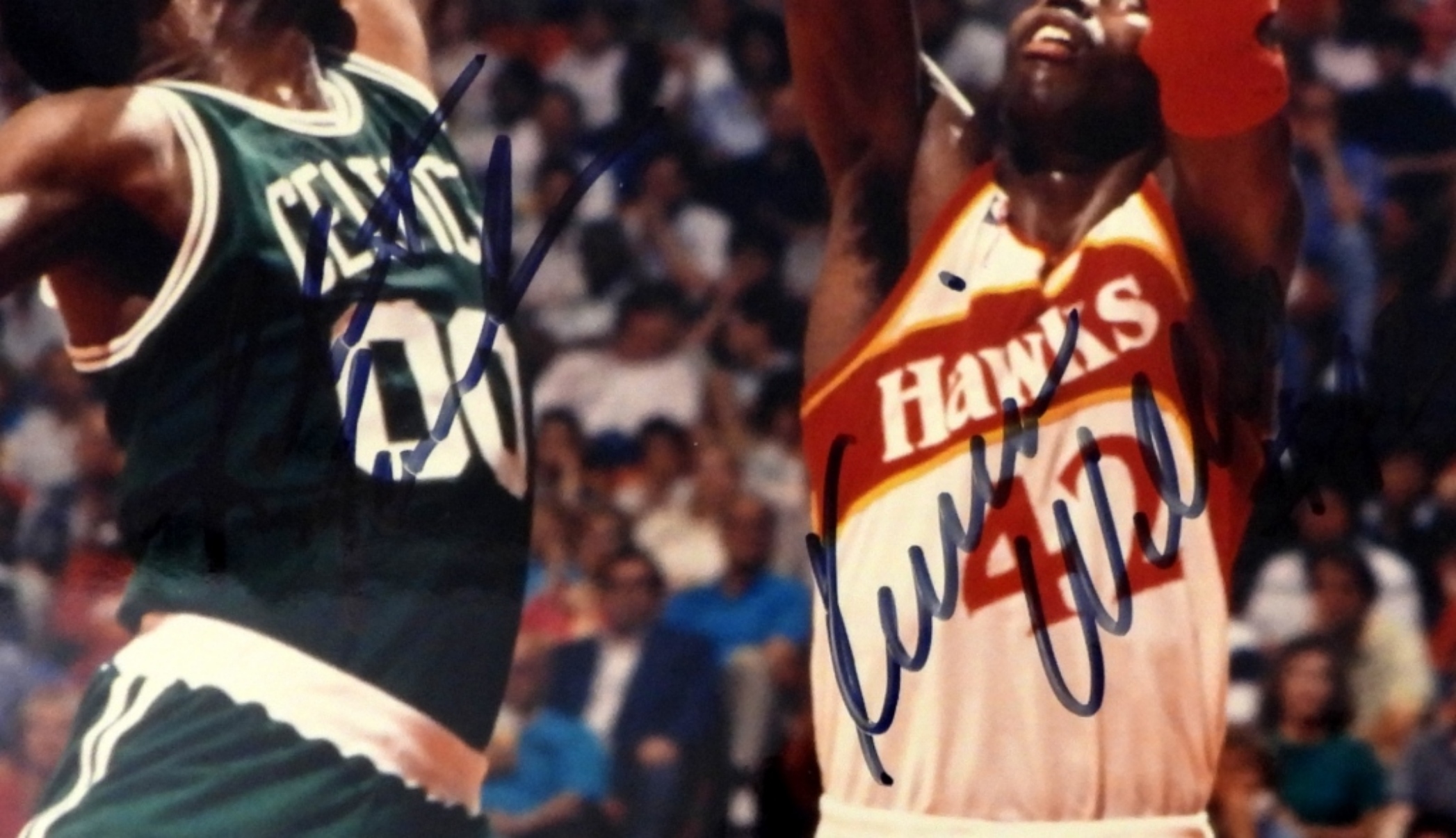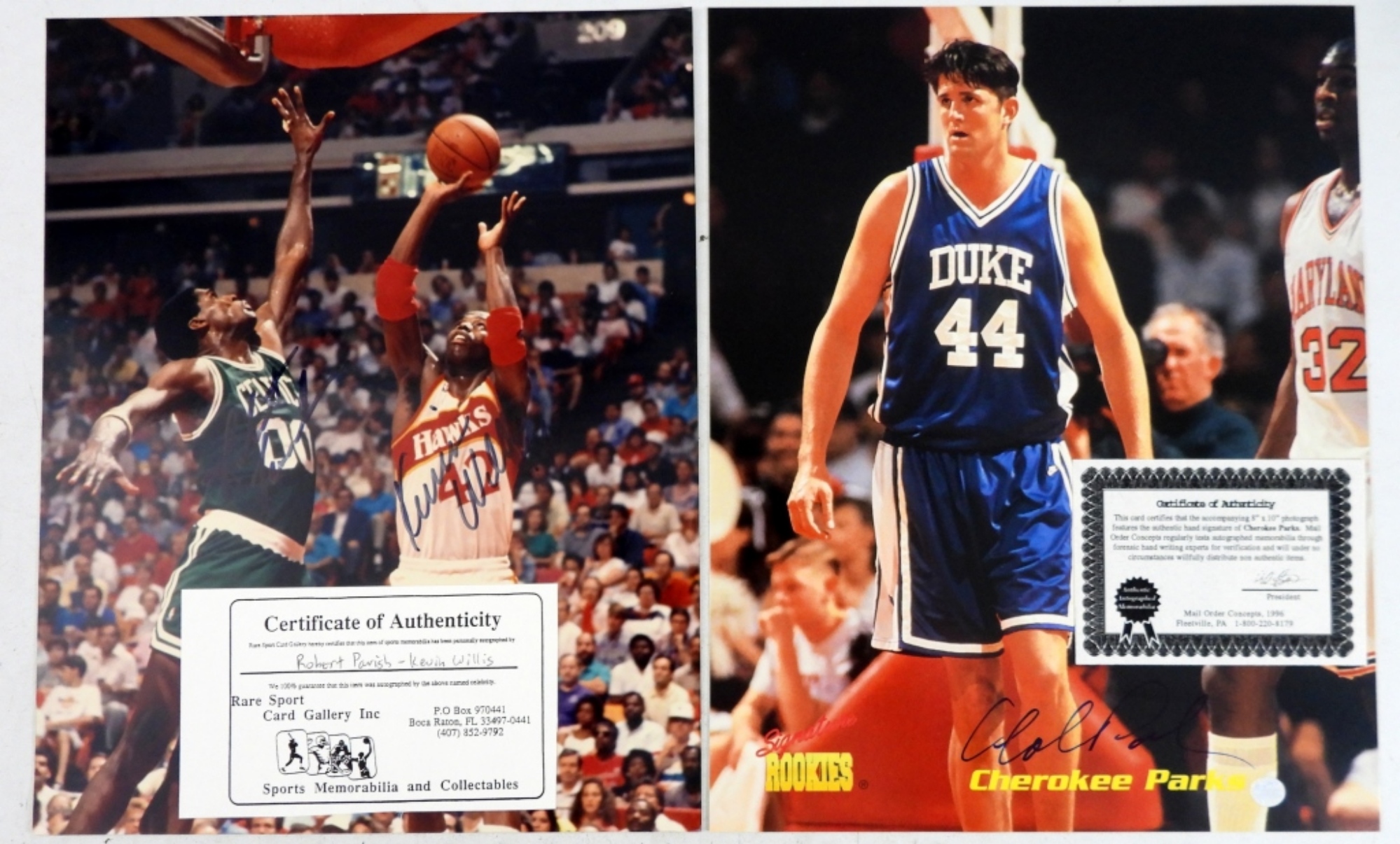 AUTOGRAPHED BY ROBERT PARISH AND KEVIN WILLIS WITH RARE SPORT CARD GALLERY COAALSO CHEROKEE PARKS AUTHENTIC AUTOGRAPHED MEMORABILIA COA