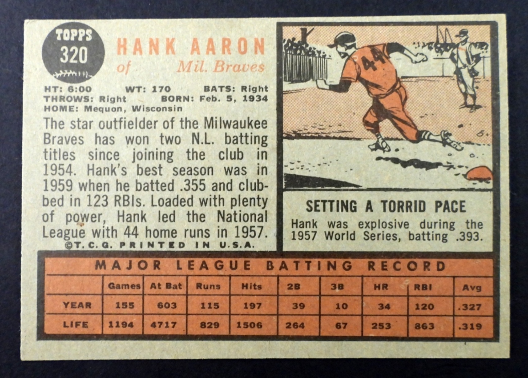 1962 TOPPS # 320 HANK AARON ( VGEX) NICE COLOR
