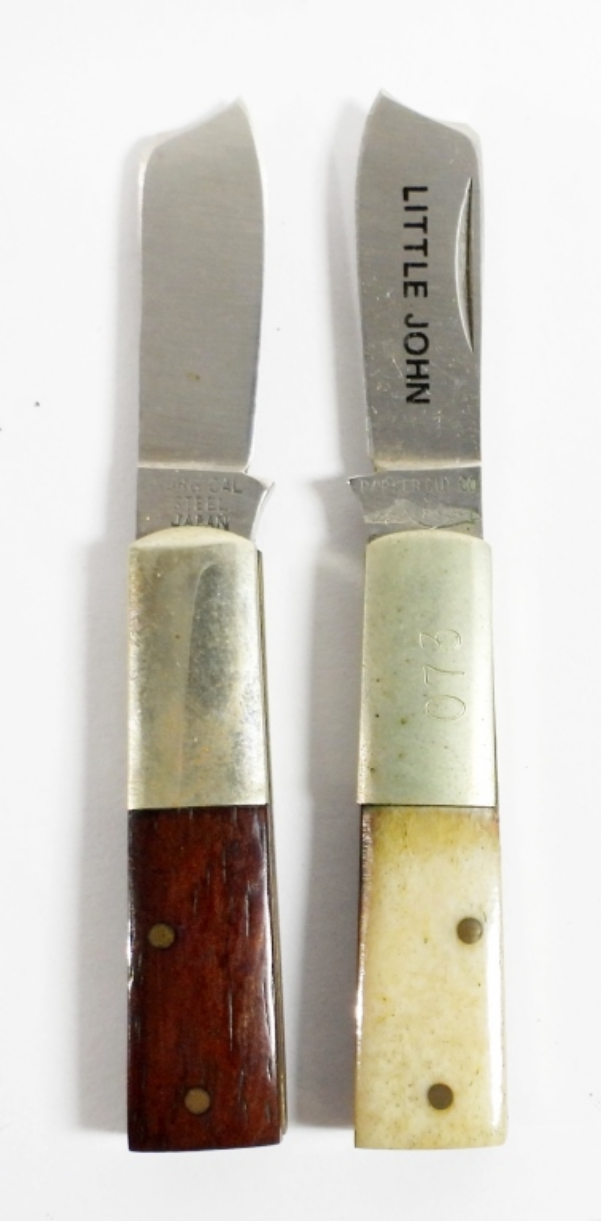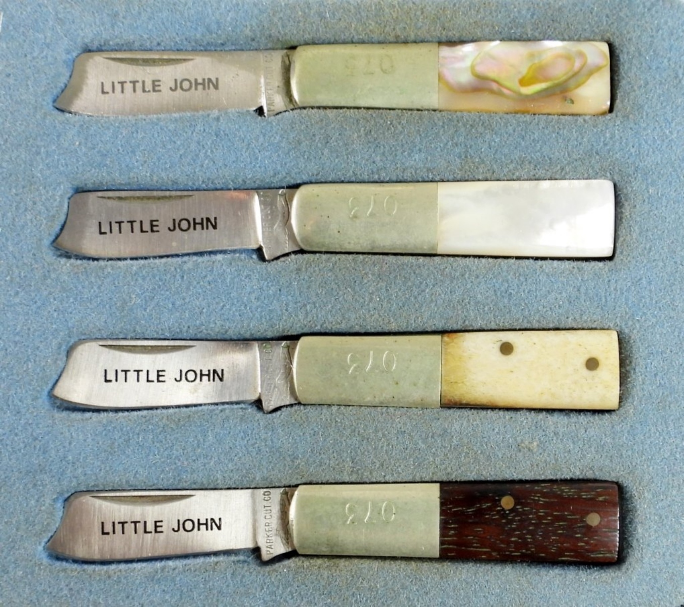 PARKER CUT CO. 4PIECE MINI RAZOR KNIFE SET. ABALONE, MOTHER OF PEARL AND BONE HANDELS. IN ORIGINAL HARD CASE