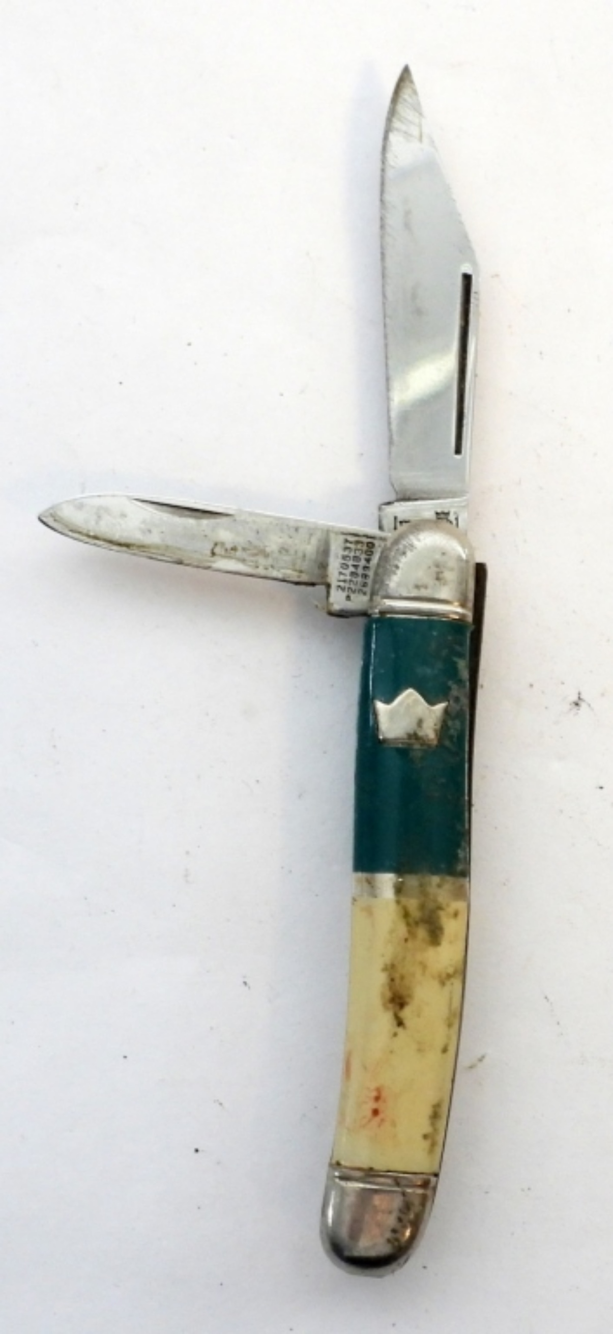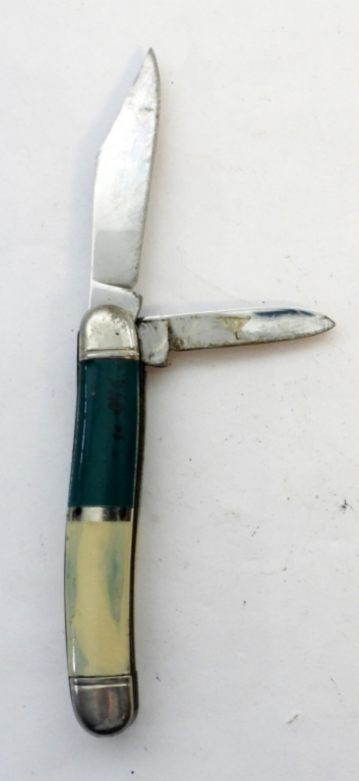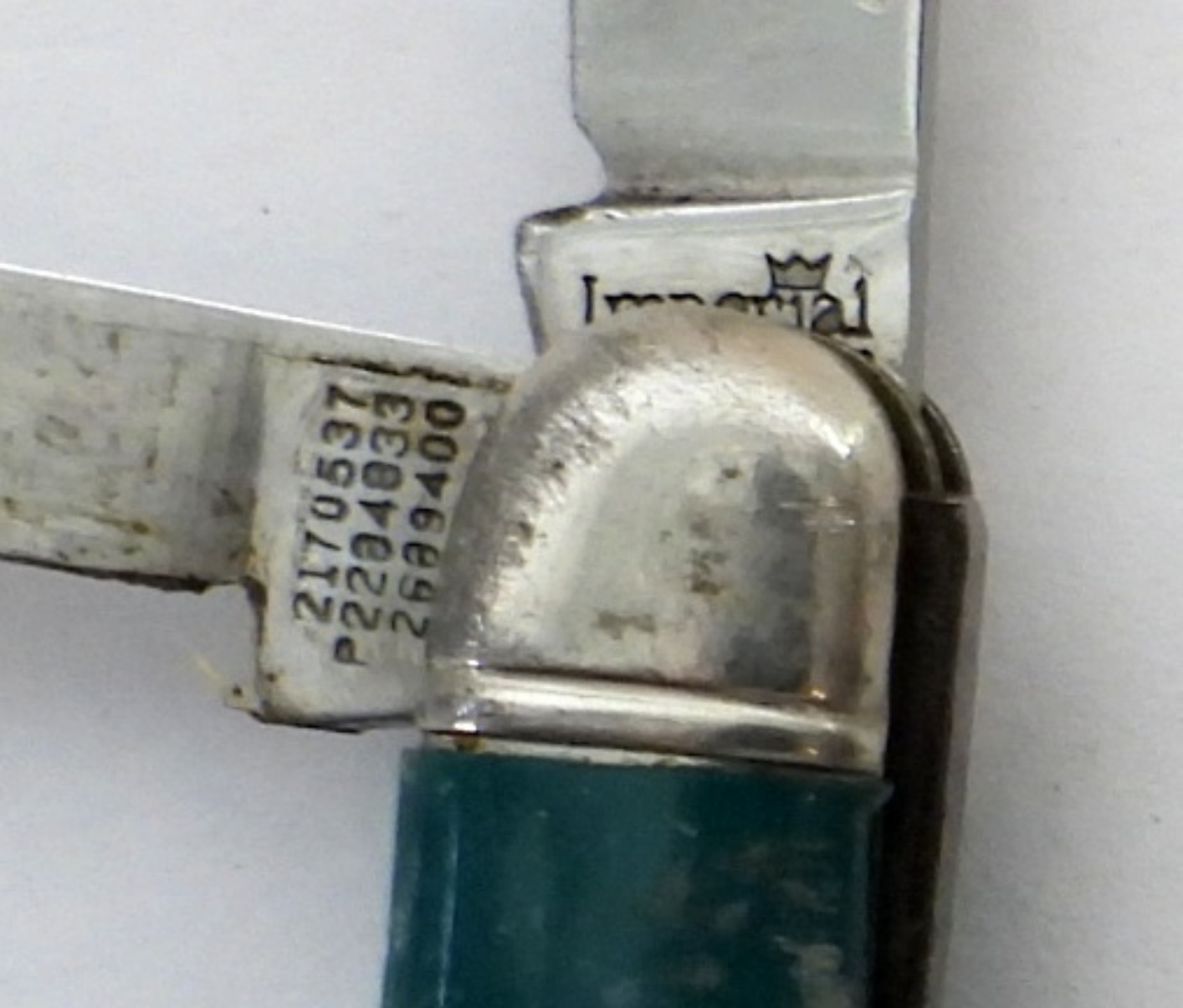 (2)VINTAGE IMPERIAL 2 BLADE POCKET KNIFE. TEAL AND WHITE HANDLE 2″ BLADE(2170537) AND A GREEN HANDLE (2170537)