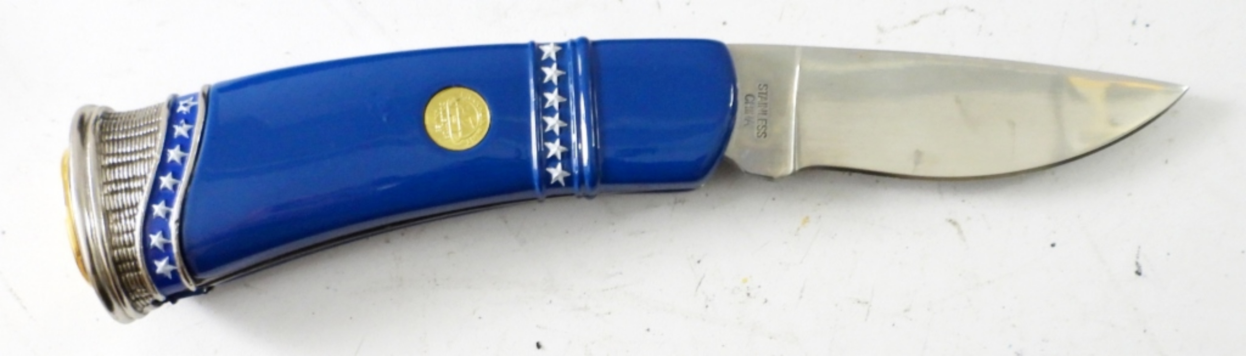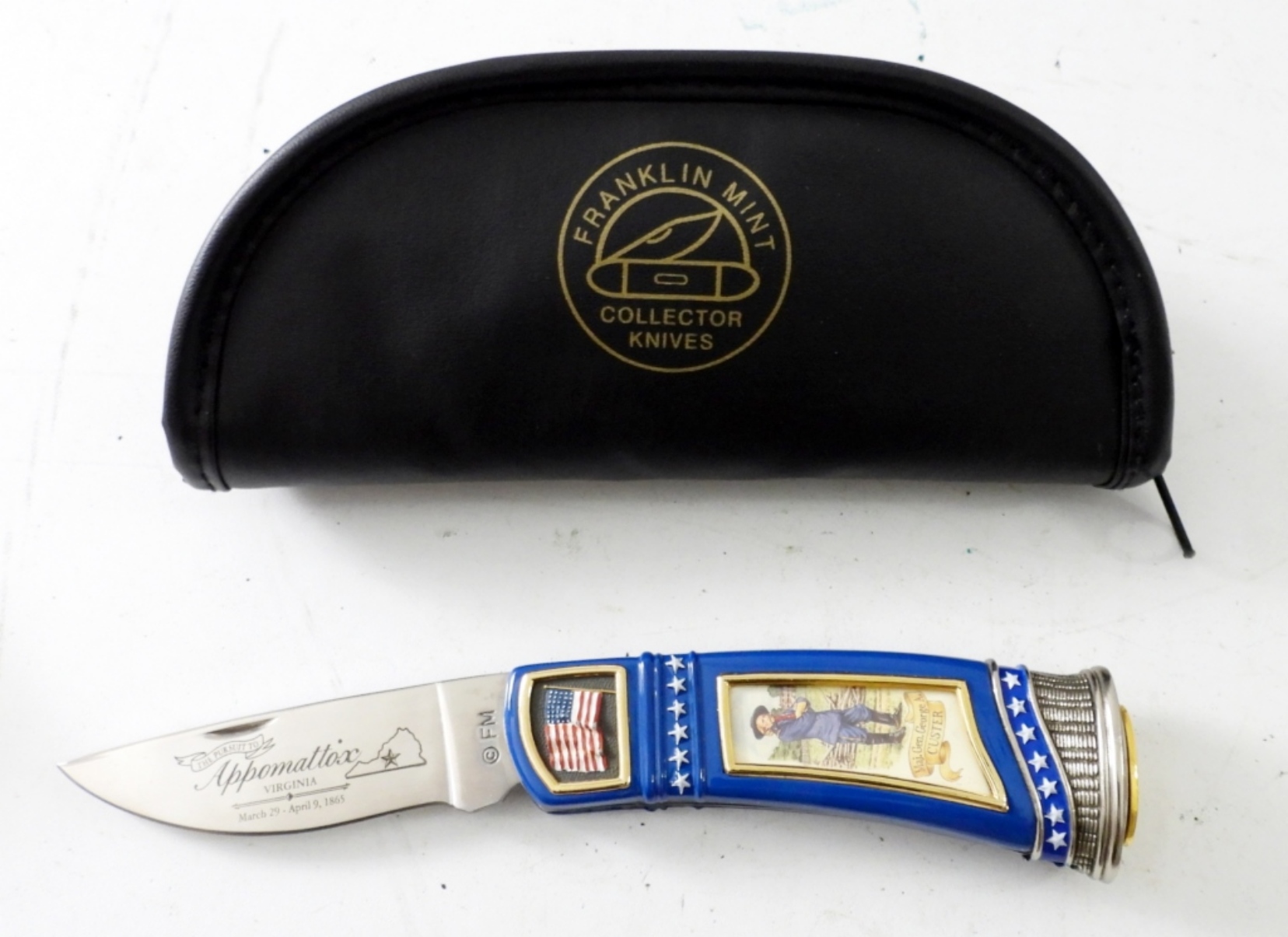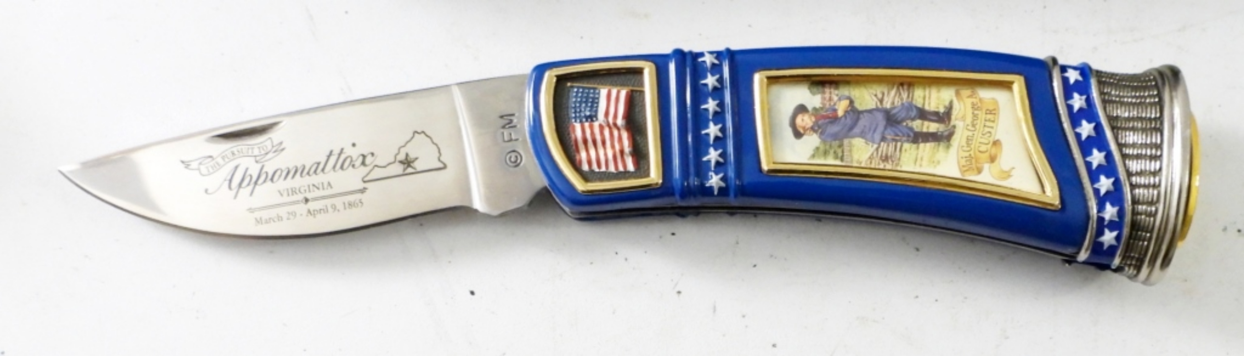 FRANKLIN MINT THE PURSUIT TO APPOMATTOX VIRGINIA MAG.GEN. GEORGE A. CUSTER COLLECTORS KNIFE AND POUCH. BLUE HANDLE WITH GOLD & SILVER TONE .