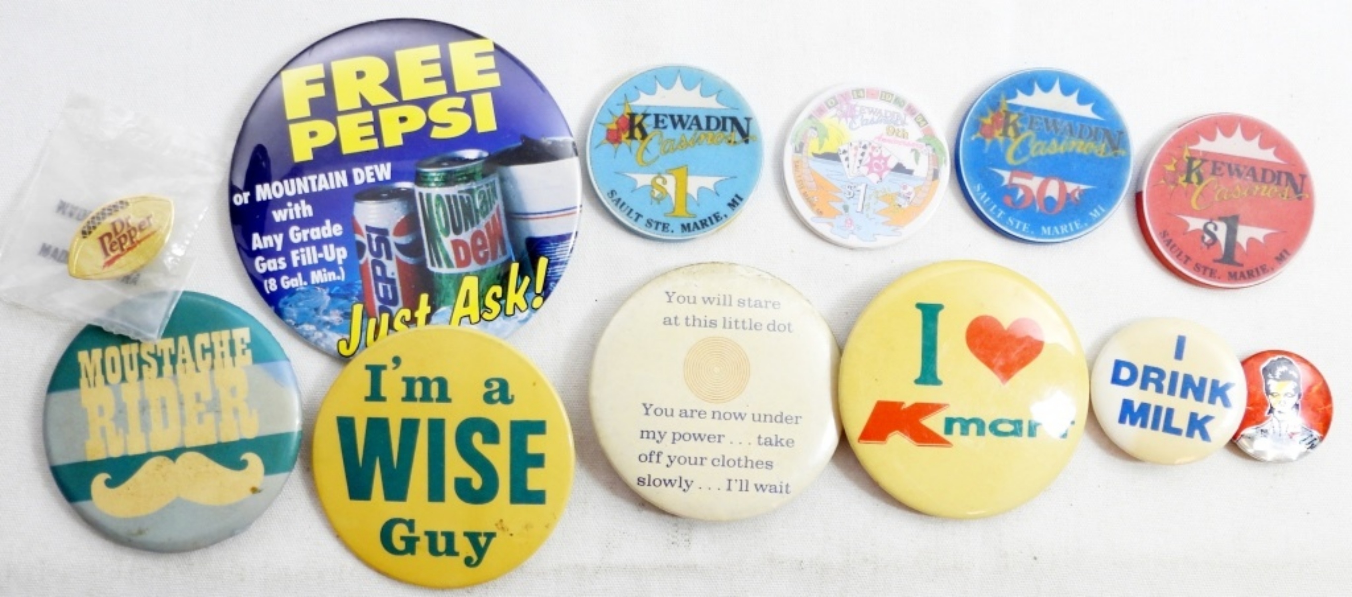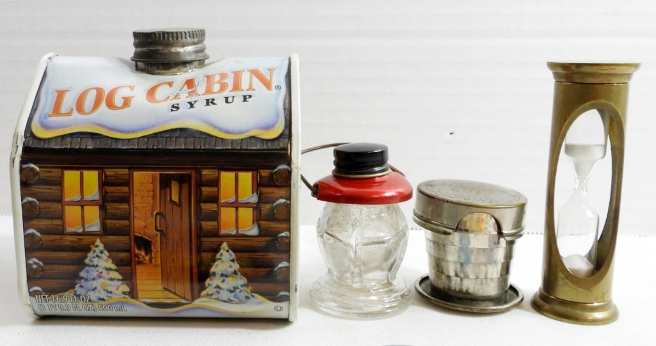ASSORTED VINTAGE LOT OF TRINKETS. VEST POCKET CUP, BRASS HOURGLASS TIMER, PINS AND MORE