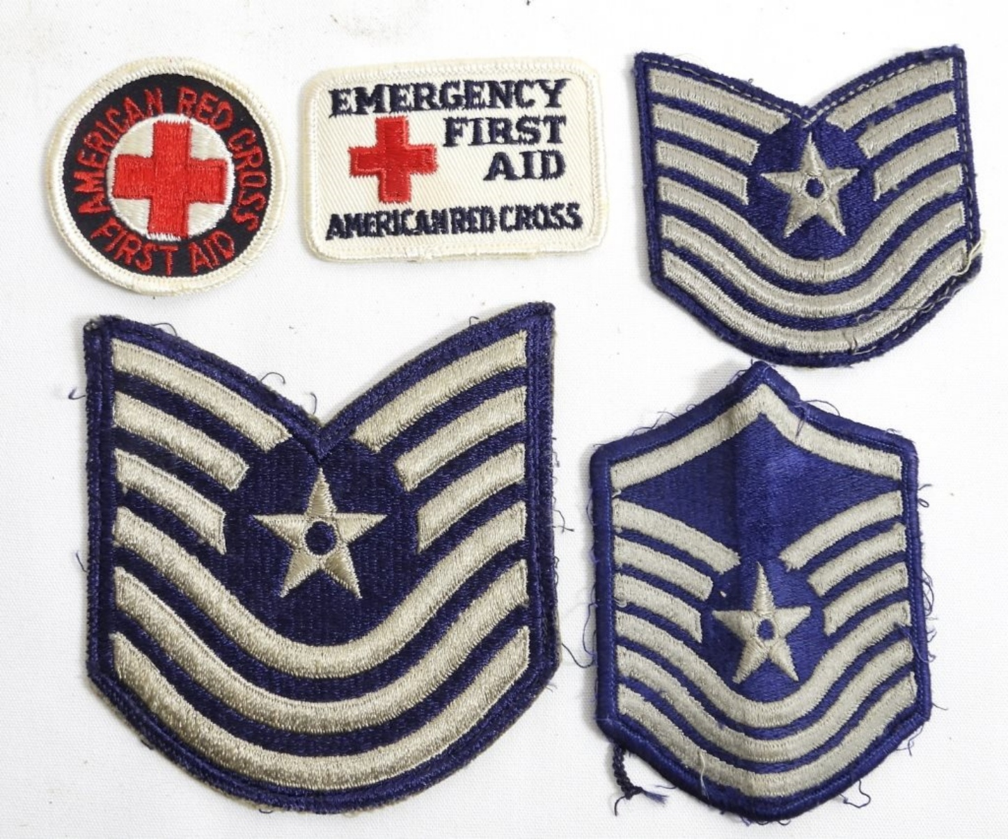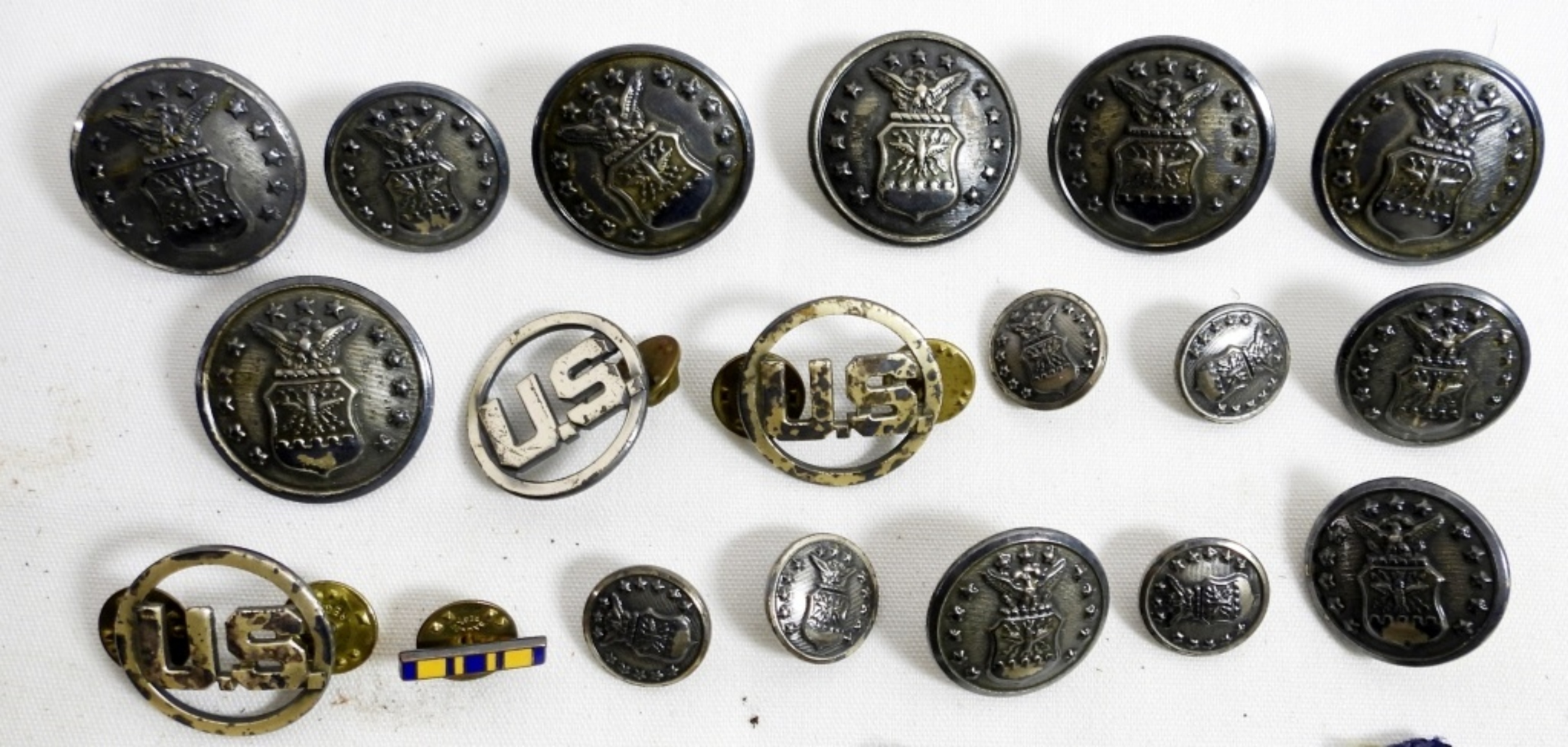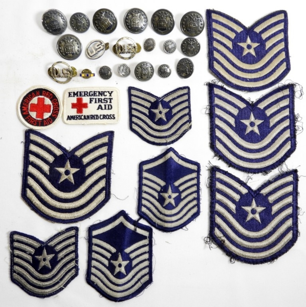 (4) LARGE CHEVRON/STAR PATCHES (4) SMALL PATCHES, (6) LARGE BUTTONS w/PILOT WINGS & LIGHTING BOLTS, (4) MEDIUM BUTTONS (5) SMALL BUTTONS, (3) U.S. PINS & MORE