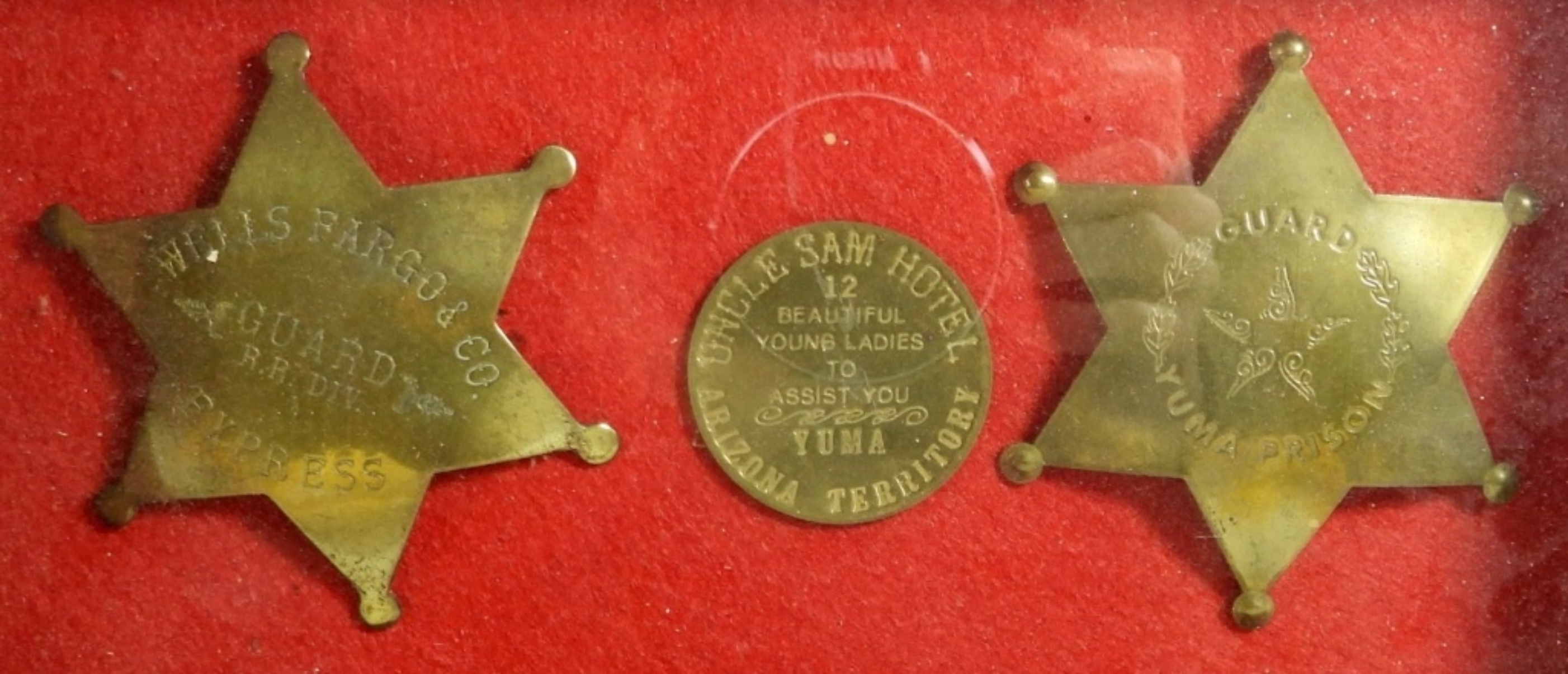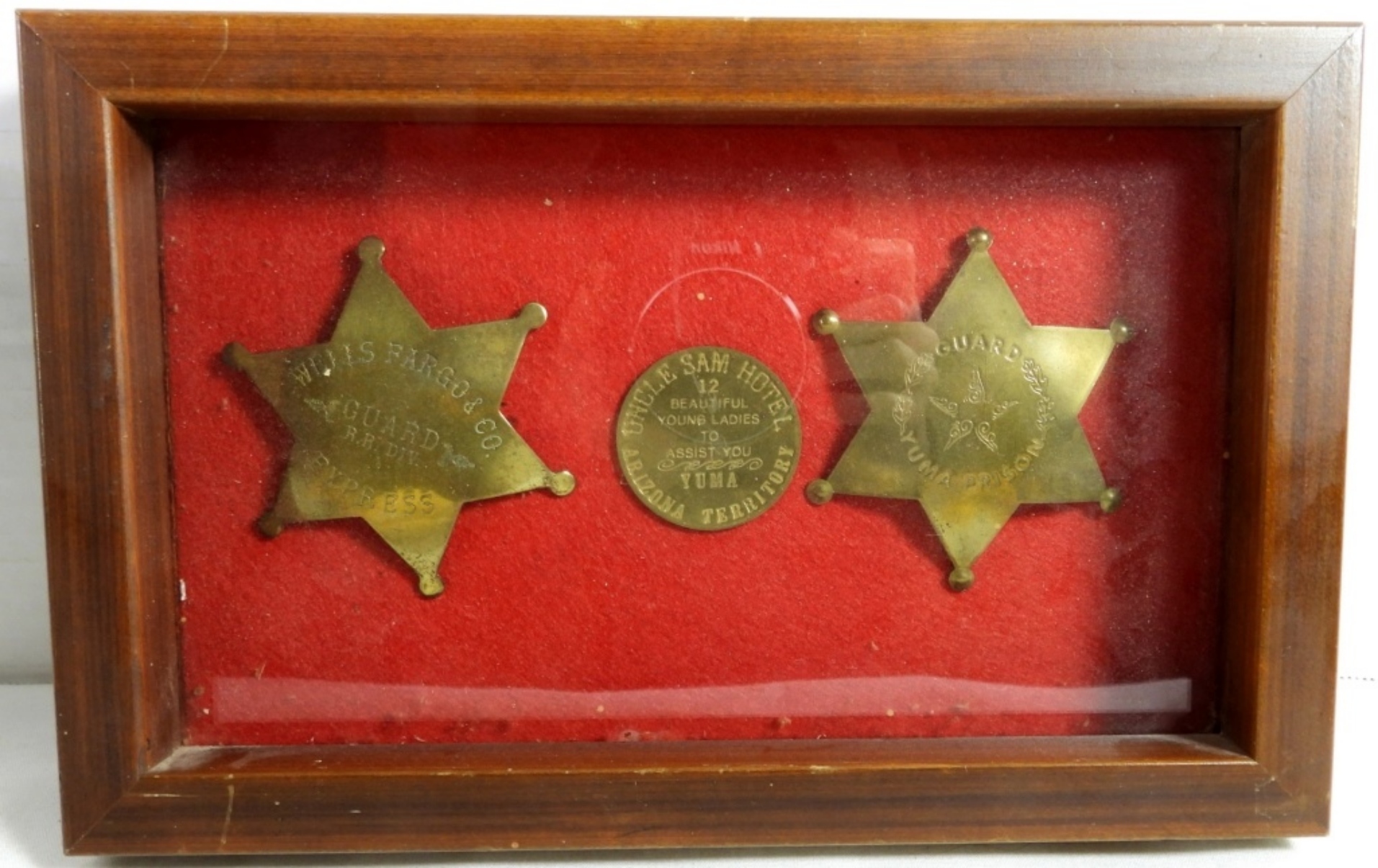 EXPRESS GUARD BADGE plus UNCLE SAM HOTEL YUMA TOKEN in COLLECTORS DISPLAY CASE