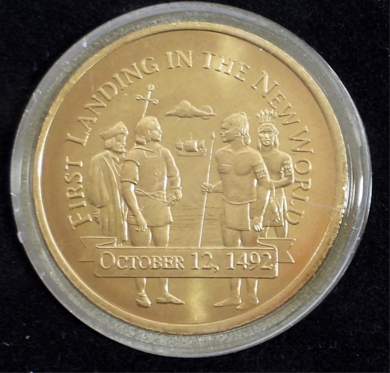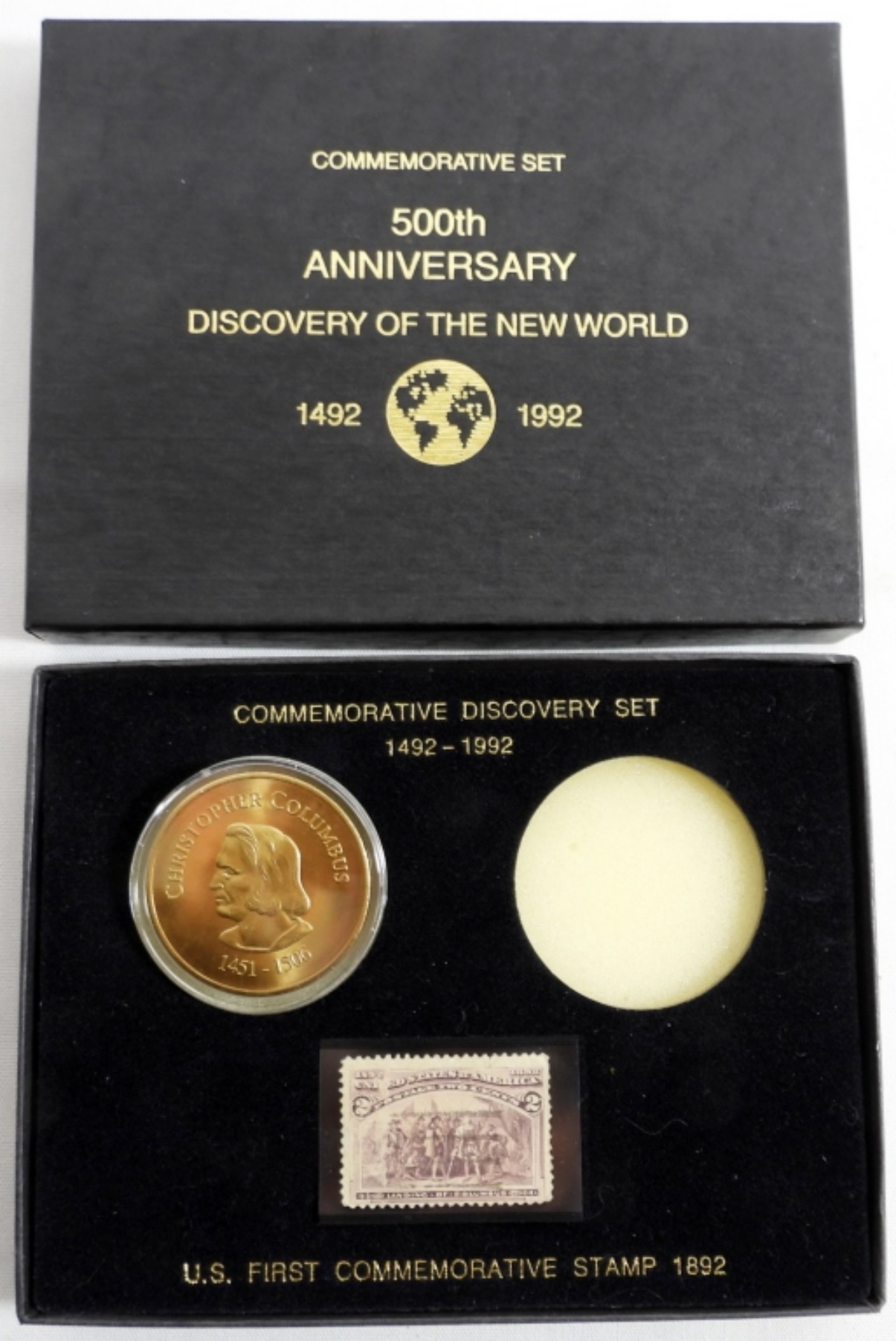 COMMEMORATIVE DISCOVERY SET 1492-1992, WITH U.S. FIRST COMMEMORATIVE 1892 STAMP. IN ORIGINAL BOX ( MISSING 1 COIN )