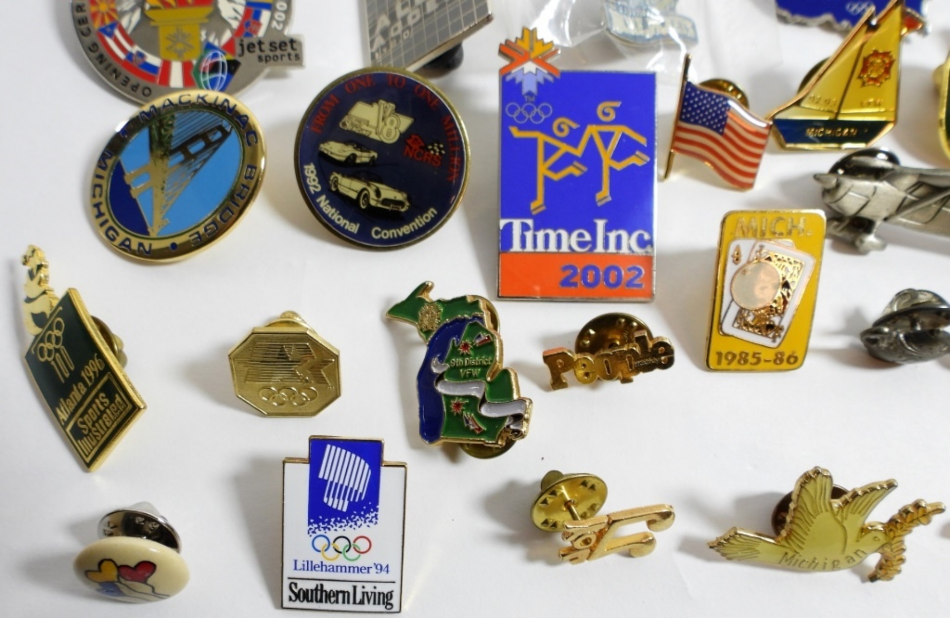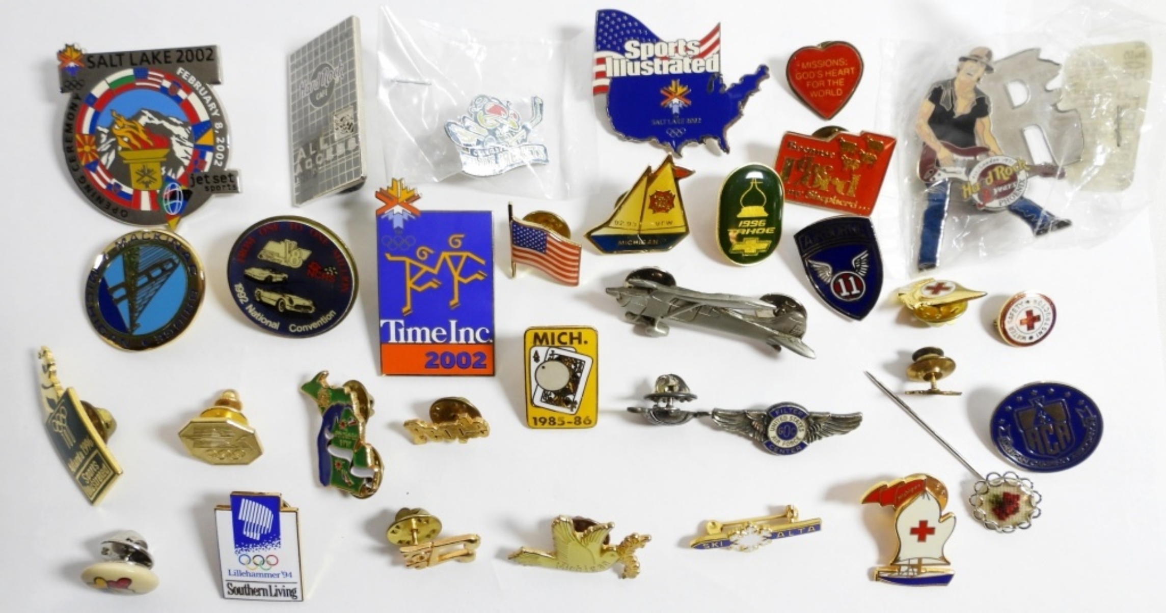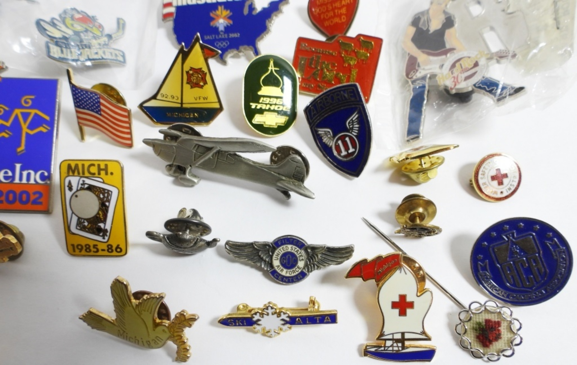 (32) VINTAGE ASSORTED PINS ,HARDROCK , MILITARY & MORE