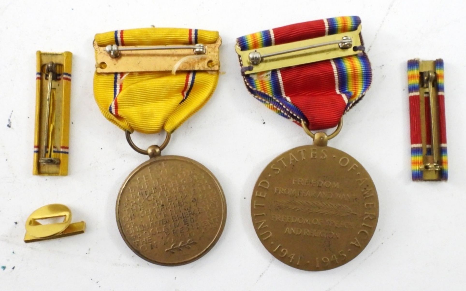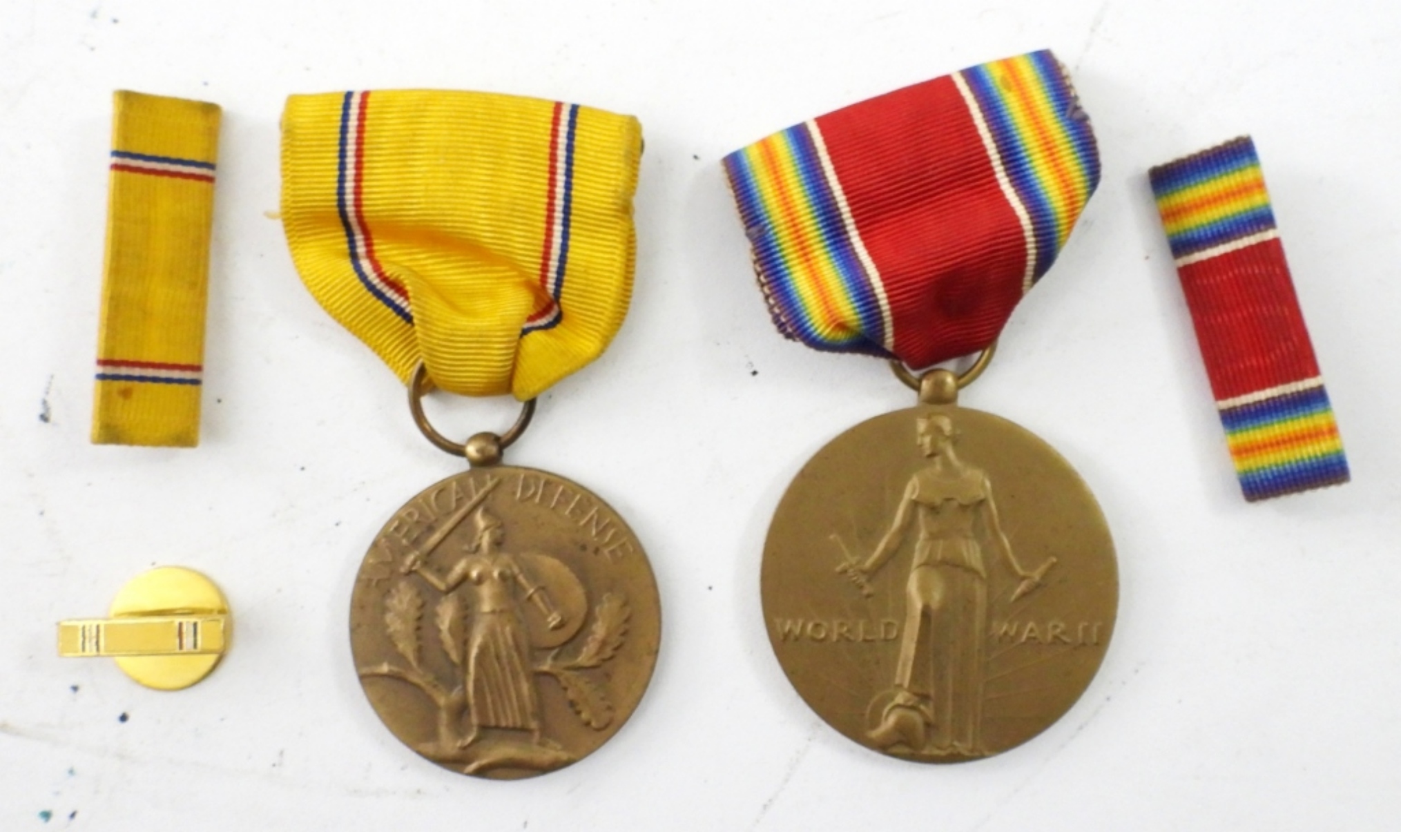 (2) WWII MEDALS , VICTORY MEDAL WITH BAR RIBBON AND AMERICAN DEFENCE SERVICE MEDAL ,RIBBON BAR & PIN