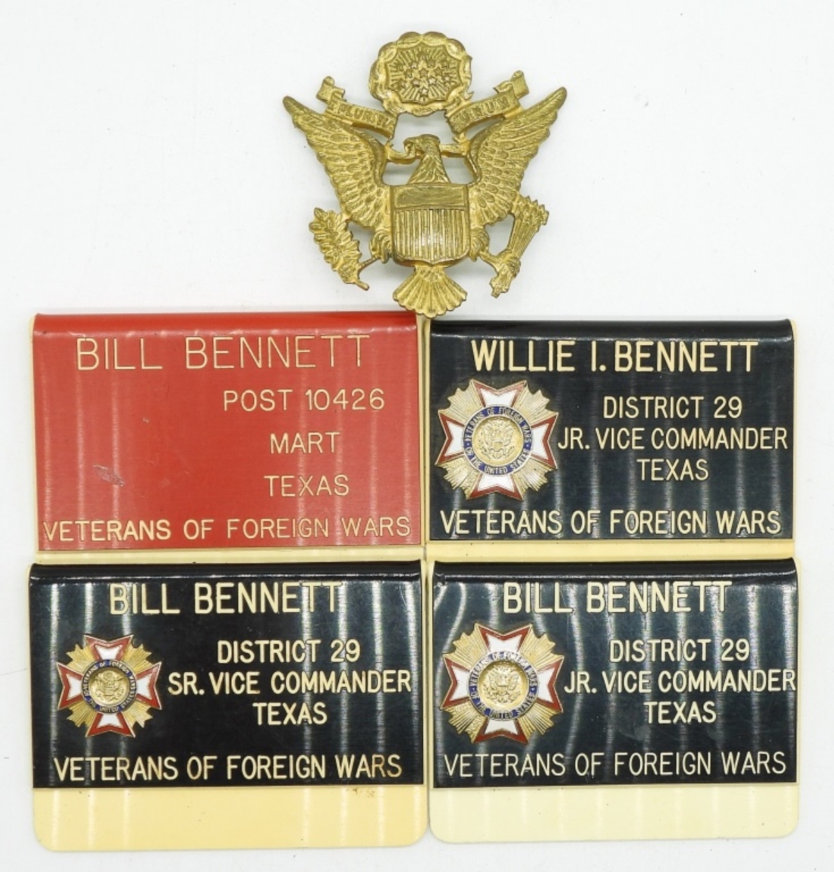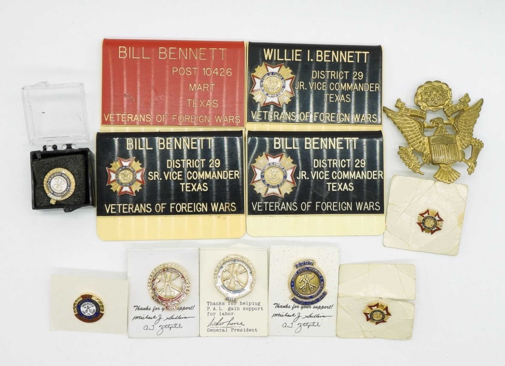 4 BADGES “JR/SR VICE COMMANDER VETERANS OF FOREIGN WARS. 5 SHEET METAL WORKERS INTERNATION ASSOC PINS. 2 SMALL VETS OF FOREIGN WARS PINS.